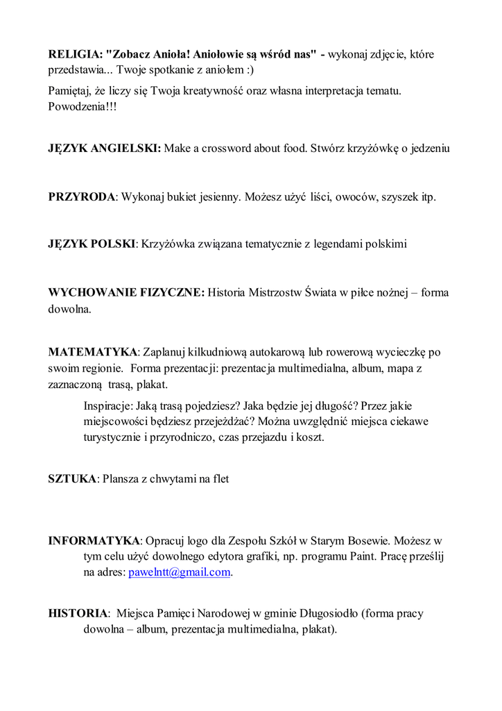 RELIGIA: "Zobacz Anioła! Aniołowie są wśród nas" - wykonaj zdjęcie, które przedstawia... Twoje spotkanie z aniołem :) Pamiętaj, że liczy się Twoja kreatywność oraz własna interpretacja tematu. Powodzenia!!! JĘZYK ANGIELSKI: Make a crossword about food. Stwórz krzyżówkę o jedzeniu PRZYRODA: Wykonaj bukiet jesienny. Możesz użyć liści, owoców, szyszek itp. JĘZYK POLSKI: Krzyżówka związana tematycznie z legendami polskimi WYCHOWANIE FIZYCZNE: Historia Mistrzostw Świata w piłce nożnej – forma dowolna. MATEMATYKA: Zaplanuj kilkudniową autokarową lub rowerową wycieczkę po swoim regionie. Forma prezentacji: prezentacja multimedialna, album, mapa z zaznaczoną trasą, plakat. Inspiracje: Jaką trasą pojedziesz? Jaka będzie jej długość? Przez jakie miejscowości będziesz przejeżdżać? Można uwzględnić miejsca ciekawe turystycznie i przyrodniczo, czas przejazdu i koszt. SZTUKA: Plansza z chwytami na flet INFORMATYKA: Opracuj logo dla Zespołu Szkół w Starym Bosewie. Możesz w tym celu użyć dowolnego edytora grafiki, np. programu Paint. Pracę prześlij na adres: [email protected]. HISTORIA: Miejsca Pamięci Narodowej w gminie Długosiodło (forma pracy dowolna – album, prezentacja multimedialna, plakat).