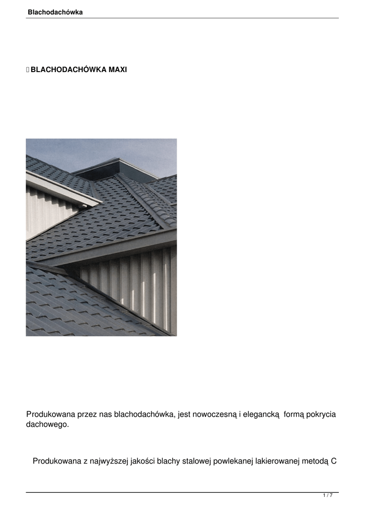 Blachodachówka BLACHODACHÓWKA MAXI Produkowana przez nas blachodachówka, jest nowoczesną i elegancką formą pokrycia dachowego. Produkowana z najwyższej jakości blachy stalowej powlekanej lakierowanej metodą C 1/7 Blachodachówka OIL COATING na specjal nych liniach produkcyjnych z zachowaniem procesu ciągłego, w którym następnie polakierowana powierzchnia jest utwardzana przez wypalenie uzyskujemy w ten sposób wysoką sztywność arkusza i oporność nawet na najskrajniejsze warunki atmosferyczne. Dzięki zastosowaniu głębokiego profilu tłoczenia blachy ( 35mm) i wysokiego przetłoczenia (17 mm) uzyskujemy możliwość stosowania pokrycia na dachach o małym spadku ( minimum 14%). Ponadto dzięki takiemu profilowaniu blachodachówki nadajemy jej klasyczny i elegancki wygląd 2/7 Blachodachówka WYMIARY: - Szerokości arkusza 1160 mm 1008 mm - 3/7 Blachodachówka Szerokości krycia 1008 mm 930 mm - Długość : wedle życzenia klienta - wysokość tłocznika 17 mm - grubość rdzenia stalowego 0,5 mm Blachodachówkę produkujemy w 4 długościach fali (modułach) : - A-40 cm - B-35 cm - C-30 cm - D-25 cm 4/7 Blachodachówka CECHY DODATKOWE Długie i żmudne badania zachowania się blachodachówki podczas intensywnych opadów, zalegania topniejącego ściegu , skraplania się pary wodnej pozwoliły nam na dopracowanie naszego profilu w najdrogocenniejszy szczegółach.. Mając na względzie że te szczegóły właśnie są kluczem do prawidłowego funkcjonowania pokrycia w trudnych warunkach atmosferycznych , wprowadziliśmy szereg dodatkowych elementów profilu: 5/7 Blachodachówka - Rowek odwadniający zapobiegający przelaniu się skroplonej pary wodnej przez grzbiet skrajnej fali. Na końcu każdej fali dodatkowe przetłoczenie odprowadzające wodę z rowka z powrotem na połać. - Grzbiet kończący arkusz którego zadaniem jest nie dopuścić do przeciekania połaci w przypadku np. cofania się wody, niedokładnego spasowania arkuszy lub uszkodzeń obróbek dekarskich. Odprowadza również powstała wodę podczas parowania skroplin nagromadzonych na foli paro-przepuszczalnej . - Zamki zamykające fale są zaprojektowane w taki sposób by dawały lekką regulacje kąta całego arkusza w stosunku do poprzedniego . Daje to możliwość skorygowania niedokładności wykonania konstrukcji dachu i nawet przy „falowaniu duch” pozwala na idealne połączenie arkuszy. Elementy te są umieszczone w takim miejscu blachy by przykrył je zakład następnego arkusza co powoduje że swoją funkcje spełniają nie zakłócając estetycznego wyglądu jednolitej połaci. 6/7 Blachodachówka 7/7