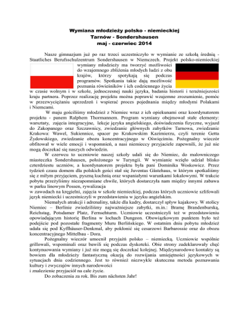 Wymiana młodzieży polsko - niemieckiej Tarnów - Sondershausen maj - czerwiec 2014 Nasze gimnazjum już po raz trzeci uczestniczyło w wymianie ze szkołą średnią Staatliches Berufsschulzentrum Sondershausen w Niemczech. Projekt polsko-niemieckiej wymiany młodzieży ma tworzyć możliwości do wzajemnego zbliżenia młodych ludzi z obu krajów, którzy spotykają się podczas programów. Spotkania takie dają możliwość poznania rówieśników i ich codziennego życia w czasie wolnym i w szkole, jednoczesnej nauki języka, badania historii i teraźniejszości kraju partnera. Poprzez realizację projektu można poprawić wzajemne zrozumienie, pomóc w przezwyciężaniu uprzedzeń i wspierać proces pojednania między młodymi Polakami i Niemcami. W maju gościliśmy młodzież z Niemiec wraz z ich opiekunami oraz koordynatorem projektu - panem Ralphem Thormannem. Program wymiany obejmował stałe elementy: warsztaty, zajęcia integracyjne, lekcje języka angielskiego, doświadczenia fizyczne, wyjazd do Zakopanego oraz Szczawnicy, zwiedzanie głównych zabytków Tarnowa, zwiedzanie Krakowa: Wawel, Sukiennice, spacer po Krakowskim Kazimierzu, czyli terenie Getta Żydowskiego, zwiedzanie obozu koncentracyjnego w Oświęcimiu. Pożegnalny wieczór obfitował w wiele emocji i wspomnień, a nasi niemieccy przyjaciele zapewnili, że już nie mogą doczekać się naszych odwiedzin. W czerwcu to uczniowie naszej szkoły udali się do Niemiec, do malowniczego miasteczka Sondershausen, położonego w Turyngii. W wymianie wzięło udział blisko czterdziestu uczniów, a koordynatorem projektu była pani Dominika Woskowicz. Przez tydzień czasu domem dla polskich gości stał się Juventas Gästehaus, w którym spotkaliśmy się z miłym przyjęciem, pyszną kuchnią oraz wspaniałymi warunkami lokalowymi. W trakcie pobytu przeżyliśmy niezapomniane chwile, których dostarczyła nam między innymi zabawa w parku linowym Possen, rywalizacja w zawodach na kręgielni, zajęcia w szkole niemieckiej, podczas których uczniowie szlifowali język niemiecki i uczestniczyli w przedstawieniu w języku angielskim. Niemałych atrakcji i adrenaliny, także dla kadry, dostarczył spływ kajakowy. W stolicy Niemiec – Berlinie zwiedziliśmy najważniejsze zabytki, m.in.: Bramę Brandenburską, Reichstag, Potsdamer Platz, Fernsehturm. Uczniowie uczestniczyli też w przedstawieniu opowiadającym historię Berlina w lochach Dungeon. Obowiązkowym punktem było też podejście pod pozostałe fragmenty Muru Berlińskiego. W ostatnim dniu pobytu młodzież udała się pod Kyffhäuser-Denkmal, aby pokłonić się cesarzowi Barbarossie oraz do obozu koncentracyjnego Mittelbau - Dora. Pożegnalny wieczór umocnił przyjaźń polsko – niemiecką. Uczniowie wspólnie grillowali, wspominali oraz bawili się podczas dyskoteki. Obie strony zadeklarowały chęć kontynuowania wymiany i już nie mogą się doczekać kolejnej. Międzynarodowe kontakty są bowiem dla młodzieży fantastyczną okazją do rozwijania umiejętności językowych w sytuacjach dnia codziennego. Jest to również niezwykle skuteczna metoda poznawania kultury i zwyczajów innych narodowości i znalezienie przyjaciół na całe życie. Do zobaczenia za rok. Bis zum nächsten Jahr!