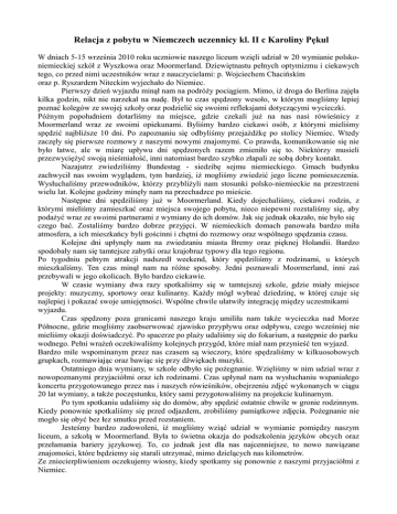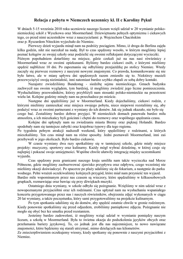 Relacja z pobytu w Niemczech uczennicy kl. II c Karoliny Pękul W dniach 5-15 września 2010 roku uczniowie naszego liceum wzięli udział w 20 wymianie polskoniemieckiej szkół z Wyszkowa oraz Moormerland. Dziewiętnastu pełnych optymizmu i ciekawych tego, co przed nimi uczestników wraz z nauczycielami: p. Wojciechem Chacińskím oraz p. Ryszardem Niteckim wyjechało do Niemiec. Pierwszy dzień wyjazdu minął nam na podróży pociągiem. Mimo, iż droga do Berlina zajęła kilka godzin, nikt nie narzekał na nudę. Był to czas spędzony wesoło, w którym mogliśmy lepiej poznać kolegów ze swojej szkoły oraz podzielić się swoimi refleksjami dotyczącymi wycieczki. Późnym popołudniem dotarliśmy na miejsce, gdzie czekali już na nas nasi rówíeśnicy z Moormerland wraz ze swoimi opiekunami. Byliśmy bardzo ciekawi osób, z którymi mieliśmy spędzić najbliższe 10 dni. Po zapoznaniu się odbyliśmy przejażdżkę po stolicy Niemiec. Wtedy zaczęły się pierwsze rozmowy z naszymi nowymi znajomymi. Co prawda, komunikowanie się nie było łatwe, ale w miarę upływu dni spędzonych razem zmieniło się to. Niektórzy musieli przezwyciężyć swoją nieśmiałość, inni natomiast bardzo szybko złapali ze sobą dobry kontakt. Nazajutrz zwiedziliśmy Bundestag - siedzibę sejmu niemieckiego. Gmach budynku zachwycił nas swoim wyglądem, tym bardziej, iż mogliśmy zwiedzić jego liczne pomieszczenia. Wysłuchaliśmy przewodników, którzy przybliżyli nam stosunki polsko-niemieckie na przestrzeni wielu lat. Kolejne godziny minęły nam na przechadzce po mieście. Następne dni spędziliśmy już w Moormerland. Kiedy dojechaliśmy, ciekawi rodzin, z którymi mieliśmy zamieszkać oraz miejsca swojego pobytu, nieco niepewni rozstaliśmy się, aby podażyć wraz ze swoimi partnerami z wymiany do ich domów. Jak się jednak okazało, nie było się czego bać. Zostaliśmy bardzo dobrze przyjęci. W niemieckich domach panowała bardzo miła atmosfera, a ich mieszkańcy byli gościnni i chętni do rozmowy oraz wspólnego spędzania czasu. Kolejne dni upłynęły nam na zwiedzaniu miasta Bremy oraz pięknej Holandii. Bardzo spodobały nam się tamtejsze zabytki oraz krajobraz typowy dla tego regionu. Po tygodniu pełnym atrakcji nadszedł weekend, który spędziliśmy z rodzinami, u których mieszkaliśmy. Ten czas minął nam na różne sposoby. Jedni poznawali Moormerland, inni zaś przebywali w jego okolicach. Było bardzo ciekawie. W czasie wymiany dwa razy spotkaliśmy się w tamtejszej szkole, gdzie miały miejsce projekty: muzyczny, sportowy oraz kulinarny. Każdy mógł wybrać dziedzinę, w której czuje się najlepiej i pokazać swoje umiejętności. Wspólne chwile ułatwiły integrację między uczestnikami wyjazdu. Czas spędzony poza granicami naszego kraju umiliła nam także wycieczka nad Morze Północne, gdzie mogliśmy zaobserwować zjawisko przypływu oraz odpływu, czego wcześniej nie mieliśmy okazji doświadczyć. Po spacerze po plaży udaliśmy się do fokarium, a następnie do parku wodnego. Pełni wrażeń oczekiwaliśmy kolejnych przygód, które miał nam przynieść ten wyjazd. Bardzo mile wspominanym przez nas czasem są wieczory, które spędzaliśmy w kilkuosobowych grupkach, rozmawiając oraz bawiąc się przy dźwiękach muzyki. Ostatniego dnia wymiany, w szkole odbyło się pożegnanie. Wzięliśmy w nim udzial wraz z nowopoznanymi przyjaciółmi oraz ich rodzinami. Czas upłynał nam na wysłuchaniu wspaniałego koncertu przygotowanego przez nas i naszych rówieśników, obejrzeniu zdjęć wykonanych w ciągu 20 lat wymiany, a także poczęstunku, który sami przygotowaliśmy na projekcie kulinarnym. Po tym spotkaniu udaliśmy się do domów, aby spędzić ostatnie chwile w gronie rodzinnym. Kiedy ponownie spotkaliśmy się przed odjazdem, zrobiliśmy pamiątkowe zdjęcia. Pożegnanie nie mogło się obyć bez łez smutku przed rozstaniem. Jesteśmy bardzo zadowoleni, iż mogliśmy wziąć udział w wymianie pomiędzy naszym liceum, a szkołą w Moormerland. Była to świetna okazja do podszkolenia języków obcych oraz przełamania bariery językowej. To, co jednak jest dla nas najcenniejsze, to nowo nawiązane znajomości, które będziemy się starali utrzymać, mimo dzielących nas kilometrów. Ze zniecierpliwieniem oczekujemy wiosny, kiedy spotkamy się ponownie z naszymi przyjaciółmi z Niemiec.