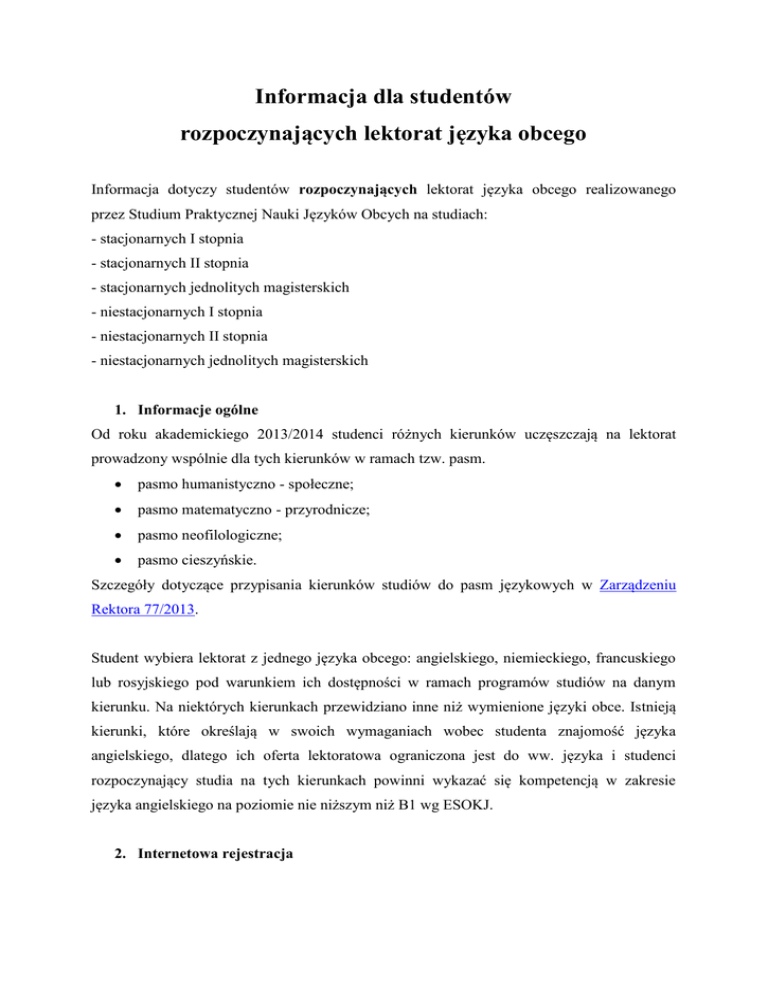 Informacja dla studentów rozpoczynających lektorat języka obcego