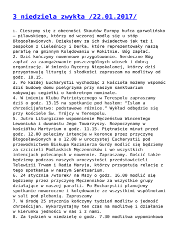 3 niedziela zwykła /22.01.2017/ 1. Cieszymy się z obecności Skautów Europy hufca garwolińsko – pilawskiego, którzy od wczoraj modlą się u stóp Błogosławionych. Dziękujemy za ich świadectwo jak też i zespołom z Cieleśnicy i Derła, które reprezentowały naszą parafię na gminnym Kolędowaniu w Rokitnie. Bóg zapłać. 2. Dziś kończymy nowennowe przygotowanie. Serdeczne Bóg zapłać za zaangażowanie poszczególnych wiosek i dobrą organizację. W imieniu Rycerzy Niepokalanej, którzy dziś przygotowują liturgię i słodkości zapraszam na modlitwy od godz. 18.15. 3. Po każdej Eucharystii wychodząc z kościoła możemy wspomóc dziś budowę domu pielgrzyma przy naszym sanktuarium nabywając cegiełki o konkretnym nominale. 4. W imieniu Klubu Patriotycznego w Terespolu zapraszamy dziś o godz. 13.15 na spotkanie pod hasłem: “Islam a chrześcijaństwo: podstawowe różnice.” Wykład odbędzie się przy kościele Św. Trójcy w Terespolu. 5. Jutro Liturgiczne wspomnienie Męczeństwa Wincentego Lewoniuka i dwunastu Jego Towarzyszy. Rozpoczynamy w kościółku Martyrium o godz. 11.15. Piętnaście minut przed godz. 12.00 polecimy intencje w koronce przez przyczynę Błogosławionych a o 12.00 w uroczystej Eucharystii pod przewodnictwem Biskupa Kazimierza Gurdy modlić się będziemy za czcicieli Podlaskich Męczenników i we wszystkich intencjach polecanych w nowennie. Zapraszamy. Gościć także będziemy podczas naszych uroczystości przedstawicieli Telewizji Trwam i Radia Maryja, którzy przygotują relację z tego spotkania w naszym Sanktuarium. 6. 24 stycznia /wtorek/ na Mszy o godz. 16.00 modlić się będziemy przez przyczynę Męczenników za wszystkie grupy działające w naszej parafii. Po Eucharystii planujemy spotkanie noworoczne i kolędowanie ze wszystkimi wspólnotami w sali pod plebanią. Zapraszamy 7. W środę 25 stycznia kończymy tydzień modlitw o jedność chrześcijan. Wykorzystajmy ten czas na modlitwę i działanie w kierunku jedności w nas i z nami. 8. Za tydzień w niedzielę o godz. 7.30 modlitwa wypominkowa – /kartki z Łęg/, w kaplicy o godz. 10.00 9. Prasa katolicka: Echo Katolickie i Tygodnik Niedziela wyłożone są na stoliku- polecamy 10. W ubiegłym tygodniu obchodziliśmy imieniny Mariusza – na ręce pana Organisty wszystkim Mariuszom oraz solenizantom i jubilatom rozpoczynającego się tygodnia życzymy, by przez przyczynę błogosławionych Męczenników Podlaskich oraz orędownictwo Maryi, Bóg im błogosławił, obdarzał zdrowiem i swymi łaskami. 11. Polecajmy także zmarłych, którzy oczekują na miłosierdzie Boże, szczególnie modląc się za śp. Dionizym Kraciukiem z Woroblina, którego pochowaliśmy w ubiegłym tygodniu. Pobożność Maryjna – temat VIII dnia nowenny Przedostatnie spotkanie nowennowe zgromadziło w Sanktuarium Pratulińskim liczne grono rozmodlonych pielgrzymów. Spotkanie rozpoczęła koronka przez przyczynę błogosławionych Unitów. Przed Eucharystią zostały pobłogosławione dary, które biskup pomocniczy diecezji siedleckiej Piotr Sawczuk ofiarował dla sanktuarium /haftowana ręcznie struła z męczennikami oraz głęboka patena/. Pod przewodnictwem Biskupa Piotra kapłani zgromadzeni przy ołtarzu i wierni w świątyni celebrowali Eucharystię. Zebrani w słowie skierowanym przez biskupa pomocniczego usłyszeli, że każdy dzień nowenny podprowadza nas coraz bliżej ku tajemnicy tego świętego miejsca, gdzie 143 lata temu świeccy ludzie oddali swoje życie za wiarę. Ukazując zaś współczesną postawę człowieka – letniość wielu chrześcijan – kaznodzieja wskazał na postawę, której współczesny świat nie rozumie, bo nie mając Boga nie ma nadprzyrodzonych motywacji. To Jezus powiedział Ja jestem drogą – i w ten sposób dał drogowskaz, w którym człowiek – tak jak Maryja staje się szczęśliwy w tajemnicy swej wiary.Tak rozumieli swoją misję Unici – wierni Bogu, Kościołowi i Jego Matce. Niech ta, która była mocą pratulińskich Unitów idących na śmierć, pomoże i nam oddać swoje życie Bogu i wszystkie życiowe sprawy układać według Ewangelii – zakończył biskup. Licznie przyjęta komunia to odpowiedź na przeżycie słowa, wiary i ofiary na wzór męczenników podlaskich. Ona też sprawiła, że modlitwa nowennowa tego wieczoru stała się jeszcze bardziej wymowna i pełniejsza. Na zakończenie tradycyjnie zebrani mieli możliwość ucałowania relikwii, a babcie i dziadkowie z okazji ich święta otrzymali słodkie babeczki przygotowane przez parafian. Serdeczne zaproszenie popłynęło także od Kustosza w imieniu wszystkich członków Parafialnego Oddziału Koła Przyjaciół Katolickiego Radia Podlasie, który przygotował słodki poczęstunek do którego wszyscy zostali zaproszeni. Akcja Katolicka diec. siedleckiej u stóp swoich patronów Pierwszą oficjalną zarejestrowaną pielgrzymką do Sanktuarium Błogosławionych Męczenników Podlaskich jest grupa Akcji Katolickiej diecezji siedleckiej. Każdego roku w sobotę poprzedzającą liturgiczne wspomnienie Męczeństwa Unitów Podlaskich przedstawiciele oddziałów parafialnych Akcji Katolickiej gromadzą się na swoim skupieniu przy swoich patronach w Pratulinie. Zawiązanie wspólnoty, katecheza, modlitwa różańcowa i zawierzenie się Męczennikom oraz zbierająca wszystkie sprawy i jednocząca w ofiarę Zbawiciela Eucharystia to niezmienny program spotkania członków Akcji Katolickiej. 21.01.2017r. od godz. 10.00 też tak było. Katecheza Ks. Wojciecha – asystenta diecezjalnego i modlitwa różańcowa prowadzona przez niego to przedsmak doświadczenia Bożej miłości jaką w Eucharystii pod przewodnictwem Biskupa Pomocniczego diecezji siedleckiej Piotra Sawczuka w gronie kapłanów przeżywali przybyli na doroczne swoje święto członkowie Akcji Katolickiej diecezji siedleckiej. Fotki z tego spotkania prezentujemy poniżej – dziękując wszystkim, którzy nas odwi