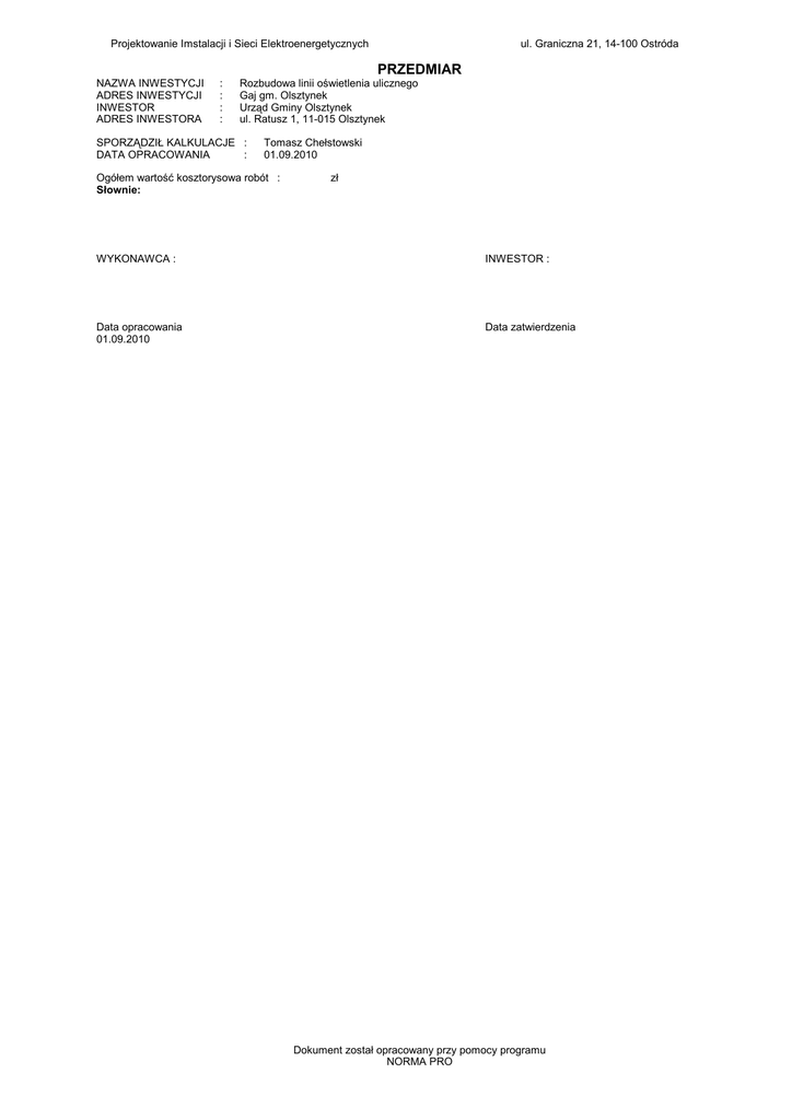 Projektowanie Imstalacji i Sieci Elektroenergetycznych ul. Graniczna 21, 14-100 Ostróda PRZEDMIAR NAZWA INWESTYCJI ADRES INWESTYCJI INWESTOR ADRES INWESTORA : : : : Rozbudowa linii oświetlenia ulicznego Gaj gm. Olsztynek Urząd Gminy Olsztynek ul. Ratusz 1, 11-015 Olsztynek SPORZĄDZIŁ KALKULACJE : DATA OPRACOWANIA : Tomasz Chełstowski 01.09.2010 Ogółem wartość kosztorysowa robót : Słownie: zł WYKONAWCA : INWESTOR : Data opracowania 01.09.2010 Data zatwierdzenia Dokument został opracowany przy pomocy programu NORMA PRO oświetlenie gaj.KST KSIĄŻKA PRZEDMIARÓW Lp. Podst Opis i wyliczenia 1 Prace liniowe 1 KNNR 5 Montaż i stawianie słupów oświetleniowych o masie ŻN d.1 1001-02 7 2 KNNR 5 d.1 0905-01 j.m. Poszcz szt. szt. Montaż przewodów izolowanych linii napowietrznej nn typu AsXSn lub podobnych o przekroju 2x25 mm2 1.328 km.prz ew. km.prz ew. Montaż przewodów do opraw oświetleniowych - wciąganie w słupy, rury osłonowe i wysięgniki przy wysokości latarń do 7 m 8 kpl.prz ew. kpl.prz ew. Montaż wysięgników rurowych o masie do 30 kg na słupie szt. 8 szt. Montaż opraw oświetlenia zewnętrznego na wysięgniku szt. 8 szt. Montaż skrzynki bezpiecznikowej w liniach napowietrznych nn z przewodów izolowanych 8 szt. 7.000 RAZEM 4 KNNR 5 d.1 1002-02 5 KNNR 5 d.1 1004-02 6 KNNR 5 d.1 0906-02 7 KNNR 5 d.1 1203-01 8 KNNR 5 d.1 0402-03 9 KNNR 5 d.1 0906-03 10 KNNR 5 d.1 0907-05 11 KNNR 5 d.1 0605-05 12 KNNR 5 d.1 0603-06 13 KNNR 5 d.1 0406-01 14 KNNR 5 d.1 0407-01 szt. Podłączenie przewodów pojedynczych o przekroju żyły do 2.5 mm2 pod zacis- szt.żył ki lub bolce 16 szt.żył Złącza napowietrzne SOU-2/W szt. 1 szt. Montaż ogranicznika przepięć w liniach napowietrznych nn z przewodów izolo- szt. wanych 3 szt. Mechaniczne pogrążanie uziomów pionowych prętowych w gruncie kat III m 3 m Montaż uziomów poziomych w wykopie o głębokości do 0.8 m; kat.gruntu III m 10 m Przewody uziemiające i wyrównawcze na słupach (bednarka o przekroju do 200 mm2) 30 m Aparaty elektryczne o masie do 2.5 kg szt. 1 szt. Wyłącznik nadprądowy 1-biegunowy w rozdzielnicach szt. 2 szt. 2 Prace uzupełniające 15 KNNR 5 Sprawdzenie i pomiar 1-fazowego obwodu elektrycznego niskiego napięcia d.2 1301-01 1 -2- Norma PRO Wersja 4.01, Marzec 2003 r. Licencja: 37337 dla mati m 7.000 1.328 RAZEM 3 KNNR 5 d.1 1003-02 Razem 1.328 8.000 RAZEM 8.000 8.000 RAZEM 8.000 8.000 RAZEM 8.000 8.000 RAZEM 8.000 16.000 RAZEM 16.000 1.000 RAZEM 1.000 3.000 RAZEM 3.000 3.000 RAZEM 3.000 10.000 RAZEM 10.000 30.000 RAZEM 30.000 1.000 RAZEM 1.000 2.000 RAZEM 2.000 1.000 RAZEM 1.000 pomiar pomiar oświetlenie gaj.KST Lp. 1. robocizna ZESTAWIENIE ROBOCIZNY Nazwa Jm r-g Słownie: -3- Norma PRO Wersja 4.01, Marzec 2003 r. Licencja: 37337 dla mati Ilość Cena jedn. 247.5048 RAZEM Wartość oświetlenie gaj.KST L p. ZESTAWIENIE MATERIAŁÓW Nazwa Jm Ilość Il inw. Il wyk. 1. bednarka ocynkowana FeZn30x4 2. pręty pomiedziwane GALMAR 17,2 1, 5m 3. belka ustojowa B-60 4. ogranicznik przepięć typ ASA 280-5+ B+E2+N 5. tablica złączowa SOU-2/W 6. skrzynka bezpiecznikowa typ SV 19.25 7. wkładka bezpiecznikowa WTNH 000 40A 8. konstrukcje mocujące UW I 9. lampa oświetleniowa kompletna 10. wysięgniki rurowe WO-5 11. uchwyt śrubowo-kabłąkowy 12. uchwyt końcowy typ SO 117.225S 13. uchwyt przelotowy SO 130 14. zaciski SLIP22.1 i SLIP22.12 15. zacisk odgałęźny typ SLIP22.12 16. wyłączniki nadprądowe S 301 B 16 17. wsporniki z uchwytem bezśrubowym 18. złącza kontrolne 19. przewód aluminiowy izolowany m m 40.0000 3.0000 40.0000 3.0000 szt szt 7.0000 3.0000 7.0000 3.0000 kpl szt 1.0000 8.0000 1.0000 8.0000 szt 1.0000 1.0000 szt kpl szt szt szt szt szt szt szt szt szt m 20. przewody izolowane jednożyłowe LgY2,5mm2 21. słupy betonowe ŻN 22. hak wieszakowy SOT 21.16 23. hak wieszakowy SOT 29 24. materiały pomocnicze m 16.0000 8.0000 8.0000 3.0000 16.0000 21.0000 16.0000 8.0000 2.0000 30.0000 0.6000 1328.00 00 64.0000 16.0000 8.0000 8.0000 3.0000 16.0000 21.0000 16.0000 8.0000 2.0000 30.0000 0.6000 1328.00 00 64.0000 7.0000 22.0000 17.0000 7.0000 22.0000 17.0000 szt Cena jedn. zł RAZEM Słownie: -4- Norma PRO Wersja 4.01, Marzec 2003 r. Licencja: 37337 dla mati Wartość Grupa DoCeRa- Rastaw- na do- bat bat ca stawzacy ma stoksy- soma walny ny oświetlenie gaj.KST Lp. 1. 2. 3. 4. 5. 6. 7. 8. ZESTAWIENIE SPRZĘTU Nazwa koparka podsiębierna 0,15m3 wibromłot żuraw samochodowy środek transportowy ciągnik kołowy przyczepa dłużycowa podnośnik montażowy samochodowy hydrauliczny przyczepa do przewożenia kabli Jm m-g m-g m-g m-g m-g m-g m-g m-g Słownie: -5- Norma PRO Wersja 4.01, Marzec 2003 r. Licencja: 37337 dla mati Ilość Cena jedn. 0.5600 0.6300 10.5284 5.1458 2.0584 2.8000 34.6460 2.0584 RAZEM Wartość