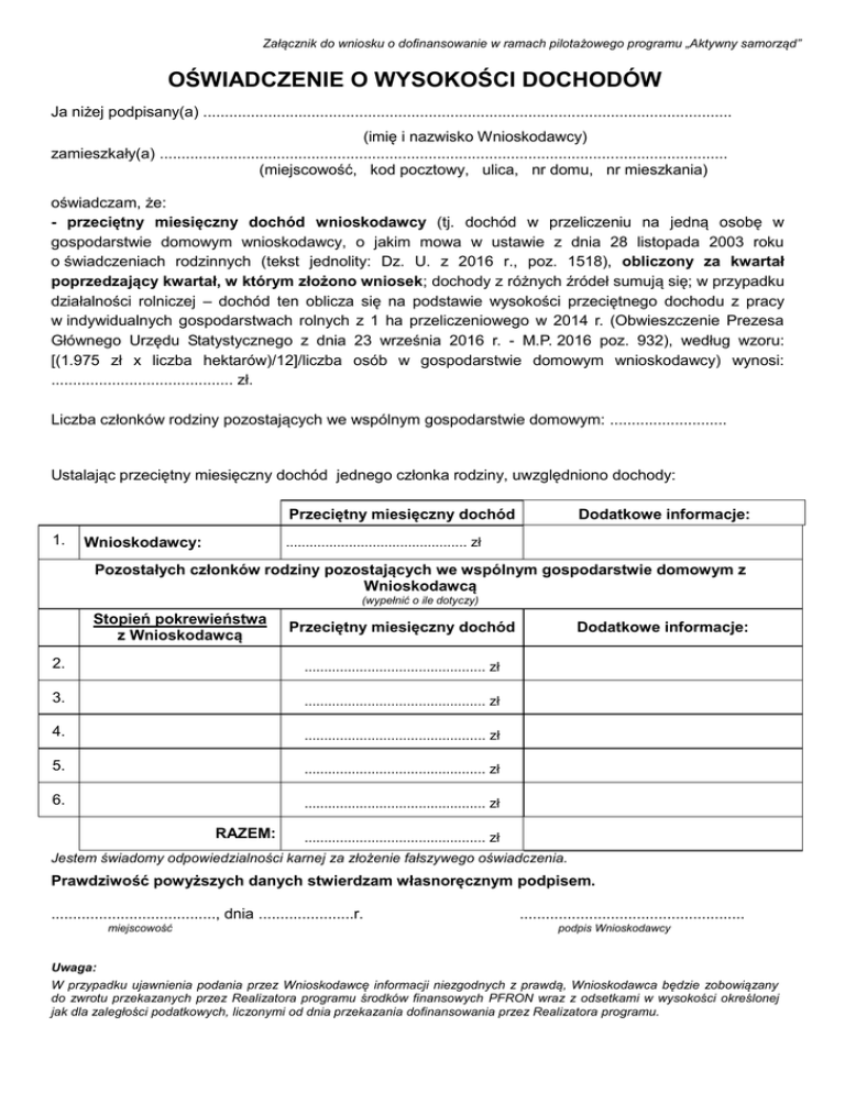 Załącznik do wniosku o dofinansowanie w ramach pilotażowego programu „Aktywny samorząd” OŚWIADCZENIE O WYSOKOŚCI DOCHODÓW Ja niżej podpisany(a) .......................................................................................................................... (imię i nazwisko Wnioskodawcy) zamieszkały(a) ................................................................................................................................... (miejscowość, kod pocztowy, ulica, nr domu, nr mieszkania) oświadczam, że: - przeciętny miesięczny dochód wnioskodawcy (tj. dochód w przeliczeniu na jedną osobę w gospodarstwie domowym wnioskodawcy, o jakim mowa w ustawie z dnia 28 listopada 2003 roku o świadczeniach rodzinnych (tekst jednolity: Dz. U. z 2016 r., poz. 1518), obliczony za kwartał poprzedzający kwartał, w którym złożono wniosek; dochody z różnych źródeł sumują się; w przypadku działalności rolniczej – dochód ten oblicza się na podstawie wysokości przeciętnego dochodu z pracy w indywidualnych gospodarstwach rolnych z 1 ha przeliczeniowego w 2014 r. (Obwieszczenie Prezesa Głównego Urzędu Statystycznego z dnia 23 września 2016 r. - M.P. 2016 poz. 932), według wzoru: [(1.975 zł x liczba hektarów)/12]/liczba osób w gospodarstwie domowym wnioskodawcy) wynosi: .......................................... zł. Liczba członków rodziny pozostających we wspólnym gospodarstwie domowym: ........................... Ustalając przeciętny miesięczny dochód jednego członka rodziny, uwzględniono dochody: Przeciętny miesięczny dochód 1. Dodatkowe informacje: .............................................. zł Wnioskodawcy: Pozostałych członków rodziny pozostających we wspólnym gospodarstwie domowym z Wnioskodawcą (wypełnić o ile dotyczy) Stopień pokrewieństwa z Wnioskodawcą Przeciętny miesięczny dochód 2. .............................................. zł 3. .............................................. zł 4. .............................................. zł 5. .............................................. zł 6. .............................................. zł RAZEM: Dodatkowe informacje: .............................................. zł Jestem świadomy odpowiedzialności karnej za złożenie fałszywego oświadczenia. Prawdziwość powyższych danych stwierdzam własnoręcznym podpisem. ......................................, dnia ......................r. miejscowość .................................................... podpis Wnioskodawcy Uwaga: W przypadku ujawnienia podania przez Wnioskodawcę informacji niezgodnych z prawdą, Wnioskodawca będzie zobowiązany do zwrotu przekazanych przez Realizatora programu środków finansowych PFRON wraz z odsetkami w wysokości określonej jak dla zaległości podatkowych, liczonymi od dnia przekazania dofinansowania przez Realizatora programu. Zgodnie z art. 3. ustawy z dnia 28 listopada 2003r. o świadczeniach rodzinnych (Dz. U. z 2016 r. poz. 1518) ilekroć w ustawie jest mowa o: 1) dochodzie - oznacza to, po odliczeniu kwot alimentów świadczonych na rzecz innych osób: a) 3 przychody podlegające opodatkowaniu na zasadach określonych w art. 27, art. 30b, art. 30c, art. 30e i art. 30f ustawy z dnia 26 lipca 1991 r. o podatku dochodowym od osób fizycznych (Dz. U. z 2012 r. poz. 361, z późn. zm.), pomniejszone o koszty uzyskania przychodu, należny podatek dochodowy od osób fizycznych, składki na ubezpieczenia społeczne niezaliczone do kosztów uzyskania przychodu oraz składki na ubezpieczenie zdrowotne, b) deklarowany w oświadczeniu dochód z działalności podlegającej opodatkowaniu na podstawie przepisów o zryczałtowanym podatku dochodowym od niektórych przychodów osiąganych przez osoby fizyczne, pomniejszony o należny zryczałtowany podatek dochodowy i składki na ubezpieczenia społeczne i zdrowotne, c) inne dochody niepodlegające opodatkowaniu na podstawie przepisów o podatku dochodowym od osób fizycznych: – renty określone w przepisach o zaopatrzeniu inwalidów wojennych i wojskowych oraz ich rodzin, – renty wypłacone osobom represjonowanym i członkom ich rodzin, przyznane na zasadach określonych w przepisach o zaopatrzeniu inwalidów wojennych i wojskowych oraz ich rodzin, – świadczenia pieniężne oraz ryczałt energetyczny określone w przepisach o świadczeniu pieniężnym i uprawnieniach przysługujących żołnierzom zastępczej służby wojskowej przymusowo zatrudnianym w kopalniach węgla, kamieniołomach, zakładach rud uranu i batalionach budowlanych, – dodatek kombatancki, ryczałt energetyczny i dodatek kompensacyjny określone w przepisach o kombatantach oraz niektórych osobach będących ofiarami represji wojennych i okresu powojennego, – świadczenie pieniężne określone w przepisach o świadczeniu pieniężnym przysługującym osobom deportowanym do pracy przymusowej oraz osadzonym w obozach pracy przez III Rzeszę Niemiecką lub Związek Socjalistycznych Republik Radzieckich, – emerytury i renty otrzymywane przez osoby, które utraciły wzrok w wyniku działań wojennych w latach 1939-1945 lub eksplozji pozostałych po tej wojnie niewypałów i niewybuchów, – renty inwalidzkie z tytułu inwalidztwa wojennego, kwoty zaopatrzenia otrzymywane przez ofiary wojny oraz członków ich rodzin, renty wypadkowe osób, których inwalidztwo powstało w związku z przymusowym pobytem na robotach w III Rzeszy Niemieckiej w latach 1939-1945, otrzymywane z zagranicy, – zasiłki chorobowe określone w przepisach o ubezpieczeniu społecznym rolników oraz w przepisach o systemie ubezpieczeń społecznych, – środki bezzwrotnej pomocy zagranicznej otrzymywane od rządów państw obcych, organizacji międzynarodowych lub międzynarodowych instytucji finansowych, pochodzące ze środków bezzwrotnej pomocy przyznanych na podstawie jednostronnej deklaracji lub umów zawartych z tymi państwami, organizacjami lub instytucjami pr