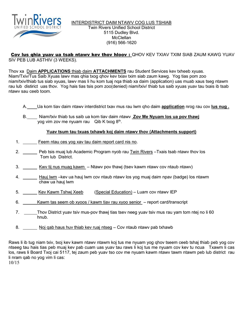 INTERDISTRICT DAIM NTAWV COG LUS TSHIAB Twin Rivers Unified School District 5115 Dudley Blvd. McClellan (916) 566-1620 Cov lus qhia yuav ua tsab ntawv kev thov hloov : QHOV KEV TXIAV TXIM SIAB ZAUM KAWG YUAV SIV PEB LUB ASTHIV (3 WEEKS). Thov xa Daim APPLICATIONS thiab daim ATTACHMENTS rau Student Services kev txheeb xyuas. Niam/Txiv/Tus Saib Xyuas lawv mas qhia txog qhov kev txiav txim siab zaum kawg. Yog tias pom zoo niam/txiv/thiab tus siab xyuas, lawv mas li hu kom tuaj nqa thiab xa daim (application) uas muab xaus tseg ntawm rau lub distirict uas thov. Yog hais tias tsis pom zoo(denied) niam/txiv/ thiab tus saib xyuas yuav tau txais ib tsab ntawv sau ceeb toom. A. Ua kom tiav daim ntawv interdistrict txav mus rau lwm qho daim application nrog rau cov lus nug . B. Niam/txiv thiab tus saib ua kom tiav daim ntawv Zov Me Nyuam los ua pov thawj yog vim zov me nyuam rau Qib K txog 8th. Yuav tsum tau txuas txhawb koj daim ntawv thov (Attachments support) 1. Feem ntau ces yog xav tau daim report card nis no. 2. Peb tsis muaj lub Academic Program nyob rau Twin Rivers –Txais tsab ntawv thov los Tom lub District. 3. Kwv tij nus muag kawm – Ntawv pov thawj (tsev kawm ntawv cov ntaub ntawv) 4. Hauj lwm –kev ua hauj lwm cov ntaub ntawv los yog muaj daim npav (badge) los ntawm chaw ua hauj lwm 5. Kev Kawm Tshwj Xeeb 6. Kawm tas seem ob xyoos / kawm tiav rau xyoo senior – report card/transcript 7. Thov District yuav tsiv mus-pov thawj tias tsev neeg yuav tsiv mus rau yam tom ntej no li 60 hnub. 8. (Special Education) – Luam cov ntawv IEP Noj qab haus huv thiab kev ruaj ntseg – Cov ntaub ntawv pab txhawb Raws li ib tug niam txiv, txoj kev kawm ntawv ntawm koj tus me nyuam yog qhov tseem ceeb tshaj thiab peb yog cov ntseeg tau hais tias peb muaj kev pab cuam uas yuav tau raws li koj tus me nyuam cov kev tu ncua Txawm li cas los, raws li Board Txoj cai 5117, tej zaum peb yuav tso cov me nyuam kawm ntawv tawm ntawm peb lub district rau li nram qab no yog vim li cas: 10/15 KOOG TSEV KAWM NTAWV DAIM NTAWV TSO CAI KAM HLOOV MUS KAWM RAU LWM KOOG TSEV KAWM NTAWV (Qib K-12) RAU XYOO KAWM NTAWV 20 - 20 ____ Daim Ntawv Cuv Npe Tshiab Ua Tshiab Romero Qhov Qhib Thov Cuv Npe Chaw nyob yog thov los ntawm niam txiv qhov chaw ua hau lwm los (Thov muab daim ntawv qhab nees tshiab tom nrog rau, luam ib daig thaum pib kawm ntawv tuaj, luam daim qhuab ntuas, thiab luam daim qhia tuaj koom kawm ntawv.) Tus Menyuam Lub Npe Hnub Yug ____________ Niam Txiv Email Niam Txiv/Tus Saib Xyuas Npe Tsev Xov Tooj___________________ Hau Lwm Xov Tooj: Chaw Nyob (Kev, Zos , Xeev, Zip) Lub Tsev Kawm Ntawv Tas Los ___________________________________ Koog Tsev Kawm Ntawv ________________________ Lub Tsev Kawm Ntawv Ze Tsev ___________________________________ Koog Tsev Kawm Ntawv ________________________ Lub Tsev Kawm Ntawv Thov Mus Kawm ____________________________ Koog Tsev Kawm Ntawv ________________________ *API Ntawm Lub Tsev Kawm Ntawv Ze Tsev ___________________ *ua kom tas rau Romero Qhov Thov Nkaus Xwb Qhov koj thov no yog vim li cas? (Khij kom tas cov cuam tshuam. Sau ib daig ntawv tom nrog rau seb yog vim li cas ho hloov los.) Zov Niam Txiv Ua Muaj Cov Noj Qab Nyob Lub Hom Phiaj Nyob Sab Nraum Koog SARB/Saib Xyuas Menyuam Hauv Lwm Nus Muag Zoo & Nyab Xeeb Tsev Kawm Ntawv Kom Muab Tso Rau Nruj/CPS Yuav Kawm Nyob Rau Yuav Tsum Kawm Ob Xyoos Rau Ntawm Qhia Rau Tias Hloov Chaw Lwm Yam (Hais Kom Ntawv Mus Li Lub Tsev Kawm Ntawv Yuav Mus Kawm Ntawv Nyob Lawm Meej Hauv Tsab Ntawv) Puas yog tus menyuam kawm ntawv tab tom nyob rau ntawm qhov qhuab Ntuas lossis raug kom rho tawm? Puas yog tus menyuam kawm ntawv yog ib tug menyuam tu? Yog Yog Tsis Yog Tsis Yog Tus menyuam kawm ntawv tau txais yam kev tshwj xeeb pab dabtsi? (Khij kom tas cov cuam tshuam thiab tom ib daig ntawv pov thawj tias muaj npe kawm nyob rau hauv hoob tshwj xeeb.) Muaj Peev Xwm (GATE) Tshooj 504 Kev Kawm Tshwj Xeeb Kawm Lus Askiv Yog tias tus menyuam kawm ntawv tau txais cov kev pab Tshwj Xeeb Kawm Ntawv, nws ho tau txais cov kev pab zoo li cas? (Thov muab tom nrog daim IEP.) Hoob Tshwj Xeeb Kawm (SDC) Hoob Nrhiav Kev Pab Cuam (RSP) Tsis Yog Tsev kawm Ntawv Ntawm Tsoom Fwv (NPS) Tab Tom Saib Cov ntawv Xeem Qhia Qhov Kev Qhia Pab QHIA PAUB: KOOM TES RAU KIS LAS – Yog tias tus menyuam koom tes nyob rau ntawm ib yam kis las ntawm ib lub hom phiaj nyob rau hauv California Interscholastic Foundation (CIF), nws yuav tsis tau koom tes nyob rau ntawm lub tsev kawm ntawv tshiab. Niam txiv/tus saib xyuas yuav tsum kuaj xyuas ntawm CIF cov kev cai ua ntej tso mam ua daim ntawv cuv npe mus. LOS NTAWM KUV LUB NPE KOS HAUV QAB NO, qhov kev qhia kuv muaj no yog qhov kuv paub zoo shaj rau ntawm daim ntawv cuv npe no yeej muaj tseeb thiab yog. Niam Txiv/Tus Saib Xyuas Kos Npe Hnub DAIM NTAWV TSO CAI SEB PUAS KAM MUS KOOM KAWM NYOB RAU XYOO KAWM NTAWV 20 LUB KOOG TSEV KAWM NTAWV NYOB ZE TSEV: KAM TSIS KAM LUB KOOG TSEV KAWM NTAWV YUAV MUS KAWM: KAM TSIS KAM ____ Yog vim li cas tsis kam: Yog vim li cas tsis kam: Tso Cai Kos Npe (Lub Koog Tsev Kawm Ntawv Ze Tsev) Hnub TSUAS YOG KEV KAWM NTAWV TSHWJ XEEB NKAUS XWB: Tso Cai Kos Npe (Ze Tsev SELPA) Hnub Tso Cai Kos Npe (Lub Koog Tsev Kawm Ntawv Ze Tsev) - 20____ Hnub TSUAS YOG KEV KAWM NTAWV TSHWJ XEEB NKAUS XWB: Tso Cai Kos Npe (Thov mus SELPA) Hnub Daim ntawv cuv npe kawm ntawv hloov mus kawm rau lwm lub koog tsev kawm ntawv thiab kev mus koom, thiab puas tau muaj ntawm ib lub koog tsev kawm ntawv tau tso cai los li ntawm (ITP) thiab txaus siab tuaj koom kawm nyob nrub nrab ntawm tus menyuam kawm ntawv lub koog tsev kawm ntawv ze nws tsev thiab lub koog tsev kawm ntawv, es yog lub nws cuv npe kawm, nrog rau kuj tsis txwv tabsis ntawm lub koog tsev kawm ntawv seb puas kam tso cai hloov ntawv tej zaum yuav tau ncua tseg. Ib daig qauv luam nyob ntawm lub koog tsev kawm ntawv seb puas kamtso cai hloov thiab tuaj koom kawm txaus siab muab nrog rau ntawm daim ntawv cuv npe thiab ho zoo li cas nyob rau ntawm lub koog tsev kawm nt