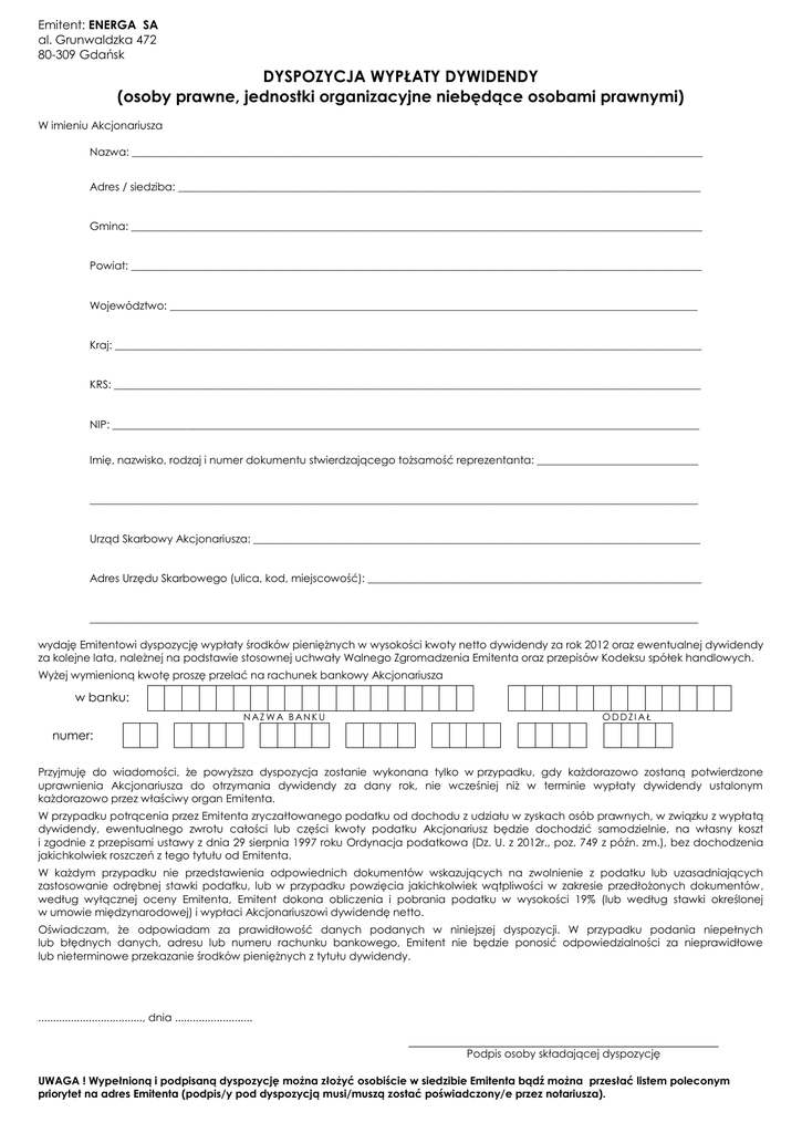 Emitent: ENERGA SA al. Grunwaldzka 472 80-309 Gdańsk DYSPOZYCJA WYPŁATY DYWIDENDY (osoby prawne, jednostki organizacyjne niebędące osobami prawnymi) W imieniu Akcjonariusza Nazwa: __________________________________________________________________________________________________________ Adres / siedziba: _________________________________________________________________________________________________ Gmina: __________________________________________________________________________________________________________ Powiat: __________________________________________________________________________________________________________ Województwo: __________________________________________________________________________________________________ Kraj: _____________________________________________________________________________________________________________ KRS: _____________________________________________________________________________________________________________ NIP: _____________________________________________________________________________________________________________ Imię, nazwisko, rodzaj i numer dokumentu stwierdzającego tożsamość reprezentanta: ______________________________ _________________________________________________________________________________________________________________ Urząd Skarbowy Akcjonariusza: ___________________________________________________________________________________ Adres Urzędu Skarbowego (ulica, kod, miejscowość): ______________________________________________________________ _________________________________________________________________________________________________________________ wydaję Emitentowi dyspozycję wypłaty środków pieniężnych w wysokości kwoty netto dywidendy za rok 2012 oraz ewentualnej dywidendy za kolejne lata, należnej na podstawie stosownej uchwały Walnego Zgromadzenia Emitenta oraz przepisów Kodeksu spółek handlowych. Wyżej wymienioną kwotę proszę przelać na rachunek bankowy Akcjonariusza w banku: NAZ WA B ANKU ODDZI AŁ numer: Przyjmuję do wiadomości, że powyższa dyspozycja zostanie wykonana tylko w przypadku, gdy każdorazowo zostaną potwierdzone uprawnienia Akcjonariusza do otrzymania dywidendy za dany rok, nie wcześniej niż w terminie wypłaty dywidendy ustalonym każdorazowo przez właściwy organ Emitenta. W przypadku potrącenia przez Emitenta zryczałtowanego podatku od dochodu z udziału w zyskach osób prawnych, w związku z wypłatą dywidendy, ewentualnego zwrotu całości lub części kwoty podatku Akcjonariusz będzie dochodzić samodzielnie, na własny koszt i zgodnie z przepisami ustawy z dnia 29 sierpnia 1997 roku Ordynacja podatkowa (Dz. U. z 2012r., poz. 749 z późn. zm.), bez dochodzenia jakichkolwiek roszczeń z tego tytułu od Emitenta. W każdym przypadku nie przedstawienia odpowiednich dokumentów wskazujących na zwolnienie z podatku lub uzasadniających zastosowanie odrębnej stawki podatku, lub w przypadku powzięcia jakichkolwiek wątpliwości w zakresie przedłożonych dokumentów, według wyłącznej oceny Emitenta, Emitent dokona obliczenia i pobrania podatku w wysokości 19% (lub według stawki określonej w umowie międzynarodowej) i wypłaci Akcjonariuszowi dywidendę netto. Oświadczam, że odpowiadam za prawidłowość danych podanych w niniejszej dyspozycji. W przypadku podania niepełnych lub błędnych danych, adresu lub numeru rachunku bankowego, Emitent nie będzie ponosić odpowiedzialności za nieprawidłowe lub nieterminowe przekazanie środków pieniężnych z tytułu dywidendy. ..................................., dnia .......................... Podpis osoby składającej dyspozycję UWAGA ! Wypełnioną i podpisaną dyspozycję można złożyć osobiście w siedzibie Emitenta bądź można przesłać listem poleconym priorytet na adres Emitenta (podpis/y pod dyspozycją musi/muszą zostać poświadczony/e przez notariusza). Informacje dotyczące wypłaty dywidendy z zysku za rok obrotowy 2012 Zwyczajne Walne Zgromadzenie ENERGA SA podjęło Uchwałę Nr 3 w sprawie podziału zysku netto za 2012 rok, przeznaczając na dywidendę dla akcjonariuszy kwotę 496 880 536,80 zł, tj. 0,10 zł na akcję. Uprawnionymi do dywidendy są akcjonariusze, którzy byli wpisani w Księdze Akcyjnej w dniu powzięcia uchwały o podziale zysku, tj. w dniu 23 kwietnia 2013 roku (dzień dywidendy). Rozpoczęcie wypłaty dywidendy nastąpi w dniu 3 czerwca 2013 roku. Wypłata dywidendy dla akcjonariuszy będących osobami prawnymi oraz jednostkami organizacyjnymi niebędącymi osobami prawnymi - dokonywana będzie za pośrednictwem Spółki. Kwota dywidendy wypłacanej poszczególnym akcjonariuszom, do których zastosowanie mają przepisy ustawy z dnia 15 lutego 1992 roku o podatku dochodowym od osób prawnych (Dz. U. z 2011r. Nr 74, poz. 397 z późn. zm.), zostanie pomniejszona o 19% zryczałtowany podatek dochodowy, pobierany i odprowadzany przez Spółkę, jako płatnika tego podatku, na rachunek właściwego dla podatnika urzędu skarbowego, na podstawie art. 22 i art. 26 ustawy o podatku dochodowym od osób prawnych. Dywidenda zostanie wypłacona przelewem na rachunek wskazany w Dyspozycji. Akcjonariusze, którzy złożyli dyspozycje wypłaty dywidendy z zysku za poprzednie lata obrotowe przelewem na rachunek bankowy nie składają ponownie dyspozycji. Dywidenda z zysku za rok 2012 zostanie przelana na przekazany numer rachunku bankowego akcjonariusza. Akcjonariusze, których numer bankowy uległ zmianie są zobowiązani do jego niezwłocznej aktualizacji poprzez ponowne złożenie dyspozycji do Spółki. W przeciwnym razie dywidenda zostanie przelana na numer rachunku akcjonariusza znajdujący się w bazie uprawnionych do dywidendy od akcji ENERGA SA, posiadanej przez Spółkę. Dyspozycję wypłaty dywidendy można złożyć osobiście w siedzibie Emitenta bądź przesłać na adres Emitenta (w takim przypadku podpis pod dyspozycją musi zostać pośw