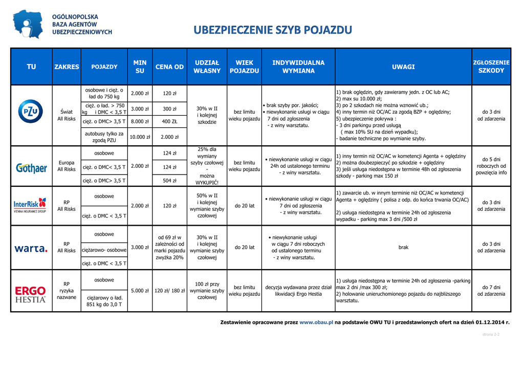 TU ZAKRES Świat All Risks POJAZDY MIN SU CENA OD osobowe i cięż. o ład do 750 kg 2.000 zł 120 zł cięż. o ład. > 750 3.000 zł kg i DMC < 3,5 T 300 zł cięż. o DMC> 3,5 T 8.000 zł 400 ZŁ autobusy tylko za zgodą PZU 10.000 zł 2.000 zł osobowe Europa All Risks cięż. o DMC< 3,5 T 124 zł 2.000 zł cięż. o DMC> 3,5 T 124 zł 504 zł osobowe InterRisk RP All Risks 2.000 zł 120 zł cięż. o DMC < 3,5 T osobowe warta RP All Risks ciężarowo- osobowe 3.000 zł cięż. o DMC < 3,5 T hestia RP ryzyka nazwane ciężarowy o ład. 851 kg do 3,0 T 120 zł/ 180 zł WIEK POJAZDU INDYWIDUALNA WYMIANA • brak szyby por. jakości; bez limitu • niewykonanie usługi w ciągu wieku pojazdu 7 dni od zgłoszenia - z winy warsztatu. 30% w II i kolejnej szkodzie 25% dla wymiany szyby czołowej można WYKUPIĆ! 50% w II i kolejnej wymianie szyby czołowej od 69 zł w 30% w II zależności od i kolejnej marki pojazdu wymianie szyby zwyżka 20% czołowej osobowe 5.000 zł UDZIAŁ WŁASNY UWAGI 1) brak oględzin, gdy zawieramy jedn. z OC lub AC; 2) max su 10.000 zł; 3) po 2 szkodach nie można wznowić ub.; 4) inny termin niż OC/AC za zgodą BZP + oględziny; 5) ubezpieczenie pokrywa : - 3 dni parkingu przed usługą ( max 10% SU na dzień wypadku); - badanie techniczne po wymianie szyby. ZGŁOSZENIE SZKODY do 3 dni od zdarzenia bez limitu wieku pojazdu 1) inny termin niż OC/AC w kometencji Agenta + oględziny • niewykonanie usługi w ciągu 2) można doubezpieczyć po szkodzie + oględziny 24h od ustalonego terminu 3) jeśli usługa niedostępna w terminie 48h od zgłoszenia - z winy warsztatu. szkody - parking max 150 zł do 5 dni roboczych od powzięcia info do 20 lat 1) zawarcie ub. w innym terminie niż OC/AC w kometencji • niewykonanie usługi w ciągu Agenta + oględziny ( polisa z odp. do końca trwania OC/AC) 7 dni od zgłoszenia - z winy warsztatu. 2) usługa niedostępna w terminie 24h od zgłoszenia wypadku - parking max 3 dni /500 zł do 3 dni od zdarzenia do 20 lat 100 zł przy bez limitu wymianie szyby wieku pojazdu czołowej • niewykonanie usługi w ciągu 7 dni roboczych od ustalonego terminu - z winy warsztatu. brak 1) usługa niedostępna w terminie 24h od zgłoszenia -parking decyzja wydawana przez dział max 2 dni /max 300 zł; likwidacji Ergo Hestia 2) holowanie unieruchomionego pojazdu do najbliższego warsztatu. do 3 dni od zdarzenia do 7 dni od zdarzenia Zestawienie opracowane przez www.obau.pl na podstawie OWU TU i przedstawionych ofert na dzień 01.12.2014 r. strona 2-2 Polska All Risks Świat All Risks POJAZDY osobowe, cięż. ład. < 3,5 T osobowe, terenowe MIN SU 2.000 zł 4.000 zł 3.000 zł CENA OD 120 zł UDZIAŁ WŁASNY brak udziałów WIEK POJAZDU INDYWIDUALNA WYMIANA po uzgodnieniu z przedstawicielem możliwość wymiany szyby w dowolnym warsztacie w ramach SU. 20 lat 138 zł • brak szyby por. jakości; 40% w II bez limitu • niewykonanie usługi i kolejnej wieku pojazdu w ciągu 14 dni od zgłoszenia wymianie szyby - z winy warsztatu. osobowe pow. 4 do 15 l. dost. do 8 lat 12 lat RP ryzyka nazwane osobowe dostawcze 3.000 zł 80 zł 25% tylko w umowie zawieranej wraz z OC dla opcji wymiana szyby czołowej Europa All Risks osobowe cięż. o DMC<3,5 T 3.000 zł 79 zł * brak udziału UWAGI 1) tylko 2 zdarzenia w trakcie trwania umowy; 2) brak usługi w ciągu 24h Uniqa pokryje koszty parkigu do 500 zł. 1) MAX SU 6.000 zł; 1) SU nieredukcyjna; 2) Towarzystwo może ograniczyć dostępność oferty dla konretnego modelu pojazdu; decyzja wydawana przez dział 3) usługa niedostępna w dniu zgłoszenia szkody - parking likwidacji szkód Link4 max 2 dni /max 500 zł 4) Brak odpowiedzialności w sytuacji pozostawienia w pojeździe tel.kom;laptopa; apartau fot.; brak możliwości 1) możliwość zawarcia tylko z AC * składka wyliczona dla ub.zawieranego z AC RP ryzyka nazwane osobowe cięż. o DMC<3,5 T osobowe RESO Europa All Risks 2.000 zł 70 zł 2.000 zl 65 zł cięż. o DMC< 3,5 T cięż. o DMC> 3,5T 6.000 zl ciągniki siodłowe za zgodą 6.000 zł 300 zł 25% w II i kolejnej wymianie szyby 20 lat • niewykonanie usługi w ciągu 1) usługa niedostępna w terminie 24h od zgłoszenia -parking 24h od ustalonego terminu. max 4 dni /max 300 zł 25% przy wymianie szyby czołowej 13 lat • niewykonanie usługi w ciągu 1) klient decyduje, który warsztat dokona wymiany; 24h od ustalonego terminu 2) koszt przygot. warunków do wyk. usługi - z winy warsztatu. np. garażu do 50 zł. ZGŁOSZENIE SZKODY do 7 dni od powzięcia info do 7 dni od powzięcia info do 24h od powzięcia info do 5 dni roboczysz od powzięcia info do 3 dni roboczych od zdarzenia ni e ZAKRES ni ez w ło cz TU Zestawienie opracowane przez www.obau.pl na podstawie OWU TU i przedstawionych ofert na dzień 01.12.2014 r. Składki podane w zestawieniu zostały wyliczone dla ub. zawieranego z OC. Terminy dotyczące indywidualnej wymiany szyby nie obejmują sytuacji, gdy nie ma kontaktu z Klientem lub to Klient nie akceptuje wskazanego przez warsztat terminu. ` strona 2-2