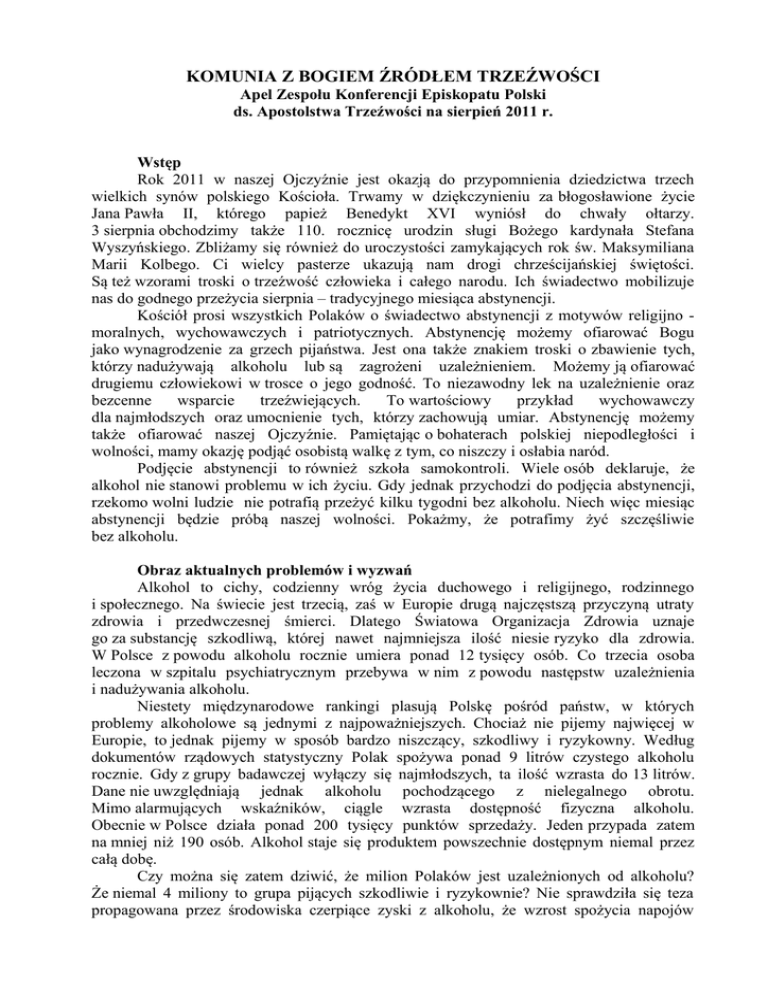 KOMUNIA Z BOGIEM ŹRÓDŁEM TRZEŹWOŚCI Apel Zespołu Konferencji Episkopatu Polski ds. Apostolstwa Trzeźwości na sierpień 2011 r. Wstęp Rok 2011 w naszej Ojczyźnie jest okazją do przypomnienia dziedzictwa trzech wielkich synów polskiego Kościoła. Trwamy w dziękczynieniu za błogosławione życie Jana Pawła II, którego papież Benedykt XVI wyniósł do chwały ołtarzy. 3 sierpnia obchodzimy także 110. rocznicę urodzin sługi Bożego kardynała Stefana Wyszyńskiego. Zbliżamy się również do uroczystości zamykających rok św. Maksymiliana Marii Kolbego. Ci wielcy pasterze ukazują nam drogi chrześcijańskiej świętości. Są też wzorami troski o trzeźwość człowieka i całego narodu. Ich świadectwo mobilizuje nas do godnego przeżycia sierpnia – tradycyjnego miesiąca abstynencji. Kościół prosi wszystkich Polaków o świadectwo abstynencji z motywów religijno moralnych, wychowawczych i patriotycznych. Abstynencję możemy ofiarować Bogu jako wynagrodzenie za grzech pijaństwa. Jest ona także znakiem troski o zbawienie tych, którzy nadużywają alkoholu lub są zagrożeni uzależnieniem. Możemy ją ofiarować drugiemu człowiekowi w trosce o jego godność. To niezawodny lek na uzależnienie oraz bezcenne wsparcie trzeźwiejących. To wartościowy przykład wychowawczy dla najmłodszych oraz umocnienie tych, którzy zachowują umiar. Abstynencję możemy także ofiarować naszej Ojczyźnie. Pamiętając o bohaterach polskiej niepodległości i wolności, mamy okazję podjąć osobistą walkę z tym, co niszczy i osłabia naród. Podjęcie abstynencji to również szkoła samokontroli. Wiele osób deklaruje, że alkohol nie stanowi problemu w ich życiu. Gdy jednak przychodzi do podjęcia abstynencji, rzekomo wolni ludzie nie potrafią przeżyć kilku tygodni bez alkoholu. Niech więc miesiąc abstynencji będzie próbą naszej wolności. Pokażmy, że potrafimy żyć szczęśliwie bez alkoholu. Obraz aktualnych problemów i wyzwań Alkohol to cichy, codzienny wróg życia duchowego i religijnego, rodzinnego i społecznego. Na świecie jest trzecią, zaś w Europie drugą najczęstszą przyczyną utraty zdrowia i przedwczesnej śmierci. Dlatego Światowa Organizacja Zdrowia uznaje go za substancję szkodliwą, której nawet najmniejsza ilość niesie ryzyko dla zdrowia. W Polsce z powodu alkoholu rocznie umiera ponad 12 tysięcy osób. Co trzecia osoba leczona w szpitalu psychiatrycznym przebywa w nim z powodu następstw uzależnienia i nadużywania alkoholu. Niestety międzynarodowe rankingi plasują Polskę pośród państw, w których problemy alkoholowe są jednymi z najpoważniejszych. Chociaż nie pijemy najwięcej w Europie, to jednak pijemy w sposób bardzo niszczący, szkodliwy i ryzykowny. Według dokumentów rządowych statystyczny Polak spożywa ponad 9 litrów czystego alkoholu rocznie. Gdy z grupy badawczej wyłączy się najmłodszych, ta ilość wzrasta do 13 litrów. Dane nie uwzględniają jednak alkoholu pochodzącego z nielegalnego obrotu. Mimo alarmujących wskaźników, ciągle wzrasta dostępność fizyczna alkoholu. Obecnie w Polsce działa ponad 200 tysięcy punktów sprzedaży. Jeden przypada zatem na mniej niż 190 osób. Alkohol staje się produktem powszechnie dostępnym niemal przez całą dobę. Czy można się zatem dziwić, że milion Polaków jest uzależnionych od alkoholu? Że niemal 4 miliony to grupa pijących szkodliwie i ryzykownie? Nie sprawdziła się teza propagowana przez środowiska czerpiące zyski z alkoholu, że wzrost spożycia napojów 2 niskoprocentowych przyczyni się do spadku spożycia tych najmocniejszych. W latach 19982009 obserwowaliśmy jednoczesny wzrost spożycia piwa i wódki. Niektóre statystyki napełniają szczególnym bólem i rozgoryczeniem. Co trzecia kobieta w ciąży pije alkohol. A zatem co trzecia przyszła matka spożywa substancję, która ma działanie wczesnoporonne oraz niesie zagrożenie dla rozwoju dziecka. Dlaczego nie skutkuje wiele cennych akcji informacyjnych o Płodowym Zespole Alkoholowym i jego wpływie na całe późniejsze życie dziecka? Dlaczego rodzice, którzy w pierwszym rzędzie powinni chronić dziecko, sami wnoszą w jego życie tak poważne zagrożenie? Nie zapominajmy, że alkohol jest nie tylko krytycznym zagrożeniem dla bezbronnych nienarodzonych dzieci, ale ma również niszczące działanie dla zdrowia oraz rozwoju emocjonalnego i intelektualnego nastolatków. Tymczasem 57 % nastolatków regularnie sięga po alkohol. Wzrasta jego spożycie przez dziewczęta, które piją już niemal tyle samo, ile chłopcy. Przez nagminne łamanie prawa młodzi kupują alkohol bez najmniejszych problemów. Negatywne efekty spożywania alkoholu przynoszą również olbrzymie straty ekonomiczne. W roku 2009 w Polsce oszacowano je na blisko 17,5 mld zł. Na te szacunki składają się między innymi straty zdrowotne i materialne, koszty odszkodowań, hospitalizacji i rehabilitacji, niższa wydajność pracy. W tym samym czasie z podatku akcyzowego pozyskano zaledwie 10 mld zł. Ostatecznie wszyscy ponosimy koszty i wszyscy tracimy. Kto twierdzi inaczej, okazuje niewiedzę lub z premedytacją kłamie. Za przedstawionymi statystykami kryje się dramat Polaków, którzy każdego dnia upadają pod brzemieniem uzależnienia; dramat milionów rodzin, które żyją w zniewoleniu, upokorzeniu, strachu i bólu; dramat zmarnowanych talentów, straconych życiowych szans i zaprzepaszczonych nadziei. Tymczasem dookoła nas szerzy się lekceważenie tego zjawiska. Alkohol traktuje się jak niegroźny produkt spożywczy, który nie powoduje żadnych negatywnych konsekwencji. Komunia z Bogiem – centrum życia trzeźwych rodzin Przedstawione problemy domagają się zdecydowanej reakcji. Przede wszystkim prosimy rodziny, aby kształtowały prawidłowe postawy wobec alkoholu. Silna i autentyczna więź z rodzicami oraz regularne i pogłębione praktyki religijne zapobiegają ryzykownym z