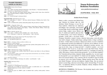 Porządek Nabożeństw od 08.06. do 15.06.2014 r. Niedziela 08.06. Zesłanie Ducha Świętego 7:00 Różaniec 7:30 Für ++ Mutter Anna Rock anlässlich Geburtstages, Vatter Theodor u. ++Grosseltern beiderseites 9:30 Godzinki ku czci Niepokalanego Poczęcia Maryi 10:00 Za + męża i ojca Otto, syna Lucjana, rodziców Marię i Teodora, teściów Annę i Jana, siostrę Krystynę, siostrzeńca Norberta, szwagierki, szwagrów i pokr. 17:15 Nabożeństwo 18:00 Za + Cecylię Niewergol w miesiąc po śmierci Poniedziałek 09.06. NMP Matki Kościoła, święto 8:00 Za + matkę Martę w r. śmierci, ++ ojca Jana, rodziców Krystynę i Wilhelma, braci Józefa i Franciszka, ++ pokr. 18:00 Z podz. za odebrane łaski z prośbą o dalszą Bożą opiekę i błog. dar zdrowia w rodzinie Wtorek 10.06. św. Bogumiła, biskupa, wsp. 18:00 Za ++ męża Józefa Leja w r. śmierci, rodziców Paulinę i Józefa Steinert, Paulinę i Franciszka Leja, synową Beatę, brata Gerharda, siostrę Reginę, Teodora, Pawła Bronek, Elżbietę i Pawła Leja, dziadków Leja, Steinert, Drzymała Środa 11.06. św. Barnaby, apostoła, wsp. 17:00 1. Za + męża, ++ rodziców, teściów, dziadków, oraz ++ pokr z obu stron 2. Za + Franciszkę w r. śmierci, jej + męża Emanuela, ++ pokr. z obu stron Czwartek 12.06. Jezusa Chrystusa Najwyższego Wiecznego kapłana, święto 17:45 Koronka do Bożego Miłosierdzia 18:00 Za + syna Mateusza Zajonc oraz ++ z pokr. Piątek 13.06. św. Antoniego z Padwy, prezbitera i doktora, wsp. 17:30 Różaniec za młode pokolenie 18:00 Do Bożej Op. za wst. NSM z podz. za otrzymane łaski z prośbą o dalszą opiekę i zdrowie z ok. 75 r. urodzin oraz o Boże bł. W rodzinach dzieci 18:45 Nabożeństwo fatimskie Sobota 14.06. bł. Michała Kozala, biskupa i męczennika, wsp. 8:00 Z podz. za dar życia oraz z prośbą o dalsze Boże bł. zdrowie, dary Ducha św. dla syna Mateusza z ok. 18 r. urodzin 15:00 Do Anioła Stróża o opiekę i zdrowie dla rocznego dziecka Aurelia Kerlin, oraz o bł. Boże w rodzinie 16:00 chrzest: Kacper Michał Sendal —–—————————————–—–——————————————––—– 17:30 Nabożeństwo Maryjne 18:00 Za ++ rodziców Elżbietę i Antoniego z ok. urodzin, + syna Bernarda i ++ pokr. Niedziela 15.06. Najświętszej Trójcy 7:00 Różaniec 7:30 ………………………….. 9:30 Godzinki ku czci Niepokalanego Poczęcia Maryi 10:00 Do Bożej Op. za wst NMP i św. Jana Pawła II z podz. za wszelkie łaski z ok. 1 r. ślubu Moniki i Błażeja Czupała oraz o bł. Boże i zdrowie w rodzinie 17:15 Nabożeństwo 18:00 Do Bożej Op. przez wst. MBNP z podz. za odebrane łaski z prośbą o dalszą opiekę i zdrowie w rodzinie Nasza Kolonowska Rodzina Parafialna www.parafia-kolonowskie.pl 23(1070) 08.06.– 15.06. 2014 Zesłanie Ducha Świętego Mamy w sobie, w naszym sercu Ducha Świętego. Możemy Go słuchać, albo nie. Jeśli słuchamy Ducha Świętego, to uczy On nas drogi mądrości, obdarowuje nas mądrością, pozwalającą nam postrzegać rzeczywistość oczyma Boga, słyszeć uszami Boga, miłować sercem Boga, osądzać rzeczy Bożym osądem. To właśnie jest mądrość, jaką nas obdarza Duch Święty, a my wszyscy możemy ją posiadać. Trzeba tylko o nią prosić Ducha Świętego. Pomyślcie o mamie w domu z dziećmi: kiedy jedno z nich robi jedno, inne myśli o drugim, i biedna matka biega z jednego krańca w drugi z problemami dzieci. A kiedy mamy się zmęczą i nakrzyczą na dzieci, czy jest to mądrość? Czy nakrzyczenie na dzieci jest mądrością? Co mówicie, jest to mądrość, czy nie? Nie! Natomiast kiedy matka bierze dziecko i delikatnie je strofuje, mówiąc: „Ale tego się nie robi, z tego, czy innego powodu”, i cierpliwie wyjaśnia - czy to jest Boża mądrość? Tak! To jest to, co nam daje w życiu daje Duch Święty. Następnie, na przykład w małżeństwie małżonkowie kłócą się, a następnie nie patrzą na siebie, albo patrzą z twarzą wykrzywioną grymasem - czy to jest Boża mądrość? Nie! Natomiast jeśli powiedzą, strapienie minęło, pogódźmy się, i na nowo zgodnie idą naprzód: czy to jest mądrość? To właśnie jest dar mądrości. Niech przyjdzie on do naszych domów, wraz z dziećmi, dla nas wszystkich! Tego nie można się nauczyć: jest to dar Ducha Świętego. Dlatego musimy prosić Pana, aby dał nam Ducha Świętego i dał nam dar mądrości, mądrość Boga. Aby nas nauczył patrzeć oczyma Boga, odczuwać sercem Boga, mówić słowami Boga. W ten sposób, z tą mądrością idziemy do przodu, budujemy rodzinę, budujemy Kościół i wszyscy się uświęcamy. SENTENCJA TYGODNIA: Phil Bosmans: Kto krytykuje innych, mówi więcej o sobie niż o swoim przeciwniku. 23/2014 Parafia: - 60 lat Kroniki naszej parafii notują, iż w niedzielę 30 maja 1954 roku, oficjał Sądu Duchownego ks. Wacław Wycisk, kolega ks. Czerwionki z czasów studiów we Wrocławiu poświęcił świątynię w Kolonowskiem. Poświęcenia dokonał w asyście księży Schenka i Lakomika oraz ministrantów Garcorza i Gruszki. W tym roku minęła 60 rocznica tego wydarzenia. dlatego podczas Odpustu 29.06.br. na sumie o godz. 11:00 będziemy polecali Bogu wszystkich którzy do budowy naszej świątyni się przyczynili, żyjących i zmarłych. Sumę będzie sprawował, już goszczący w naszej parafii, ks. Piotr wróbel, pochodzący z Wojnowic, obecnie pracujący w diecezji krakowskie. ukończył on studia ekonomiczne na Uniwersytecie w Krakowie a obecnie robi drugi fakultet na Papieskiej Akademii. W dniu odpustu o 15:00, jako wdzięczność za istnienie naszej świątyni, zapraszam na widowisko muzyczne w wykonaniu Teatru Prowincja w Mikołowie, pt. „Santo Subito”. - Malowanie Bóg zapłać za wpłacane ofiary. na ten cel zostanie przeprowadzona zbiórka złomu w sobotę 06 lipca. Kartki do kogo po złom podjechać można już przynosić do zakrystii lub na plebanię (można wrzucać do