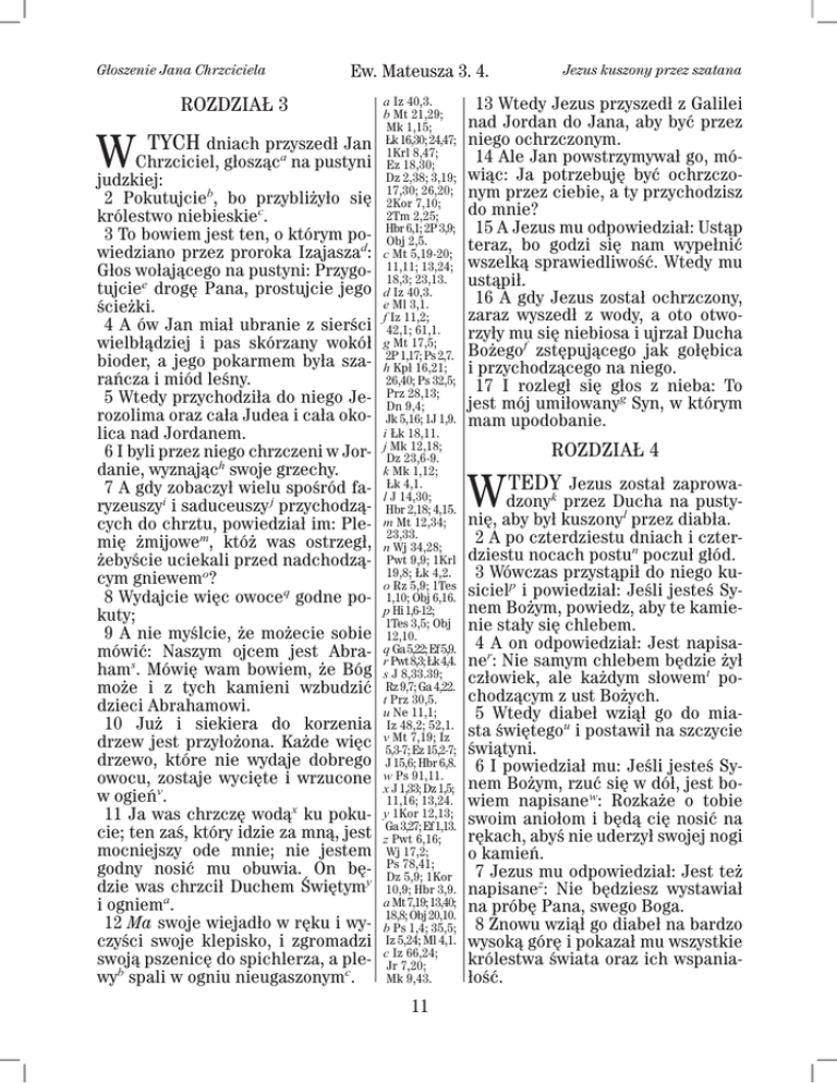 Głoszenie Jana Chrzciciela Ew. Mateusza 3. 4. ROZDZIAŁ 3 a Iz 40,3. b Mt 21,29; Mk 1,15; 16,30; 24,47; dniach przyszedł Jan Łk 1Krl 8,47; a Chrzciciel, głosząc na pustyni Ez 18,30; Dz 2,38; 3,19; judzkiej: 17,30; 26,20; 2 Pokutujcieb, bo przybliżyło się 2Kor 7,10; c 2Tm 2,25; królestwo niebieskie . 6,1; 2P 3,9; 3 To bowiem jest ten, o którym po- Hbr Obj 2,5. d wiedziano przez proroka Izajasza : c Mt 5,19-20; 13,24; Głos wołającego na pustyni: Przygo- 11,11; 18,3; 23,13. tujciee drogę Pana, prostujcie jego d Iz 40,3. e Ml 3,1. ścieżki. f Iz 11,2; 4 A ów Jan miał ubranie z sierści 42,1; 61,1. wielbłądziej i pas skórzany wokół g Mt 17,5; 1,17; Ps 2,7. bioder, a jego pokarmem była sza- h2PKpł 16,21; 26,40; Ps 32,5; rańcza i miód leśny. 28,13; 5 Wtedy przychodziła do niego Je- Prz Dn 9,4; rozolima oraz cała Judea i cała oko- Jk 5,16; 1J 1,9. i Łk 18,11. lica nad Jordanem. Mk 12,18; 6 I byli przez niego chrzczeni w Jor- jDz 23,6-9. h k Mk 1,12; danie, wyznając swoje grzechy. 4,1. 7 A gdy zobaczył wielu spośród fa- lŁkJ 14,30; i j ryzeuszy i saduceuszy przychodzą- Hbr 2,18; 4,15. Mt 12,34; cych do chrztu, powiedział im: Ple- m23,33. m mię żmijowe , któż was ostrzegł, n Wj 34,28; żebyście uciekali przed nadchodzą- Pwt 9,9; 1Krl 19,8; Łk 4,2. cym gniewemo? o Rz 5,9; 1Tes q 8 Wydajcie więc owoce godne po- 1,10; Obj 6,16. p Hi 1,6-12; kuty; 1Tes 3,5; Obj 9 A nie myślcie, że możecie sobie 12,10. Ga 5,22; Ef 5,9. mówić: Naszym ojcem jest Abra- qr Pwt 8,3; Łk 4,4. s ham . Mówię wam bowiem, że Bóg s J 8,33.39; może i z tych kamieni wzbudzić Rz 9,7; Ga 4,22. t Prz 30,5. dzieci Abrahamowi. u Ne 11,1; 10 Już i siekiera do korzenia Iz 48,2; 52,1. Mt 7,19; Iz drzew jest przyłożona. Każde więc v5,3-7; Ez 15,2-7; drzewo, które nie wydaje dobrego J 15,6; Hbr 6,8. owocu, zostaje wycięte i wrzucone wx JPs1,33;91,11. Dz 1,5; w ogieńv. 11,16; 13,24. x 11 Ja was chrzczę wodą ku poku- y 1Kor 12,13; 3,27; Ef 1,13. cie; ten zaś, który idzie za mną, jest zGaPwt 6,16; mocniejszy ode mnie; nie jestem Wj 17,2; 78,41; godny nosić mu obuwia. On bę- Ps Dz 5,9; 1Kor dzie was chrzcił Duchem Świętymy 10,9; Hbr 3,9. a Mt 7,19; 13,40; i ogniema. 18,8; Obj 20,10. 12 Ma swoje wiejadło w ręku i wy- b Ps 1,4; 35,5; czyści swoje klepisko, i zgromadzi Iz 5,24; Ml 4,1. 66,24; swoją pszenicę do spichlerza, a ple- cJrIz7,20; b c wy spali w ogniu nieugaszonym . Mk 9,43. W TYCH 11 Jezus kuszony przez szatana 13 Wtedy Jezus przyszedł z Galilei nad Jordan do Jana, aby być przez niego ochrzczonym. 14 Ale Jan powstrzymywał go, mówiąc: Ja potrzebuję być ochrzczonym przez ciebie, a ty przychodzisz do mnie? 15 A Jezus mu odpowiedział: Ustąp teraz, bo godzi się nam wypełnić wszelką sprawiedliwość. Wtedy mu ustąpił. 16 A gdy Jezus został ochrzczony, zaraz wyszedł z wody, a oto otworzyły mu się niebiosa i ujrzał Ducha Bożegof zstępującego jak gołębica i przychodzącego na niego. 17 I rozległ się głos z nieba: To jest mój umiłowanyg Syn, w którym mam upodobanie. ROZDZIAŁ 4 W TEDY Jezus został zaprowadzonyk przez Ducha na pustynię, aby był kuszonyl przez diabła. 2 A po czterdziestu dniach i czterdziestu nocach postun poczuł głód. 3 Wówczas przystąpił do niego kusicielp i powiedział: Jeśli jesteś Synem Bożym, powiedz, aby te kamienie stały się chlebem. 4 A on odpowiedział: Jest napisaner: Nie samym chlebem będzie żył człowiek, ale każdym słowemt pochodzącym z ust Bożych. 5 Wtedy diabeł wziął go do miasta świętegou i postawił na szczycie świątyni. 6 I powiedział mu: Jeśli jesteś Synem Bożym, rzuć się w dół, jest bowiem napisanew: Rozkaże o tobie swoim aniołom i będą cię nosić na rękach, abyś nie uderzył swojej nogi o kamień. 7 Jezus mu odpowiedział: Jest też napisanez: Nie będziesz wystawiał na próbę Pana, swego Boga. 8 Znowu wziął go diabeł na bardzo wysoką górę i pokazał mu wszystkie królestwa świata oraz ich wspaniałość.