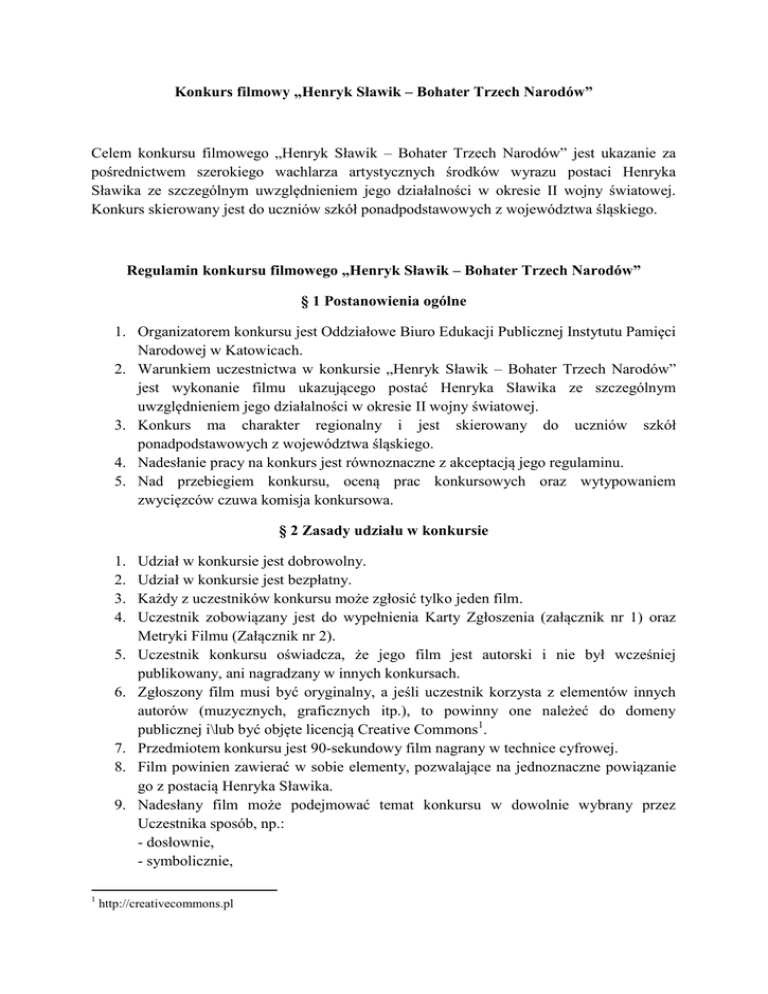 Konkurs filmowy „Henryk Sławik – Bohater Trzech Narodów” Celem konkursu filmowego „Henryk Sławik – Bohater Trzech Narodów” jest ukazanie za pośrednictwem szerokiego wachlarza artystycznych środków wyrazu postaci Henryka Sławika ze szczególnym uwzględnieniem jego działalności w okresie II wojny światowej. Konkurs skierowany jest do uczniów szkół ponadpodstawowych z województwa śląskiego. Regulamin konkursu filmowego „Henryk Sławik – Bohater Trzech Narodów” § 1 Postanowienia ogólne 1. Organizatorem konkursu jest Oddziałowe Biuro Edukacji Publicznej Instytutu Pamięci Narodowej w Katowicach. 2. Warunkiem uczestnictwa w konkursie „Henryk Sławik – Bohater Trzech Narodów” jest wykonanie filmu ukazującego postać Henryka Sławika ze szczególnym uwzględnieniem jego działalności w okresie II wojny światowej. 3. Konkurs ma charakter regionalny i jest skierowany do uczniów szkół ponadpodstawowych z województwa śląskiego. 4. Nadesłanie pracy na konkurs jest równoznaczne z akceptacją jego regulaminu. 5. Nad przebiegiem konkursu, oceną prac konkursowych oraz wytypowaniem zwycięzców czuwa komisja konkursowa. § 2 Zasady udziału w konkursie 1. 2. 3. 4. 5. 6. 7. 8. 9. 1 Udział w konkursie jest dobrowolny. Udział w konkursie jest bezpłatny. Każdy z uczestników konkursu może zgłosić tylko jeden film. Uczestnik zobowiązany jest do wypełnienia Karty Zgłoszenia (załącznik nr 1) oraz Metryki Filmu (Załącznik nr 2). Uczestnik konkursu oświadcza, że jego film jest autorski i nie był wcześniej publikowany, ani nagradzany w innych konkursach. Zgłoszony film musi być oryginalny, a jeśli uczestnik korzysta z elementów innych autorów (muzycznych, graficznych itp.), to powinny one należeć do domeny publicznej i\lub być objęte licencją Creative Commons1. Przedmiotem konkursu jest 90-sekundowy film nagrany w technice cyfrowej. Film powinien zawierać w sobie elementy, pozwalające na jednoznaczne powiązanie go z postacią Henryka Sławika. Nadesłany film może podejmować temat konkursu w dowolnie wybrany przez Uczestnika sposób, np.: - dosłownie, - symbolicznie, http://creativecommons.pl - poprzez standardowy film, - film niemy, - reportaż, - film animowany. 10. Przesłany film musi być zapisany w jednym z formatów (mov, mpg, mp4, avi). 11. Zalecana rozdzielczość: 1920x1080. 12. Proporcje filmu: 6:19. 13. Filmy powinny być przedłożone na opisanym imieniem i nazwiskiem oraz tytułem filmu nośniku CD lub DVD (w 3 kopiach) wraz z Kartą Zgłoszenia i Metryką Filmu. 14. Nadesłane w ramach konkursu prace nie będą zwracane autorom. Zostaną skatalogowane i zarchiwizowane przez Oddział IPN w Katowicach. 15. Dane osobowe uczestników konkursu są chronione zgodnie z obowiązującym prawem. 16. Organizator nie bierze odpowiedzialności za ewentualne uszkodzenia lub zniszczenia źle zabezpieczonych prac. 17. Organizator zastrzega, iż filmy nie spełniające powyższych wymagań nie będą stanowiły przedmiotu konkursu oraz, że nie będą przyjmowane filmy posiadające kontekst seksualny, zawierające i\lub promujące pornografię, rasizm, uprzedzenia etniczne, wulgaryzmy, pomówienia, wszelkie nie zgodne z prawem lub\i moralnością treści. 18. Organizator zastrzega sobie prawo do wyłączenia z udziału w konkursie prac o niskiej jakości technicznej. § 3 Miejsce i termin nadsyłania prac 1. Pracę konkursową wraz z dokładnie i czytelnie wypełnionymi: Kartą Zgłoszenia i Metryką Filmową należy przesłać pocztą lub dostarczyć na adres: Oddziałowe Biuro Edukacji Publicznej IPN w Katowicach ul. Józefowska 102 40-145 Katowice Z dopiskiem „Konkurs filmowy”. 2. Kartę zgłoszenia do konkursu podpisują również rodzice lub opiekunowie prawni niepełnoletnich uczestników konkursu. 3. Termin składania prac upływa 30 kwietnia 2014 r. Decyduje data wpływu lub potwierdzenia odbioru pracy w Biurze Podawczym Oddziału IPN w Katowicach. 4. Filmy złożone po wyznaczonym terminie nie będą dopuszczone do konkursu, chyba że Organizator, ze względu na szczególne okoliczności, postanowi inaczej. 5. Rozstrzygnięcie konkursu nastąpi w maju 2014 r. 6. Wyniki zostaną opublikowane na stronie internetowej Organizatora. § 3 Komisja konkursowa 1. Komisja konkursowa jest powoływana przez Naczelnika Oddziałowego Biura Edukacji Publicznej w Katowicach. 2. Zadaniem komisji jest wyłonienie laureatów konkursu w drodze oceny prac Uczestników, a także czuwanie nad prawidłowym przebiegiem konkursu. 3. Przedmiotem oceny komisji konkursowej będzie wartość merytoryczna, edukacyjna i artystyczna filmu, sposób ujęcia tematu, trafność doboru filmowanego materiału oraz szeroko rozumiany przekaz konkursowej pracy. 4. W skład komisji konkursowej wchodzą 4 osoby. 5. Decyzje komisji konkursowej są ostateczne i nie przysługuje od nich odwołanie. § 4 Nagrody i wyróżnienia 1. W konkursie zostaną przyznane nagrody i wyróżnienia dla laureatów najciekawszych prac wyłonionych przez komisję konkursową. 2. Każdy uczestnik dostanie dyplom zaświadczający o udziale w konkursie. 3. Do wygrania w konkursie są nagrody rzeczowe. 4. Nagrodzone prace zostaną ponadto zamieszczone na portalu IPN TV (platforma youtube.pl) oraz mogą być wykorzystane przy produkcji filmu dokumentalnego o Henryku Sławiku przygotowywanego przez IPN Katowice. 5. Organizator zastrzega sobie prawo do nie przyznania nagrody głównej lub nie przyznania żadnych wyróżnień w związku z niskim poziomem prac, a także prawo, aby nie zamieszczać prac konkursowych we wspomnianych portalu i filmie. § 5 Prawa autorskie 1. Filmy nadesłane, nagrodzone, wyróżnione stają się własnością Organizatora, który ma prawo do nieodpłatnego wykorzystania ich w nieograniczonym zakresie. 2. Uczestnik konkursu, składając swój podpis na karcie zgłoszenia oświadcza, że: a. Posiada pełnię praw autorskich do filmu i przenosi je na Organiz