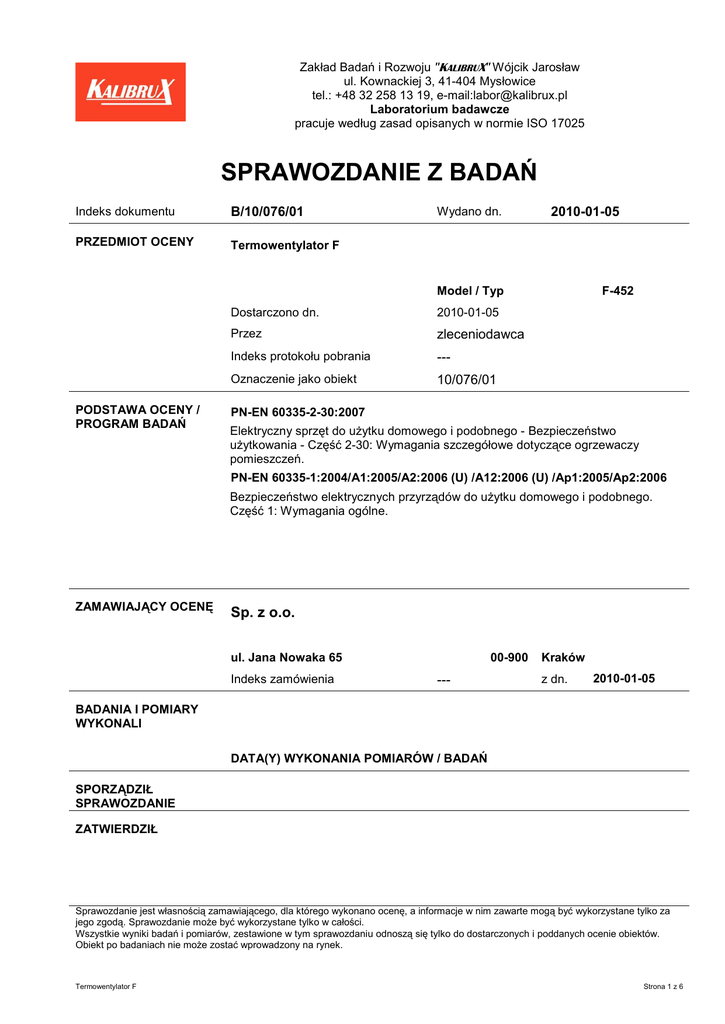 Zakład Badań i Rozwoju "KALIBRUX" Wójcik Jarosław ul. Kownackiej 3, 41-404 Mysłowice tel.: +48 32 258 13 19, e-mail:[email protected] Laboratorium badawcze pracuje według zasad opisanych w normie ISO 17025 SPRAWOZDANIE Z BADAŃ Indeks dokumentu B/10/076/01 PRZEDMIOT OCENY Termowentylator F Wydano dn. 2010-01-05 Model / Typ PODSTAWA OCENY / PROGRAM BADAŃ Dostarczono dn. 2010-01-05 Przez zleceniodawca Indeks protokołu pobrania --- Oznaczenie jako obiekt 10/076/01 F-452 PN-EN 60335-2-30:2007 Elektryczny sprzęt do uŜytku domowego i podobnego - Bezpieczeństwo uŜytkowania - Część 2-30: Wymagania szczegółowe dotyczące ogrzewaczy pomieszczeń. PN-EN 60335-1:2004/A1:2005/A2:2006 (U) /A12:2006 (U) /Ap1:2005/Ap2:2006 Bezpieczeństwo elektrycznych przyrządów do uŜytku domowego i podobnego. Część 1: Wymagania ogólne. ZAMAWIAJĄCY OCENĘ Sp. z o.o. ul. Jana Nowaka 65 Indeks zamówienia BADANIA I POMIARY WYKONALI 00-900 --- Kraków z dn. 2010-01-05 Marcin Pietrzyk DATA(Y) WYKONANIA POMIARÓW / BADAŃ SPORZĄDZIŁ SPRAWOZDANIE Marcin Pietrzyk ZATWIERDZIŁ Jarosław Wójcik Sprawozdanie jest własnością zamawiającego, dla którego wykonano ocenę, a informacje w nim zawarte mogą być wykorzystane tylko za jego zgodą. Sprawozdanie moŜe być wykorzystane tylko w całości. Wszystkie wyniki badań i pomiarów, zestawione w tym sprawozdaniu odnoszą się tylko do dostarczonych i poddanych ocenie obiektów. Obiekt po badaniach nie moŜe zostać wprowadzony na rynek. Termowentylator F Strona 1 z 6 Wzór sprawozdania z badań PN-EN 60335-2-30 i 60335-1.doc OBJAŚNIENIA SKRÓTÓW ZASTOSOWANYCH DO OCENY MoŜliwe przypadki oceny : opis badania nie dotyczy badanego przedmiotu.................: przedmiot badania spełnia wymaganie...............................: przedmiot badania nie spełnia wymagania…......................: punkt nie podlega ocenie, badania nie przeprowadzono....: Termowentylator F N (A) P (ass) F (ail) - Nie dotyczy Wynik pozytywny Wynik negatywny - Strona 2 z 6 Wzór sprawozdania z badań PN-EN 60335-2-30 i 60335-1.doc Norma według której był sporządzony program badania PN-EN 60335-2-30:2007 „Wymagania szczegółowe dotyczące ogrzewaczy pomieszczeń” Dział 4 Wymaganie – Sprawdzenie 5.2 5.3 5.6 5.10 5.101 5.102 6 6.2 7 7.1 Ocena Wymagania ogólne Rozdział ten według Części 1. 5 Wynik P Ogólne warunki wykonywania badań Rozdział ten wg Części 1, z poniŜszymi wyjątkami. P Uzupełnienie: P W przypadku ogrzewaczy przeznaczonych do instalowania obok siebie, konieczna jest wystarczająca liczba ogrzewaczy w celu określenia oddziaływania cieplnego sąsiednich ogrzewaczy na badany ogrzewacz. N Uzupełnienie: P Ogrzewacz uŜyty do badań wg Rozdziału 19 jest równieŜ uŜywany do badania wg 22.24. JeŜeli badania wykonuje się na tym samym ogrzewaczu, badania wg 22.24 wykonuje się po badaniach wg Rozdziału 29. P Uzupełnienie: P Termostaty czułe na temperaturę powietrza w pomieszczeniu, których czujnik umieszczony jest w otworze wlotowym powietrza do ogrzewacza są zwarte. JeŜeli jednak termostat moŜe być nastawiony tak, Ŝe nie pracuje cyklicznie, nie zwiera się go. N Regulatory elektroniczne wyłączono z działania czujnik zamiast zwierania termostatu. N Uzupełnienie: P Ogrzewacze przeznaczone do instalowania obok siebie zainstalowano zgodnie z instrukcjami. N Ogrzewacze, które mogły być uŜytkowane jako ogrzewacze przenośne albo jako ogrzewacze mocowane, poddawano badaniom przewidzianym dla obu typów ogrzewaczy. N Ogrzewacze stanowiące kombinację dwóch lub więcej typów poddawano badaniom przewidzianym dla kaŜdego typu ogrzewacza, chyba Ŝe badania przewidziane dla jednego typu odpowiadają badaniom określonym dla pozostałych typów. N Ogrzewacze przeznaczone do mocowania na ścianie badano jako ogrzewacze do mocowania na duŜej wysokości oraz jak ogrzewacze do mocowania na innej wysokości niŜ duŜa, chyba Ŝe w instrukcji instalowania jednoznacznie określono, Ŝe ogrzewacz ma być mocowany na wysokości nie mniejszej niŜ 1,8 m nad podłogą. N Klasyfikacja Rozdział ten wg Części 1, z poniŜszym wyjątkiem. P Uzupełnienie: P Ogrzewacze przeznaczone do uŜytkowania w szklarniach lub na placach budowy powinny miały stopień ochrony co najmniej IPX4. N Znakowanie i instrukcje Rozdział ten wg Części 1, z poniŜszymi wyjątkami. P Uzupełnienie: P Ogrzewacze przeznaczone do napełniania cieczą przez uŜytkownika powinny mieć oznakowany maksymalny i minimalny poziom cieczy. N N Oznakowane symbolem Termowentylator F lub Strona 3 z 6 Wzór sprawozdania z badań PN-EN 60335-2-30 i 60335-1.doc Norma według której był sporządzony program badania PN-EN 60335-2-30:2007 „Wymagania szczegółowe dotyczące ogrzewaczy pomieszczeń” Dział 7.12 Wymaganie – Sprawdzenie Wynik OSTRZEśENIE: Nie przykrywać P Oznakowanie to nie jest wymagane w przypadku: N - ogrzewaczy do mocowania na duŜej wysokości N - ogrzewaczy promiennikowych z elementami grzejnymi Ŝarzącymi się w sposób widoczny N - ogrzewaczy zbudowanych tak, Ŝe nie mogą być przykryte N - ogrzewaczy pomieszczeń przeznaczonych równieŜ do suszenia ubrań, spełniających wymagania wg lEC 60335-2-43 N Ogrzewacze mające osłonę ogniową, która jest przeznaczona do zdjęcia na czas transportu lub przechowywania, były oznakowane ostrzeŜeniem, Ŝe ogrzewacz nie moŜe pracować bez zainstalowanej osłony. N Uzupełnienie: P JeŜeli symbol „Nie przykrywać” jest oznakowany na ogrzewaczu, jego znaczenie powinno było objaśnione. P W instrukcjach ogrzewaczy oznakowanych napisem lub symbolem „Nie przykrywać” powinno było podane ostrzeŜenie o treści: P OSTRZEśENIE: W celu uniknięcia przegrzania - nie przykrywać ogrzewacza. „Nie stosować do suszenia ubrań. W Ŝaden sposób nie nakrywać Ŝeberek grzewczych – niebezpieczeństwo przegrzania urządzenia” P W instrukcjach powinno było podane, Ŝe nie moŜna umieszczać ogrzewacza bezpośr