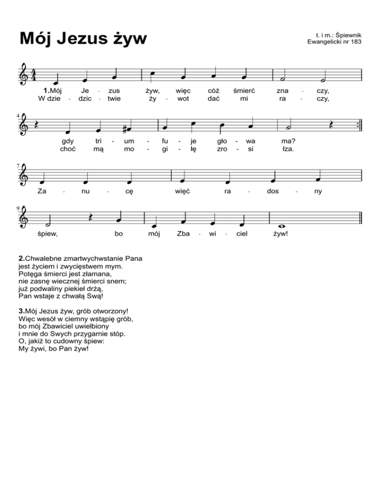 Mój Jezus żyw 4 1.Mój W dzie 4 gdy choć 7 Za 9 śpiew, t. i m.: Śpiewnik Ewangelicki nr 183 Je dzic zus twie tri mą żyw, ży um mo nu fu gi cę bo 2.Chwalebne zmartwychwstanie Pana jest życiem i zwycięstwem mym. Potęga śmierci jest złamana, nie zasnę wiecznej śmierci snem; już podwaliny piekieł drżą, Pan wstaje z chwałą Swą! 3.Mój Jezus żyw, grób otworzony! Więc wesół w ciemny wstąpię grób, bo mój Zbawiciel uwielbiony i mnie do Swych przygarnie stóp. O, jakiż to cudowny śpiew: My żywi, bo Pan żyw! więc wot cóż dać je łę gło zro więć mój Zba śmierć mi wa si ra wi zna ra ma? łza. dos ciel czy, czy, żyw! ny