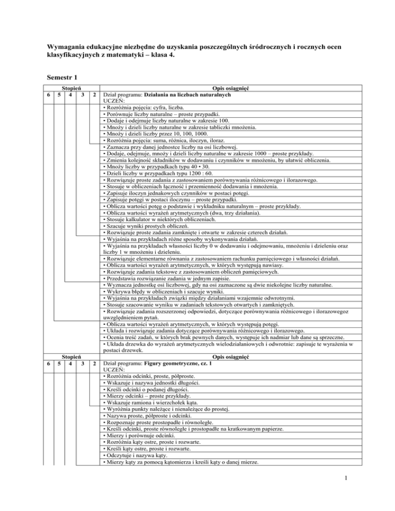 Wymagania edukacyjne niezbędne do uzyskania poszczególnych śródrocznych i rocznych ocen klasyfikacyjnych z matematyki – klasa 4. Semestr 1 6 5 Stopień 4 3 2 6 5 Stopień 4 3 2 Opis osiągnięć Dział programu: Działania na liczbach naturalnych UCZEŃ: • Rozróżnia pojęcia: cyfra, liczba. • Porównuje liczby naturalne – proste przypadki. • Dodaje i odejmuje liczby naturalne w zakresie 100. • Mnoży i dzieli liczby naturalne w zakresie tabliczki mnożenia. • Mnoży i dzieli liczby przez 10, 100, 1000. • Rozróżnia pojęcia: suma, różnica, iloczyn, iloraz. • Zaznacza przy danej jednostce liczby na osi liczbowej. • Dodaje, odejmuje, mnoży i dzieli liczby naturalne w zakresie 1000 – proste przykłady. • Zmienia kolejność składników w dodawaniu i czynników w mnożeniu, by ułatwić obliczenia. • Mnoży liczby w przypadkach typu 40 • 30. • Dzieli liczby w przypadkach typu 1200 : 60. • Rozwiązuje proste zadania z zastosowaniem porównywania różnicowego i ilorazowego. • Stosuje w obliczeniach łączność i przemienność dodawania i mnożenia. • Zapisuje iloczyn jednakowych czynników w postaci potęgi. • Zapisuje potęgi w postaci iloczynu – proste przypadki. • Oblicza wartości potęg o podstawie i wykładniku naturalnym – proste przykłady. • Oblicza wartości wyrażeń arytmetycznych (dwa, trzy działania). • Stosuje kalkulator w niektórych obliczeniach. • Szacuje wyniki prostych obliczeń. • Rozwiązuje proste zadania zamknięte i otwarte w zakresie czterech działań. • Wyjaśnia na przykładach różne sposoby wykonywania działań. • Wyjaśnia na przykładach własności liczby 0 w dodawaniu i odejmowaniu, mnożeniu i dzieleniu oraz liczby 1 w mnożeniu i dzieleniu. • Rozwiązuje elementarne równania z zastosowaniem rachunku pamięciowego i własności działań. • Oblicza wartości wyrażeń arytmetycznych, w których występują nawiasy. • Rozwiązuje zadania tekstowe z zastosowaniem obliczeń pamięciowych. • Przedstawia rozwiązanie zadania w jednym zapisie. • Wyznacza jednostkę osi liczbowej, gdy na osi zaznaczone są dwie niekolejne liczby naturalne. • Wykrywa błędy w obliczeniach i szacuje wyniki. • Wyjaśnia na przykładach związki między działaniami wzajemnie odwrotnymi. • Stosuje szacowanie wyniku w zadaniach tekstowych otwartych i zamkniętych. • Rozwiązuje zadania rozszerzonej odpowiedzi, dotyczące porównywania różnicowego i ilorazowegoz uwzględnieniem pytań. • Oblicza wartości wyrażeń arytmetycznych, w których występują potęgi. • Układa i rozwiązuje zadania dotyczące porównywania różnicowego i ilorazowego. • Ocenia treść zadań, w których brak pewnych danych, występuje ich nadmiar lub dane są sprzeczne. • Układa drzewka do wyrażeń arytmetycznych wielodziałaniowych i odwrotnie: zapisuje te wyrażenia w postaci drzewek. Opis osiągnięć Dział programu: Figury geometryczne, cz. 1 UCZEŃ: • Rozróżnia odcinki, proste, półproste. • Wskazuje i nazywa jednostki długości. • Kreśli odcinki o podanej długości. • Mierzy odcinki – proste przykłady. • Wskazuje ramiona i wierzchołek kąta. • Wyróżnia punkty należące i nienależące do prostej. • Nazywa proste, półproste i odcinki. • Rozpoznaje proste prostopadłe i równoległe. • Kreśli odcinki, proste równoległe i prostopadłe na kratkowanym papierze. • Mierzy i porównuje odcinki. • Rozróżnia kąty ostre, proste i rozwarte. • Kreśli kąty ostre, proste i rozwarte. • Odczytuje i nazywa kąty. • Mierzy kąty za pomocą kątomierza i kreśli kąty o danej mierze. 1 6 5 Stopień 4 3 2 6 5 Stopień 4 3 2 • Kreśli odcinki (proste) równoległe i prostopadłe za pomocą linijki i ekierki. • Mierzy odcinki różnymi jednostkami długości i zapisuje ich długości. • Podaje zależności między jednostkami długości. Przelicza jednostki – proste przypadki. • Rozwiązuje typowe zadania z zastosowaniem miar i własności poznanych kątów. • Definiuje kąt ostry, prosty i rozwarty. • Rozwiązuje zadania tekstowe o podwyższonym stopniu trudności, z wykorzystaniem jednostek długości i miar kątów. • Rozpoznaje i rysuje kąt zerowy, półpełny i pełny. • Kreśli i mierzy kąty większe od kąta półpełnego. • Przelicza jednostki długości. • Rozwiązuje zadania problemowe. Opis osiągnięć Dział programu: Rozszerzanie zakresu liczbowego UCZEŃ: • Odczytuje liczby do 10 000 – proste przykłady. • Odczytuje cyfry we wskazanych rzędach liczby. • Pisze liczby o danych cyfrach we wskazanych rzędach – proste przypadki. • Dodaje i odejmuje liczby sposobem pisemnym – proste przykłady. • Mnoży i dzieli przez liczby jednocyfrowe – proste przypadki. • Zapisuje liczby znakami rzymskimi w nieskomplikowanych przypadkach. • Rozróżnia podstawowe miary czasu. • Czyta liczby do 100 000 zapisane w dziesiątkowym systemie pozycyjnym i pisze je słowami. • Odczytuje duże liczby zaznaczone na osi liczbowej. • Zaznacza na osi liczbowej liczby naturalne. • Wykonuje dzielenie z resztą i sprawdza je za pomocą mnożenia- proste przykłady. • Stosuje algorytmy działań pisemnych. • Rozwiązuje proste zadania tekstowe z zastosowaniem obliczeń pisemnych i pamięciowych. • Rozwiązuje proste zadania, dotyczące porównywania różnicowego i ilorazowego, z zastosowaniem działań pisemnych. • Zapisuje daty, wieki, numery rozdziałów za pomocą znaków rzymskich. • Posługuje się podstawowymi miarami czasu. • Wyjaśnia znaczenia terminów: system dziesiątkowy i pozycyjny, nazywa i wskazuje rzędy. • Wyjaśnia sposoby pisemnego dodawania, odejmowania, mnożenia i dzielenia. • Podejmuje próby szacowania wyników. • Mnoży i dzieli przez liczby dwucyfrowe. • Wykonuje sprawdzenie przeprowadzonych działań. • Rozwiązuje zadania tekstowe z zastosowaniem obliczeń pisemnych. • Rozwiązuje pro