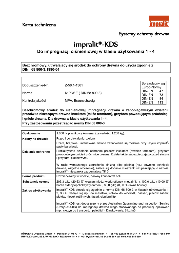 Karta techniczna Systemy ochrony drewna impralit®-KDS Do impregnacji ciśnieniowej w klasie użytkowania 1 - 4 Bezchromowy, utrwalający się środek do ochrony drewna do użycia zgodnie z DIN 68 800-3:1990-04 Dopuszczenie-Nr. Z-58.1-1361 Norma Iv P W E ( DIN 68 800-3) Kontrola jakości MPA, Braunschweig Sprawdzony wg Europ-Normy DIN-EN 47 DIN-EN 73 DIN-EN 84 DIN-EN 113 Bezchromowy środek do ciśnieniowej impregnacji drewna o zapobiegawczym działaniu przeciwko niszczącym drewno insektom (także termitom), grzybom powodującym próchnicę i gnicie drewna. Dla drewna w klasie użytkowania 1- 4. Przy zastosowaniu przestrzegać normy DIN 68 800-3 Opakowanie 1.000 l.- plastikowy kontener (zawartość: 1.200 kg). Kolory na drewnie Przed i po utrwalaniu: zielony Działanie ochronne Szare, brązowe i intensywne zielone zabarwienia są możliwe przy użyciu impralit pasty barwiącej. Profilaktyczne działanie ochronne przeciw insektom (również termitom), grzybom powodującym gnicie i próchnicę drewna. Działa także zabezpieczająco przed sinizną i grzybami pleśniowymi. ® W razie wzmożonego zagrożenia sinizną albo pleśnią (np.: powolne schnięcie drewna, wilgotne otoczenie), zaleca się dodanie mieszanki uzupełniającej o nazwie: impralit®-mieszanka uzupeniająca TK 3. Forma produktu Rozcieńczalny w wodzie, barwny koncentrat soli. Substancje czynne 205,3 g/kg (20,53 %) węglan miedzi-wodorotlenek miedzi (1:1), 100,0 g/kg (10,00 %) boran didecylopolioksyetyloamonu, 80,0 g/kg (8,00 %) kwas borowy Zakres użytkowania impralit®-KDS stosuje się zgodnie z normą DIN 68 800-3 w klasach użytkowania 1, 2, 3 i 4. Nadaje się np.: do masztów, kołków do winorośli, palisad, placów zabaw, płotów, niecek roślinnych, fasad, cieplarni itp. impralit®-KDS jest dopuszczony przez Australien Quarantine and Inspection Service (Urząd-AQUIS) do impregnacji drewna litego stosowanego do produkcji opakowań (np.: skrzyń do transportu, palet itd.). Dawkowanie: 6 kg/m3. RÜTGERS Organics GmbH Postfach 31 03 72 D-68263 Mannheim Tel. +49-(0)621-7654-247 Fax +49-(0)621-7654-449 IMPALEX-JANUSZ ŁAWNICZAK Różnowo 141 11-001 Dywity tel. 89 542 51 30 tel. kom. 606 881 659 Ograniczenia zastosowania Nie stosować gdy: • zaimpregnowane drewno może zgodnie z przeznaczeniem mieć bezpośredni kontakt z artykułami spożywczymi i karmą dla zwierząt • zaimpregnowane drewno ma być zastosowane na dużych powierzchniach pomieszczeń mieszkalnych (tzn., gdy stosunek powierzchni przeznaczonej do impregnacji do objętości pomieszczenia jest równy lub większy niż 0,2 m²/m³ ) oraz w pomieszczeniach do nich przylegających, chyba że zaimpregnowane części drewniane zostaną odpowiednio zabudowane • zaimpregnowane drewno ma być zastosowane w innych pomieszczeniach wewnętrznych o dużej powierzchni, chyba że zastosowanie na tak dużej powierzchni będzie technicznie uzasadnione jako nieuniknione. Sole ochronne mogą na początku, pomimo dobrego utrwalenia się, zostać wypłukane z powierzchni drewna na skutek działania deszczu. Dlatego powierzchnie, nad którymi znajduje się drewno, np.: murek, płytki, itd. mogą zostać zabrudzone. Należy temu zapobiegać. Skuteczność ochrony drewna nie zostaje zmniejszona wskutek wymywania. Środek zawiera biocydy do zapobiegawczej ochrony drewna (elementy nośne, wystające na zewnątrz) przed grzybami niszczącymi drewno i insektami. Należy go stosować tylko w przypadkach, gdy dana ochrona drewna jest konieczna. Nadużycie może być szkodliwe dla zdrowia i spowodować szkody w środowisku. Dane zawarte w karcie technicznej odnoszą się do drewna nie traktowanego chemicznie. W innym wypadku należy skontaktować się z naszym doradcą technicznym. Metody zastosowania impralit®-KDS stosuje się metodą próżniowo-ciśnieniową w urządzeniach stacjonarnych. Nie stosować poprzez malowanie, natryskiwanie, moczenie ani zanurzanie. Dozowanie Impregnacja próżniowo-ciśnieniowa Klasa użytkowania 1 i 2 Klasa użytkowania 3: Klasa użytkowania 4: 2,5 kg koncentratu / m3 drewna 3,0 kg koncentratu / m3 drewna 5,0 kg koncentratu / m3 drewna Przy zastosowaniu przestrzegać normy 68 800-3:1990-04. Karta techniczna dostępna w miejscu zastosowania. Stężenie robocze Stężenie robocze uzależnione jest od dozowania, rodzaju i objętości drewna. Zalecane minimalne stężenie wg RAL: Przygotowanie roztworu roboczego sosna: 1,4 - 2,0 % -owy roztwór wodny świerk: 1,7 - 2,5 % -owy roztwór wodny impralit®-KDS wykazuje w przypadku stężenia powyżej 1,3% doskonałe właściwości antykorozyjne. Dlatego zalecamy nie zaniżać tego stężenia, by w ten sposób zapobiec naturalnemu tworzeniu się rdzy w urządzeniach stacjonarnych, w których stosuje się roztwory wodne. impralit®-KDS można mieszać z wodą w każdej proporcji. Do przygotowania np.: 2%-owego roztworu roboczego należy rozpuścić 2 kg impralitu®-KDS w 98 litrach wody. Przejściowo może wytworzyć się niewielka ilość piany. Kontrola stężenia roztworu Za pomocą areometru i tabeli stężeń. Mieszanie z innymi roztworami impralit -KDS i sporządzonych z niego roztworów nie można mieszać z większością dostępnych na rynku soli ochronnych do drewna. Dlatego w razie zmiany środka impregnacyjnego należy uprzednio zasięgnąć technicznej porady u doradcy. ® RÜTGERS Organics GmbH Postfach 31 03 72 D-68263 Mannheim Tel. +49-(0)621-7654-247 Fax +49-(0)621-7654-449 IMPALEX-JANUSZ ŁAWNICZAK Różnowo 141 11-001 Dywity tel. 89 542 51 30 tel. kom. 606 881 659 Utrwalanie się środka impralit®-KDS może bezpośrednio po impregnacji zostać lekko wypłukany z drewna. By tego uniknąć należy chronić zaimpregnowane drewno przed deszczem i warunkami atmosferycznymi przez co najmniej 2 dni, a w temperaturze poniżej o +5 C przez co najmniej 7 dni. Wysyłka zaimpregnowanego drewna w 3 i 4 klasie użytkowania może nastąpić tylko wtedy, gdy nie ulega wątpliwości, że impregnat dobrze si