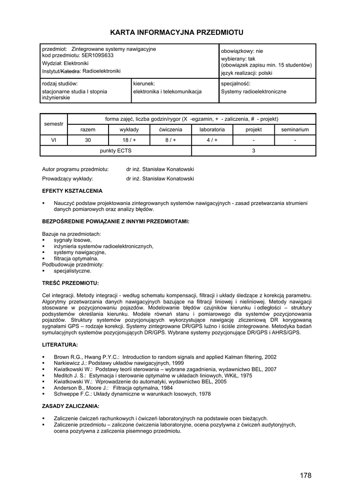 KARTA INFORMACYJNA PRZEDMIOTU przedmiot: Zintegrowane systemy nawigacyjne kod przedmiotu: 5ER109S633 Wydział: Elektroniki Instytut/Katedra: Radioelektroniki obowiązkowy: nie wybierany: tak (obowiązek zapisu min. 15 studentów) język realizacji: polski rodzaj studiów: stacjonarne studia I stopnia inżynierskie specjalność: Systemy radioelektroniczne semestr VI kierunek: elektronika i telekomunikacja forma zajęć, liczba godzin/rygor (X -egzamin, + - zaliczenia, # - projekt) razem wykłady ćwiczenia laboratoria projekt seminarium 30 18 / + 8/+ 4/+ - - punkty ECTS Autor programu przedmiotu: dr inż. Stanisław Konatowski Prowadzący wykłady: dr inż. Stanisław Konatowski 3 EFEKTY KSZTAŁCENIA Nauczyć podstaw projektowania zintegrowanych systemów nawigacyjnych - zasad przetwarzania strumieni danych pomiarowych oraz analizy błędów. BEZPOŚREDNIE POWIĄZANIE Z INNYMI PRZEDMIOTAMI: Bazuje na przedmiotach: sygnały losowe, inżynieria systemów radioelektronicznych, systemy nawigacyjne, filtracja optymalna. Podbudowuje przedmioty: specjalistyczne. TREŚĆ PRZEDMIOTU: Cel integracji. Metody integracji - według schematu kompensacji, filtracji i układy śledzące z korekcją parametru. Algorytmy przetwarzania danych nawigacyjnych bazujące na filtracji liniowej i nieliniowej. Metody nawigacji stosowane w pozycjonowaniu pojazdów. Modelowanie błędów czujników kierunku i odległości – struktury podsystemów określania kierunku. Modele równań stanu i pomiarowego dla systemów pozycjonowania pojazdów. Struktury systemów pozycjonujących wykorzystujące nawigację zliczeniową DR korygowaną sygnałami GPS – rodzaje korekcji. Systemy zintegrowane DR/GPS luźno i ściśle zintegrowane. Metodyka badań symulacyjnych systemów pozycjonujących DR/GPS. Wybrane systemy pozycjonujące DR/GPS i AHRS/GPS. LITERATURA: Brown R.G., Hwang P.Y.C.: Introduction to random signals and applied Kalman filtering, 2002 Narkiewicz J.: Podstawy układów nawigacyjnych, 1999 Kwiatkowski W.: Podstawy teorii sterowania – wybrane zagadnienia, wydawnictwo BEL, 2007 Meditch J. S.: Estymacja i sterowanie optymalne w układach liniowych, WKiŁ, 1975 Kwiatkowski W.: Wprowadzenie do automatyki, wydawnictwo BEL, 2005 Anderson B., Moore J.: Filtracja optymalna, 1984 Schweppe F.C.: Układy dynamiczne w warunkach losowych, 1978 ZASADY ZALICZANIA: Zaliczenie ćwiczeń rachunkowych i ćwiczeń laboratoryjnych na podstawie ocen bieżących. Zaliczenie przedmiotu – zaliczone ćwiczenia laboratoryjne, ocena pozytywna z ćwiczeń audytoryjnych, ocena pozytywna z zaliczenia pisemnego przedmiotu. 178