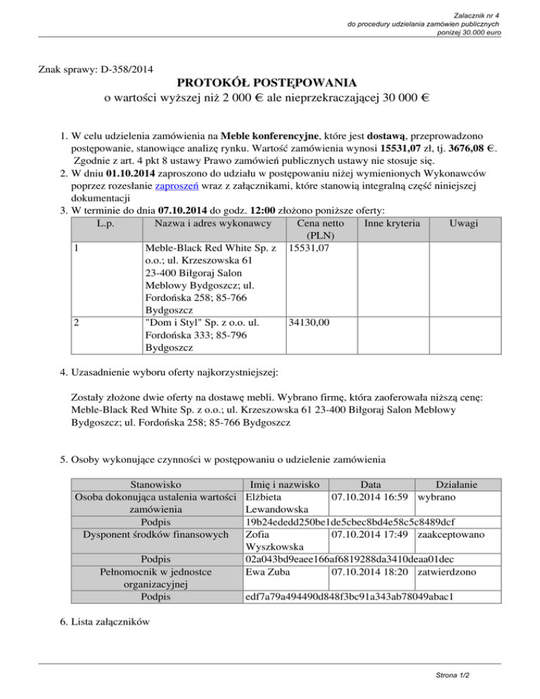Zalacznik nr 4 do procedury udzielania zamówien publicznych ponizej 30.000 euro Znak sprawy: D-358/2014 PROTOKÓŁ POSTĘPOWANIA o wartości wyższej niż 2 000 € ale nieprzekraczającej 30 000 € 1. W celu udzielenia zamówienia na Meble konferencyjne, które jest dostawą, przeprowadzono postępowanie, stanowiące analizę rynku. Wartość zamówienia wynosi 15531,07 zł, tj. 3676,08 €. Zgodnie z art. 4 pkt 8 ustawy Prawo zamówień publicznych ustawy nie stosuje się. 2. W dniu 01.10.2014 zaproszono do udziału w postępowaniu niżej wymienionych Wykonawców poprzez rozesłanie zaproszeń wraz z załącznikami, które stanowią integralną część niniejszej dokumentacji 3. W terminie do dnia 07.10.2014 do godz. 12:00 złożono poniższe oferty: L.p. Nazwa i adres wykonawcy Cena netto Inne kryteria Uwagi (PLN) 1 Meble-Black Red White Sp. z 15531,07 o.o.; ul. Krzeszowska 61 23-400 Biłgoraj Salon Meblowy Bydgoszcz; ul. Fordońska 258; 85-766 Bydgoszcz 2 "Dom i Styl" Sp. z o.o. ul. 34130,00 Fordońska 333; 85-796 Bydgoszcz 4. Uzasadnienie wyboru oferty najkorzystniejszej: Zostały złożone dwie oferty na dostawę mebli. Wybrano firmę, która zaoferowała niższą cenę: Meble-Black Red White Sp. z o.o.; ul. Krzeszowska 61 23-400 Biłgoraj Salon Meblowy Bydgoszcz; ul. Fordońska 258; 85-766 Bydgoszcz 5. Osoby wykonujące czynności w postępowaniu o udzielenie zamówienia Stanowisko Osoba dokonująca ustalenia wartości zamówienia Podpis Dysponent środków finansowych Podpis Pełnomocnik w jednostce organizacyjnej Podpis Imię i nazwisko Data Działanie Elżbieta 07.10.2014 16:59 wybrano Lewandowska 19b24ededd250be1de5cbec8bd4e58c5c8489dcf Zofia 07.10.2014 17:49 zaakceptowano Wyszkowska 02a043bd9eaee166af6819288da3410deaa01dec Ewa Zuba 07.10.2014 18:20 zatwierdzono edf7a79a494490d848f3bc91a343ab78049abac1 6. Lista załączników Strona 1/2 Zalacznik nr 4 do procedury udzielania zamówien publicznych ponizej 30.000 euro Zamówienie (application/pdf) Faktura Proforma (application/pdf) 7. Status Postępowania: Postępowanie Roztrzygnięte: Wyłoniono Wykonawcę zamówienia. Finalizacja Postepowania: Ewa Zuba Stempel czasu: 2014-10-14 15:43:43, Podpis: 874a5504448b8c459dd7131575ef410b8d565293 Dokument wygenerowany i podpisany elektronicznie. Nie wymaga pieczęci, stempla i innych form podpisu. Na podstawie ZARZĄDZENIA NR Z.55.2012.2013 Rektora Uniwersytetu Technologiczno-Przyrodniczego w Bydgoszczy z dnia 8 lutego 2013 r. Strona 2/2 Powered by TCPDF (www.tcpdf.org)