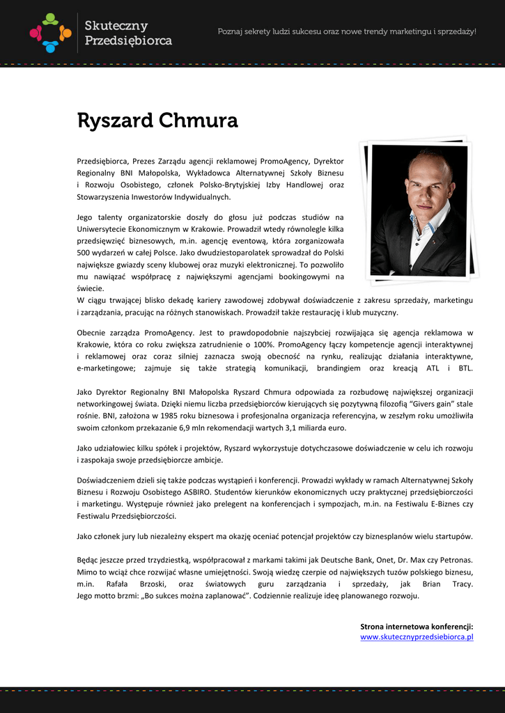 Przedsiębiorca, Prezes Zarządu agencji reklamowej PromoAgency, Dyrektor Regionalny BNI Małopolska, Wykładowca Alternatywnej Szkoły Biznesu i Rozwoju Osobistego, członek Polsko-Brytyjskiej Izby Handlowej oraz Stowarzyszenia Inwestorów Indywidualnych. Jego talenty organizatorskie doszły do głosu już podczas studiów na Uniwersytecie Ekonomicznym w Krakowie. Prowadził wtedy równolegle kilka przedsięwzięd biznesowych, m.in. agencję eventową, która zorganizowała 500 wydarzeo w całej Polsce. Jako dwudziestoparolatek sprowadzał do Polski największe gwiazdy sceny klubowej oraz muzyki elektronicznej. To pozwoliło mu nawiązad współpracę z największymi agencjami bookingowymi na świecie. W ciągu trwającej blisko dekadę kariery zawodowej zdobywał doświadczenie z zakresu sprzedaży, marketingu i zarządzania, pracując na różnych stanowiskach. Prowadził także restaurację i klub muzyczny. Obecnie zarządza PromoAgency. Jest to prawdopodobnie najszybciej rozwijająca się agencja reklamowa w Krakowie, która co roku zwiększa zatrudnienie o 100%. PromoAgency łączy kompetencje agencji interaktywnej i reklamowej oraz coraz silniej zaznacza swoją obecnośd na rynku, realizując działania interaktywne, e-marketingowe; zajmuje się także strategią komunikacji, brandingiem oraz kreacją ATL i BTL. Jako Dyrektor Regionalny BNI Małopolska Ryszard Chmura odpowiada za rozbudowę największej organizacji networkingowej świata. Dzięki niemu liczba przedsiębiorców kierujących się pozytywną filozofią “Givers gain” stale rośnie. BNI, założona w 1985 roku biznesowa i profesjonalna organizacja referencyjna, w zeszłym roku umożliwiła swoim członkom przekazanie 6,9 mln rekomendacji wartych 3,1 miliarda euro. Jako udziałowiec kilku spółek i projektów, Ryszard wykorzystuje dotychczasowe doświadczenie w celu ich rozwoju i zaspokaja swoje przedsiębiorcze ambicje. Doświadczeniem dzieli się także podczas wystąpieo i konferencji. Prowadzi wykłady w ramach Alternatywnej Szkoły Biznesu i Rozwoju Osobistego ASBIRO. Studentów kierunków ekonomicznych uczy praktycznej przedsiębiorczości i marketingu. Występuje również jako prelegent na konferencjach i sympozjach, m.in. na Festiwalu E-Biznes czy Festiwalu Przedsiębiorczości. Jako członek jury lub niezależny ekspert ma okazję oceniad potencjał projektów czy biznesplanów wielu startupów. Będąc jeszcze przed trzydziestką, współpracował z markami takimi jak Deutsche Bank, Onet, Dr. Max czy Petronas. Mimo to wciąż chce rozwijad własne umiejętności. Swoją wiedzę czerpie od największych tuzów polskiego biznesu, m.in. Rafała Brzoski, oraz światowych guru zarządzania i sprzedaży, jak Brian Tracy. Jego motto brzmi: „Bo sukces można zaplanowad”. Codziennie realizuje ideę planowanego rozwoju. Strona internetowa konferencji: www.skutecznyprzedsiebiorca.pl