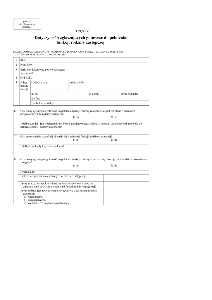 pieczęć ośrodka pomocy społecznej CZĘŚĆ V Dotyczy osób zgłaszających gotowość do pełnienia funkcji rodziny zastępczej I. DANE OSÓB ZGŁASZAJĄCYCH GOTOWOŚĆ DO PEŁNIENIA FUNKCJI RODZINY ZASTĘPCZEJ, Z KTÓRYMI PRZEPROWADZONO WYWIAD 1 Imię 2 Nazwisko 3 Seria i nr dokumentu potwierdzającego tożsamość Nr PESEL 4 5 Adres pobytu stałego kod pocztowy: miejscowość: ulica: nr domu: nr mieszkania: telefon: symbol terytorialny: 6 Czy osoby zgłaszające gotowość do pełnienia funkcji rodziny zastępczej są spokrewnione z dzieckiem przyjmowanym do rodziny zastępczej? 1) tak 2) nie Jeżeli tak, to jaki jest stopień pokrewieństwa przyjmowanego dziecka z osobami zgłaszającymi gotowość do pełnienia funkcji rodziny zastępczej? 7 Czy osoba/rodzina wcześniej ubiegała się o pełnienie funkcji rodziny zastępczej? 1) tak 2) nie Jeżeli tak, to kiedy i z jakim skutkiem? 8 Czy osoby zgłaszające gotowość do pełnienia funkcji rodziny zastępczej wychowują już inne dzieci jako rodzina zastępcza? 1) tak 2) nie Jeżeli tak, to: 1) ile dzieci jest już umieszczonych w rodzinie zastępczej? 2) czy są to dzieci spokrewnione czy niespokrewnione z osobami zgłaszającymi gotowość do pełnienia funkcji rodziny zastępczej? 3) czy rodzina jest zawodową niespokrewnioną z dzieckiem rodziną zastępczą: a) wielodzietną, b) specjalistyczną, c) o charakterze pogotowia rodzinnego II. INFORMACJA O CZŁONKACH RODZINY 1 2 3 4 5 6 7 8 9 10 Lp. Imię i nazwisko Data urodzenia Płeć Stan Stopień Wykształcenie/ Miejsce pracy lub Sytuacja Źródła dochodu cywilny pokrewień zawód nauki zdrowotna (utrzymania) stwa** wykonywany (szkoła, przedszkole) dzień mc rok rodzaj wysokość 1* 2* 3 4 5 6 8 8 9 * Osoba zgłaszająca gotowość do pełnienia funkcji rodziny zastępczej. ** W stosunku do osoby zgłaszającej gotowość do pełnienia funkcji rodziny zastępczej. III. SYTUACJA MATERIALNA OSOBY/RODZINY 1 Łączny dochód w rodzinie (zgodnie z art. 8 ustawy o pomocy społecznej) 2 Stałe miesięczne wydatki osoby/rodziny łącznie: zł w tym: czynsz zł energia elektryczna zł gaz zł alimenty zł opłaty za dom pomocy społecznej zł opłaty za szkołę/bursę/internat zł opłaty za przedszkole zł wydatki na leki i leczenie zł inne – jakie? zł 3 Alimenty świadczone przez osobę/członka rodziny, z którą przeprowadzany jest wywiad, lub innych członków rodziny: Kto? Na czyją rzecz? Wysokość zł 1) dobrowolne 2) na podstawie orzeczenia sądu Wysokość zaległych alimentów zł IV. SYTUACJA MIESZKANIOWA OSOBY/RODZINY 1 Mieszkanie: 1) lokatorskie spółdzielcze prawo do lokalu mieszkalnego 2) własnościowe spółdzielcze prawo do lokalu mieszkalnego 3) własność lokalu/ domu jednorodzinnego 4) komunalne/kwaterunkowe 5) mieszkanie wynajęte 6) mieszkanie chronione 7) prawo do domu jednorodzinnego/jego części w spółdzielni mieszkaniowej 8) hotel 9) barak 10) brak mieszkania 11) inne 2 Liczba izb 3. Oddzielna kuchnia: 4 Piętro 5. Winda: 1) tak 2) nie 1) tak 2) nie 6 Wyposażenie mieszkania w instalacje: Woda Woda 1) w mieszkaniu 1) w mieszkaniu ciepła zimna: 2) poza mieszkaniem 2) poza mieszkaniem 3) poza budynkiem 3) poza budynkiem 4) brak wody 4) brak wody 1) w mieszkaniu 1) w mieszkaniu Łazienka: WC: 2) poza mieszkaniem 2) poza mieszkaniem 3) brak łazienki 3) poza budynkiem Ogrzewanie: 1) piece węglowe 2) ogrzewanie centralne 3) ogrzewanie centralne – gazowe 4) ogrzewanie elektryczne – akumulacyjne 5) brak ogrzewania Gaz: Telefon: 1) tak 1) tak 2) nie 2) nie 7 Stan utrzymania mieszkania: 8 1) czyste, zadbane 2) brudne, zaniedbane 3) zdewastowane W jakie sprzęty gospodarstwa domowego wyposażone jest mieszkanie? 1) kuchnia węglowa 2) kuchnia gazowa 3) kuchnia elektryczna 4) piekarnik 5) kuchnia mikrofalowa 6) zmywarka 7) lodówka 8) zamrażarka 9) pralka wirnikowa 10) pralka automatyczna 11) odkurzacz 12) inne – jakie? 10 5) odtwarzacz płyt CD Czy rodzina posiada: 6) komputer 1) radioodbiornik 7) dostęp do Internetu 2) telewizor 8) księgozbiór 3) magnetowid 4) magnetofon Czy mieszkanie jest dostosowane do potrzeb przyjmowanego dziecka? 11 Czy dla dziecka przewidziane są: 9 osobny pokój samodzielne łóżko miejsce do zabawy miejsce do nauki 12 Czy mieszkanie i jego wyposażenie może być dostosowane do przyjęcia dziecka w wieku 0–3 lat? 13 Czy mieszkanie i jego wyposażenie może być dostosowane do potrzeb dziecka niepełnosprawnego? Czy rodzina regularnie czytuje prasę: 1) codzienną 2) tygodniki 3) miesięczniki 1) tak 2) nie 1) tak 2) nie 1) tak 2) nie 1) tak 2) nie 1) tak 2) nie 1) tak 2) nie 1) tak 2) nie V. SYTUACJA ZDROWOTNA RODZINY 1 Jakie choroby somatyczne występują w rodzinie? 2 Czy z rodziną zamieszkują osoby niepełnosprawne, w tym osoby z zaburzeniami psychicznymi? 1) tak 2) nie Jakiego rodzaju jest to niepełnosprawność? 3 Czy z rodziną zamieszkują osoby uzależnione od alkoholu? 1) tak 2) nie 4 Czy z rodziną zamieszkują osoby uzależnione od środków odurzających? 1) tak 2) nie VI. SYTUACJA RODZINNA 1 Jaki jest stosunek własnych dzieci do przyjęcia nowego członka rodziny? Wiek/ Czy zamieszkuje Jaki jest jego stosunek do przyjęcia nowego płeć wspólnie? członka rodziny?* 1) tak 1) pozytywny 2) nie 2) obojętny (jeżeli nie, należy 3) niechętny podać adres) 4) zdecydowanie przeciwny * Wpisać właściwe. UWAGI 2 Jaki jest stosunek rodziców osób zgłaszających gotowość do pełnienia funkcji rodziny zastępczej do przyjęcia nowego członka rodziny? jaki jest jego stopień wiek/ czy UWAGI stosunek do pokrewieństwa płeć zamieszkuje przyjęcia nowego z osobami wspólnie? członka rodziny?* zgłaszającymi 1) tak gotowość do 1) pozytywny 2) nie pełnienia 2) obojętny (jeżeli nie, funkcji rodziny 3) niechętny należy podać 4) zdecydowanie zastępczej adres) przeciwny 3 Czy osoba/rodzina utrzymuje kontakty z innymi członkami rodziny zamieszkałymi oddzielnie? Jeżeli tak, to jakiego rodzaju 