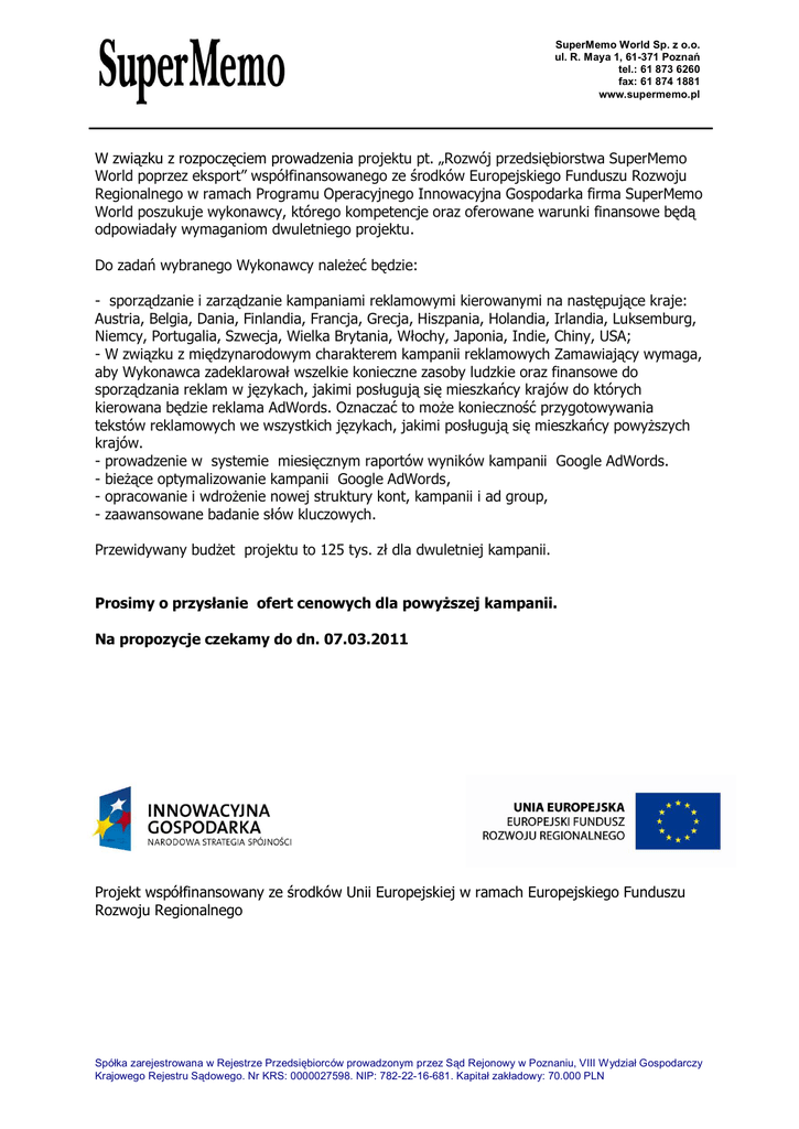 SuperMemo World Sp. z o.o. ul. R. Maya 1, 61-371 Poznań tel.: 61 873 6260 fax: 61 874 1881 www.supermemo.pl W związku z rozpoczęciem prowadzenia projektu pt. „Rozwój przedsiębiorstwa SuperMemo World poprzez eksport” współfinansowanego ze środków Europejskiego Funduszu Rozwoju Regionalnego w ramach Programu Operacyjnego Innowacyjna Gospodarka firma SuperMemo World poszukuje wykonawcy, którego kompetencje oraz oferowane warunki finansowe będą odpowiadały wymaganiom dwuletniego projektu. Do zadań wybranego Wykonawcy należeć będzie: - sporządzanie i zarządzanie kampaniami reklamowymi kierowanymi na następujące kraje: Austria, Belgia, Dania, Finlandia, Francja, Grecja, Hiszpania, Holandia, Irlandia, Luksemburg, Niemcy, Portugalia, Szwecja, Wielka Brytania, Włochy, Japonia, Indie, Chiny, USA; - W związku z międzynarodowym charakterem kampanii reklamowych Zamawiający wymaga, aby Wykonawca zadeklarował wszelkie konieczne zasoby ludzkie oraz finansowe do sporządzania reklam w językach, jakimi posługują się mieszkańcy krajów do których kierowana będzie reklama AdWords. Oznaczać to może konieczność przygotowywania tekstów reklamowych we wszystkich językach, jakimi posługują się mieszkańcy powyższych krajów. - prowadzenie w systemie miesięcznym raportów wyników kampanii Google AdWords. - bieżące optymalizowanie kampanii Google AdWords, - opracowanie i wdrożenie nowej struktury kont, kampanii i ad group, - zaawansowane badanie słów kluczowych. Przewidywany budżet projektu to 125 tys. zł dla dwuletniej kampanii. Prosimy o przysłanie ofert cenowych dla powyższej kampanii. Na propozycje czekamy do dn. 07.03.2011 Projekt współfinansowany ze środków Unii Europejskiej w ramach Europejskiego Funduszu Rozwoju Regionalnego Spółka zarejestrowana w Rejestrze Przedsiębiorców prowadzonym przez Sąd Rejonowy w Poznaniu, VIII Wydział Gospodarczy Krajowego Rejestru Sądowego. Nr KRS: 0000027598. NIP: 782-22-16-681. Kapitał zakładowy: 70.000 PLN