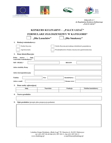 Europejski Fundusz Rolny na rzecz Rozwoju Obszarów Wiejskich Załącznik nr 1 do Regulaminu Konkursu Kulinarnego „PALCE LIZAĆ” KONKURS KULINARNY - „PALCE LIZAĆ” FORMULARZ ZGŁOSZENIOWY W KATEGORII* „Dla Łasuchów” 1. 2. „Dla Smakoszy” Rodzaj wnioskodawcy: Osoba fizyczna Osoba fizyczna prowadząca działalność gospodarczą Agroturystyka Przedsiębiorstwo branży turystyczno-gastronomicznej Dane identyfikacyjne Pełna nazwa / Imię i nazwisko wnioskodawcy* NIP / PESEL* REGON Adres siedziby firmy Adres korespondencyjny Telefon Fax Adres e-mail 3. Komórkowy Strona www Dane osoby zgłaszającej Imię Nazwisko 4. Nazwa produktu 5. Opis produktu (przepis plus propozycja podania) Funkcja Telefon kontaktowy Lokalna Grupa Działania „Białe Ługi” Pl. Staszica 6, 26-021 Daleszyce tel. (41) 307-26-44 lub (41) 307-20-11, fax (41) 307-20-11 www.bialelugi.pl e-mail:[email protected] Europejski Fundusz Rolny na rzecz Rozwoju Obszarów Wiejskich Opis produktu c.d. OŚWIADCZENIE Oświadczam, że zapoznałem/-am się z treścią i akceptuję Regulamin Konkursu Kulinarnego „PALCE LIZAĆ”. Oświadczam, że dane zawarte w powyższym Formularzu zgłoszeniowym są zgodne z prawdą. Wyrażam zgodę na przetwarzanie danych osobowych, tylko i wyłącznie do konkursowych (zgodnie z ustawą z dnia 29 sierpnia 1997 r. o Ochronie Danych Osobowych Dz.U. z 1997 r. nr 133 poz 833) Zobowiązuję/emy się do dostarczenia w dniu posiedzenia Komisji Konkursowej 10 porcji zgłaszanego produktu do degustacji. Miejscowość, data podpis osoby zgłaszającej * niepotrzebne skreślić Lokalna Grupa Działania „Białe Ługi” Pl. Staszica 6, 26-021 Daleszyce tel. (41) 307-26-44 lub (41) 307-20-11, fax (41) 307-20-11 www.bialelugi.pl e-mail:[email protected]