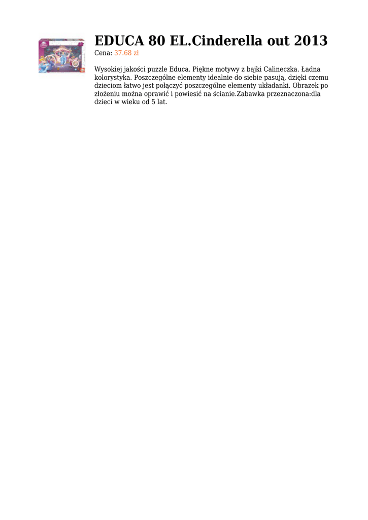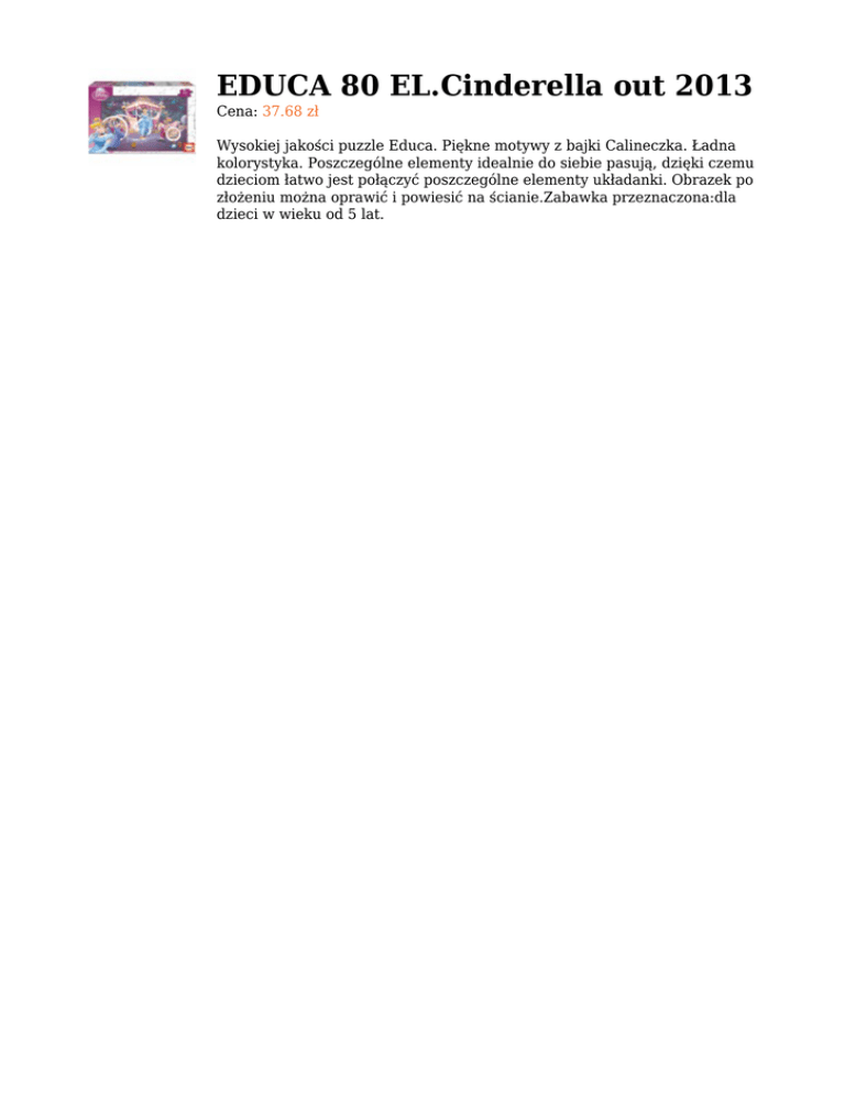 EDUCA 80 EL.Cinderella out 2013 Cena: 37.68 zł Wysokiej jakości puzzle Educa. Piękne motywy z bajki Calineczka. Ładna kolorystyka. Poszczególne elementy idealnie do siebie pasują, dzięki czemu dzieciom łatwo jest połączyć poszczególne elementy układanki. Obrazek po złożeniu można oprawić i powiesić na ścianie.Zabawka przeznaczona:dla dzieci w wieku od 5 lat.