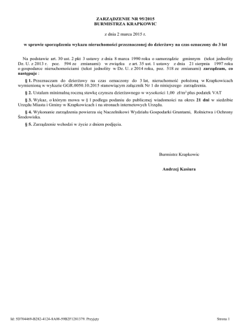 ZARZĄDZENIE NR 95/2015 BURMISTRZA KRAPKOWIC z dnia 2 marca 2015 r. w sprawie sporządzenia wykazu nieruchomości przeznaczonej do dzierżawy na czas oznaczony do 3 lat Na podstawie art. 30 ust. 2 pkt 3 ustawy z dnia 8 marca 1990 roku o samorządzie gminnym (tekst jednolity Dz. U. z 2013 r. poz. 594 ze zmianami) w związku z art. 35 ust. 1 ustawy z dnia 21 sierpnia 1997 roku o gospodarce nieruchomościami (tekst jednolity w Dz. U. z 2014 roku, poz. 518 ze zmianami) zarządzam, co następuje : § 1. Przeznaczam do dzierżawy na czas oznaczony do 3 lat, nieruchomość położoną w Krapkowicach wymienioną w wykazie GGR.0050.10.2015 stanowiącym załącznik Nr 1 do niniejszego zarządzenia. § 2. Ustalam minimalną roczną stawkę czynszu dzierżawnego w wysokości 1,00 zł/m2 plus podatek VAT § 3. Wykaz, o którym mowa w § 1 podlega podaniu do publicznej wiadomości na okres 21 dni w siedzibie Urzędu Miasta i Gminy w Krapkowicach i na stronach internetowych Urzędu. § 4. Wykonanie zarządzenia powierza się Naczelnikowi Wydziału Gospodarki Gruntami, Rolnictwa i Ochrony Środowiska. § 5. Zarządzenie wchodzi w życie z dniem podjęcia. Burmistrz Krapkowic Andrzej Kasiura Id: 5D704469-B282-4124-8A08-59B2F1281379. Przyjęty Strona 1 Załącznik Nr 1 do Zarządzenia Nr 95/2015 Burmistrza Krapkowic z dnia 02.03.2015 roku GGR.0050.10.2015 W y k a z nieruchomości przeznaczonej do dzierżawy na czas oznaczony do 3 lat Położenie L.p. Numer działki Karta mapy nieruchomości 1 Krapkowice 68/3 3 Powierzchnia działki w ha powierzchna części działki do dzierżawy m2 0,6600 ha (część o powierzchni 120 m2) Klasoużytek RIVB Nr Księgi Wieczystej 22442 (wolna od obciążeń) Przeznaczenie w mpzp ------------------------Sposób zagospodarowania Wysokość minimalnej rocznej stawki czynszu dzierżawnego w zł Tereny przemysłowe, produkcyjno-usługowe, bazy składowe, magazyny, usługi rzemieślnicze Teren zagospodarowany pod ogródek przydomowy 1,00 zł/m2 + 23% VAT (należność płatna z góry za dany rok do 31 marca każdego roku) Niniejszy wykaz zostaje wywieszony na tablicy ogłoszeń na okres 21 dni w siedzibie Urzędu Miasta i Gminy w Krapkowicach przy ul. 3 Maja 17 i 21 oraz na stronach internetowych. Id: 5D704469-B282-4124-8A08-59B2F1281379. Przyjęty Strona 2