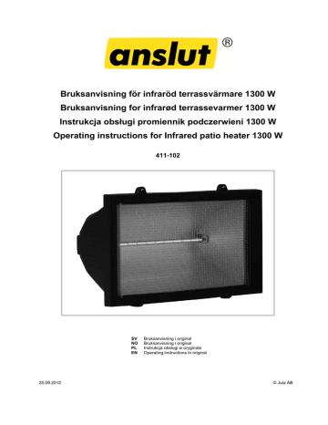 Bruksanvisning för infraröd terrassvärmare 1300 W Bruksanvisning for infrarød terrassevarmer 1300 W Instrukcja obsługi promiennik podczerwieni 1300 W Operating instructions for Infrared patio heater 1300 W 411-102 SV NO PL EN 25.09.2012 Bruksanvisning i original Bruksanvisning i original Instrukcja obsługi w oryginale Operating instructions in original © Jula AB SVENSKA SVENSKA SÄKERHETSANVISNINGAR Läs bruksanvisningen noggrant innan användning! Läs dessa anvisningar noga före användning och spara dem för framtida behov. Kontakta behörig elektriker om du är osäker. Ändra aldrig produkten på något sätt – risk för person- eller egendomsskada. Kontrollera att nätspänningen motsvarar märkspänningen på typskylten. Kontrollera att produkten är monterad på säkert sätt och sitter stadigt i hållaren. Dra ut sladden och låt apparaten svalna före montering, rengöring och/eller byte av värmeelement. Vidrör inte i halogenröret med bara händer. Om halogenröret vidrörs av misstag ska eventuella fingeravtryck torkas bort en mjuk trasa fuktad med sprit. Annars kan fingeravtrycken på röret bränna fast, vilket förkortar värmarens livslängd. Värmaren får inte placeras nedanför nätuttag. Vidrör inte skyddsglaset i onödan, för att undvika fettbeläggningar. Håll sladden på avstånd från värmaren, som blir varm under användning. Täck inte över värmaren när den är påslagen och ställ inga föremål framför den. Om sladden är skadad ska den bytas ut av behörig servicerepresentant eller annan kvalificerad person, för att undvika fara. Apparaten är inte avsedd att användas av personer (barn eller vuxna) med någon typ av funktionshinder eller av personer som inte har tillräcklig erfarenhet eller kunskap för att använda den, såvida de inte har fått anvisningar gällande användande av apparaten av någon med ansvar för deras säkerhet. Barn ska hållas under uppsikt så att de inte leker med apparaten. För aldrig in några föremål i apparatens öppningar. Använd inte apparaten om skyddsglaset är sprucket. Glasets insida och/eller reflektorn kan ha mjölkaktig beläggning. Detta orsakas av ångor och är helt normalt. Du kan avlägsna beläggningen genom att öppna den främre luckan och rengöra glas och reflektor med en torr, luddfri trasa. LÅT VÄRMAREN SVALNA I MINST 30 MINUTER FÖRE BYTE AV HALOGENRÖR. Dra alltid ut sladden före rengöring. Brandrisk Terrassvärmaren får inte placeras närmare möbler, gardiner och annat brännbart material än 1 meter på sidorna och/eller baksidan. Om värmaren ska användas utomhus ska den anslutas till nätuttag godkänt för utomhusbruk eller till nätuttag inomhus. 2 SVENSKA TEKNISKA DATA Märkspänning Effekt Ström Skyddsklass Kapslingsklass Sockel Vikt Minsta avstånd från golv Minsta avstånd från tak Minsta avstånd från sidovägg 230 V ~ 50 Hz 1300 W 5,7 A I IP23 R7s 3 kg 2,5 m 0,5 m 1,0 m MONTERING Elinstallation Apparaten måste vara jordad. Följ alltid gällande regler vid elarbete. Fast installation ska utföras av behörig elektriker. Om värmaren ska användas utomhus ska den anslutas till nätuttag godkänt för utomhusbruk eller till nätuttag inomhus. Kontakta behörig elektriker om du är osäker. Rätten till ändringar förbehålles. Vid eventuella problem, kontakta vår serviceavdelning på telefon 0200-88 55 88. Jula AB, Box 363, 532 24 SKARA www.jula.se 3 NORSK NORSK SIKKERHETSANVISNINGER Les bruksanvisningen nøye før bruk! Les disse anvisningene nøye før bruk, og ta vare på dem for fremtidig behov. Kontakt godkjent elektriker hvis du er usikker. Endre aldri produktet på noen måte – fare for person- eller eiendomsskade. Kontroller at nettspenningen stemmer overens med merkespenningen på typeskiltet. Kontroller at produktet er montert på en trygg måte og sitter godt i holderen. Trekk ut støpselet og la apparatet kjøle seg ned før montering, rengjøring og/eller bytte av varmeelement. Ikke berør halogenrøret med bare hender. Hvis halogenrøret berøres ved en feiltakelse, skal eventuelle fingeravtrykk tørkes bort med en myk klut fuktet med sprit. Ellers kan fingeravtrykkene på røret brenne fast, noe som forkorter varmerens levetid. Varmeren må ikke plasseres under et nettuttak. Ikke berør beskyttelsesglasset unødig. Dette for å unngå fettbelegg. Hold ledningen på avstand fra varmeren, som blir varm under bruk. Ikke dekk til varmeren når den er på, og ikke sett gjenstander foran den. Hvis ledningen er skadet, må den byttes ut av godkjent servicerepresentant eller en annen godkjent fagperson for å unngå fare. Apparatet er ikke beregnet på bruk av personer (barn eller voksne) med funksjonshemminger eller av personer uten tilstrekkelig erfaring med eller kunnskap i å bruke det, med mindre de har fått anvisninger om bruk av apparatet av noen som er ansvarlig for deres sikkerhet. Barn skal holdes under oppsyn, slik at de ikke leker med apparatet. Stikk aldri gjenstander inn i apparatets åpninger. Ikke bruk apparatet hvis beskyttelsesglasset er sprukket. Innsiden av glasset og/eller reflektoren kan ha et melkeaktig belegg. Dette kommer av damp og er helt normalt. Du kan fjerne belegget ved å åpne den fremre luken og rengjøre glass og reflektor med en tørr klut som ikke loer. LA VARMEREN KJØLE SEG NED I MINST 30 MINUTTER FØR BYTTE AV HALOGENRØR. Trekk alltid ut støpselet før rengjøring. Brannrisiko Terrassevarmeren må ikke plasseres nærmere møbler, gardiner og annet brennbart materiale enn 1 meter på sidene og/eller baksiden. Hvis varmeren skal brukes utendørs, skal den kobles til et nettuttak som er godkjent for utendørsbruk, eller til et nettuttak innendørs. 4 NORSK TEKNISKE DATA Merkespenning Effekt Strøm Beskyttelsesklasse Kapslingsklasse Sokkel Vekt Minste avstand fra gulv Minste avstand fra tak Minste avstand fra sidevegg 230 V ~ 50 Hz 1300 W 5,7 A I IP23 R7s 3 kg 2,5 m 0,5 m 1,0 m MONTERING El-installasjon Appar