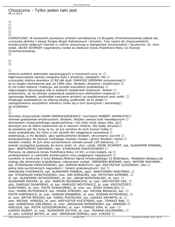 KURZYMSKI, st. szer. PIOTR SZWACIŃSKI, st. chor. szt. JÓZEF KOWALSKI, chor. PAWEŁ RUTKIEWICZ, kpr. PAWEŁ STROJNY, kpr. MICHAŁ BOSACKI, kpr. PIOTR KARPOWICZ, st. szer. ADRIAN GRABAREK, st. szer. DORIAN RUTKOWSKI, st. szer. ARTUR RESZKO, kpr. KAROL PUSTELNIK, kpr. ŁUKASZ SAFARYN, st. szer. MICHAŁ HOROSZ, st. szer. KRZYSZTOF KUCZYŃSKI, szer. TOMASZ BĄK, szer. AGNIESZKA ZIELIŃSKA, st. chor. JAROSŁAW WIŚNIEWSKI, kpr. ANDRZEJ WIELGUS, kpr. PIOTR SZOSZOROWSKI, st. szer. TOMASZ SIPA, st. szer. ŁUKASZ EGIERT, st. szer. SŁAWOMIR ZATYKA, st. szer. JOANNA KACZMAREK, st. szer. ŁUKASZ BATKO, st. szer. JAROSŁAW GÓRSKI, szer. ŁUKASZ http://www.choszczno.pl