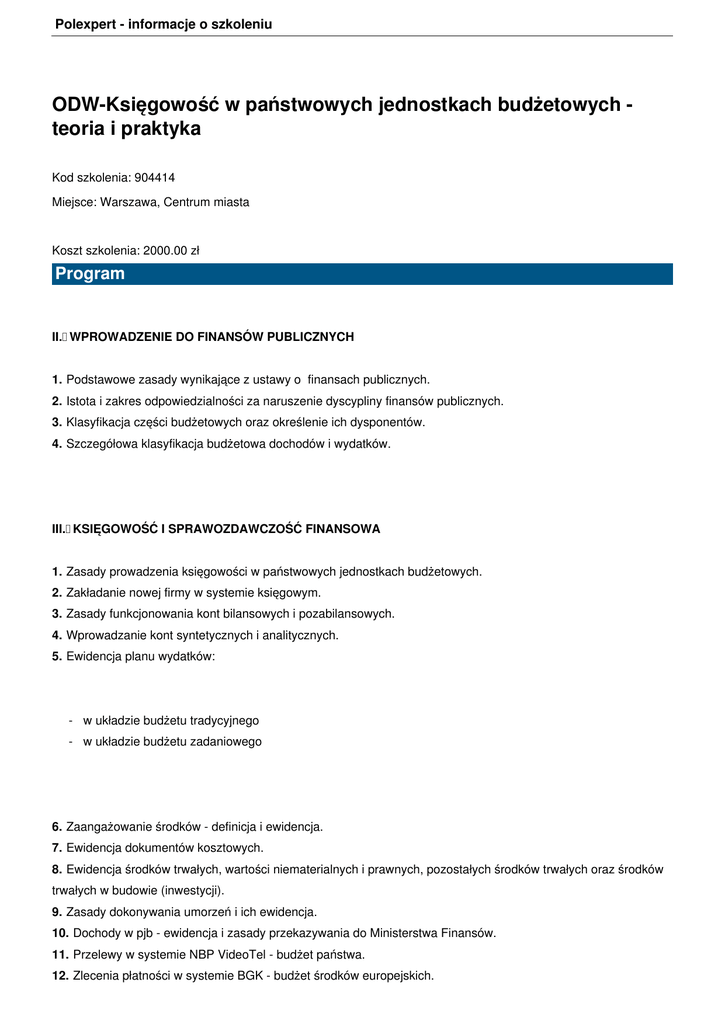 Polexpert - informacje o szkoleniu ODW-Księgowość w państwowych jednostkach budżetowych teoria i praktyka Kod szkolenia: 904414 Miejsce: Warszawa, Centrum miasta Koszt szkolenia: 2000.00 zł Program II. WPROWADZENIE DO FINANSÓW PUBLICZNYCH 1. Podstawowe zasady wynikające z ustawy o finansach publicznych. 2. Istota i zakres odpowiedzialności za naruszenie dyscypliny finansów publicznych. 3. Klasyfikacja części budżetowych oraz określenie ich dysponentów. 4. Szczegółowa klasyfikacja budżetowa dochodów i wydatków. III. KSIĘGOWOŚĆ I SPRAWOZDAWCZOŚĆ FINANSOWA 1. Zasady prowadzenia księgowości w państwowych jednostkach budżetowych. 2. Zakładanie nowej firmy w systemie księgowym. 3. Zasady funkcjonowania kont bilansowych i pozabilansowych. 4. Wprowadzanie kont syntetycznych i analitycznych. 5. Ewidencja planu wydatków: - w układzie budżetu tradycyjnego - w układzie budżetu zadaniowego 6. Zaangażowanie środków - definicja i ewidencja. 7. Ewidencja dokumentów kosztowych. 8. Ewidencja środków trwałych, wartości niematerialnych i prawnych, pozostałych środków trwałych oraz środków trwałych w budowie (inwestycji). 9. Zasady dokonywania umorzeń i ich ewidencja. 10. Dochody w pjb - ewidencja i zasady przekazywania do Ministerstwa Finansów. 11. Przelewy w systemie NBP VideoTel - budżet państwa. 12. Zlecenia płatności w systemie BGK - budżet środków europejskich. Polexpert - informacje o szkoleniu 13. Ewidencja wyciągów bankowych: dochody, wydatki, ZFŚS, depozyty. 14. Ewidencja wydatków na kontach pozabilansowych dotyczących planu i zaangażowania. 15. Ewidencja wydatków strukturalnych. 16. Analiza kont bilansowych, w szczególności rozrachunkowych. 17. Analiza kont pozabilansowych, w szczególności w zakresie planu, wykonania i zaangażowania. 18. Przeksięgowania i przygotowanie do zamknięcia roku obrotowego. 19. Sprawozdawczość finansowa: - bilans - rachunek zysków i strat - zestawienie zmian w funduszu 20. Sprawozdawczość finansowa w systemie MF TREZOR. Prowadzący