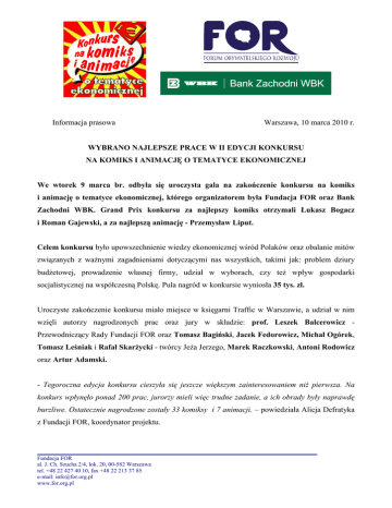 Informacja prasowa Warszawa, 10 marca 2010 r. WYBRANO NAJLEPSZE PRACE W II EDYCJI KONKURSU NA KOMIKS I ANIMACJĘ O TEMATYCE EKONOMICZNEJ We wtorek 9 marca br. odbyła się uroczysta gala na zakończenie konkursu na komiks i animację o tematyce ekonomicznej, którego organizatorem była Fundacja FOR oraz Bank Zachodni WBK. Grand Prix konkursu za najlepszy komiks otrzymali Łukasz Bogacz i Roman Gajewski, a za najlepszą animację - Przemysław Liput. Celem konkursu było upowszechnienie wiedzy ekonomicznej wśród Polaków oraz obalanie mitów związanych z waŜnymi zagadnieniami dotyczącymi nas wszystkich, takimi jak: problem dziury budŜetowej, prowadzenie własnej firmy, udział w wyborach, czy teŜ wpływ gospodarki socjalistycznej na współczesną Polskę. Pula nagród w konkursie wyniosła 35 tys. zł. Uroczyste zakończenie konkursu miało miejsce w księgarni Traffic w Warszawie, a udział w nim wzięli autorzy nagrodzonych prac oraz jury w składzie: prof. Leszek Balcerowicz Przewodniczący Rady Fundacji FOR oraz Tomasz Bagiński, Jacek Fedorowicz, Michał Ogórek, Tomasz Leśniak i Rafał SkarŜycki - twórcy JeŜa Jerzego, Marek Raczkowski, Antoni Rodowicz oraz Artur Adamski. - Tegoroczna edycja konkursu cieszyła się jeszcze większym zainteresowaniem niŜ pierwsza. Na konkurs wpłynęło ponad 200 prac, jurorzy mieli więc trudne zadanie, a ich obrady były naprawdę burzliwe. Ostatecznie nagrodzone zostały 33 komiksy i 7 animacji. – powiedziała Alicja Defratyka z Fundacji FOR, koordynator projektu. Fundacja FOR al. J. Ch. Szucha 2/4, lok. 20, 00-582 Warszawa tel. +48 22 427 40 10, fax +48 22 213 37 85 e-mail: [email protected] www.for.org.pl Nagrody przyznane zostały w dwóch kategoriach: komiks i animacja. W obu kategoriach za I miejsce przyznano nagrody w wysokości 5 tys. zł zł, za II miejsce – 3 tys. zł, za III miejsce – 2 tys. zł. Nagrody pienięŜne zostały przekazane nagrodzonym osobom w formie kart prepaidowych Banku Zachodniego WBK z logotypami konkursu oraz Fundacji FOR. Grand Prix za najlepszy komiks otrzymali Łukasz Bogacz (scenariusz) i Roman Gajewski (rysunki). Drugą nagrodę otrzymał Maciej Trzepałka, a trzecią - Michał Drabik. I miejsce (Łukasz Bogacz i Roman Gajewski) II miejsce (Maciej Trzepałka) III miejsce (Michał Drabik) Dodatkowo nagrodzone zostały najlepsze komiksy w kaŜdej kategorii tematycznej (nagrody w wysokości 1 tys. zł). Największe uznanie jury w kategorii „Skąd się bierze dziura budŜetowa? czyli problemy finansów publicznych w Polsce” zdobył Tomasz Bereźnicki. W kategorii „Korzyści z prowadzenia własnej firmy/Trudności w zakładaniu własnej firmy” autorką najlepszej pracy okazała się Emilia Jaroszewska. W kategorii „Dlaczego warto brać udział w wyborach?” zwycięŜył Marek Regner, w kategorii „Socjalizm czyli gospodarcza droga donikąd” główną nagrodę zdobyły ex eaquo dwie prace: Łukasza Majewskiego oraz Macieja Jasińskiego i Jakuba Mathia. 2 Fundacja FOR al. J. Ch. Szucha 2/4, lok. 20, 00-582 Warszawa kom. +48 691 232 994 e-mail: [email protected] www.for.org.pl KaŜdy z członków jury przyznał równieŜ nagrodę dla komiksu, który chciał w szczególny sposób wyróŜnić. Autorzy wybranych prac otrzymali nagrody rzeczowe. Prof. Leszek Balcerowicz nagrodził pracę Piotra Getlera, Tomasz Bagiński wyróŜnił pracę Macieja Jasińskiego i Jakuba Mathia, Jackowi Fedorowiczowi najbardziej podobał się komiks Konrada i Artura Ganczarków, Michał Ogórek wyróŜnił Magdalenę Grudowską, Tomasz Leśniak - Piotra Perłowskiego, a Rafał SkarŜycki – Łukasza Majewskiego. Nagrodę Marka Raczkowskiego otrzymała Emilia Jaroszewska, Antoni Rodowicz wyróŜnił komiks Macieja Jasińskiego i Jakuba Mathia, a Artur Adamski - pracę Ingi Widlińskiej. Za komiksy w kategorii wiekowej do lat 16 trzy równorzędne nagrody w wysokości 1 tys. zł otrzymały: Katarzyna Wymazał, Maja Jaroszkowska oraz Maria Kąpa. Grand Prix za najlepszą animację otrzymał Przemysław Liput, drugie miejsce zajął Michał Jaszowski, a trzecie - Bartosz Słomka. Wszystkie nagrodzone komiksy i animacje są dostępne w formie elektronicznej na stronie www.for.org.pl, http://www.for.org.pl/pl/konkurs-na-komiks-2010 Prace zostaną opublikowane w zbiorczej antologii, a animacje wydane na płytach DVD. Patroni Konkursu: Wyborcza.pl, Wyborcza.biz, Metro, Ośrodek Rozwoju Edukacji, Gildia.pl, Aleja Komiksu, Korba.pl, TOK FM, TVN24.pl. Wsparcie Public Relations: Ciszewski Financial Communications Dodatkowych informacji udziela: Alicja Defratyka Koordynator Projektu Fundacja FOR tel. +48 22 427 40 12, 601 717 192 e-mail: [email protected] 3 Fundacja FOR al. J. Ch. Szucha 2/4, lok. 20, 00-582 Warszawa kom. +48 691 232 994 e-mail: [email protected] www.for.org.pl