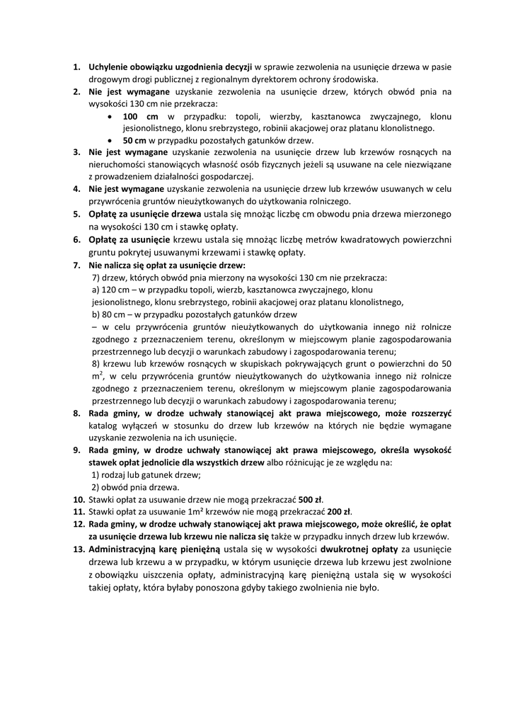 1. Uchylenie obowiązku uzgodnienia decyzji w sprawie zezwolenia na usunięcie drzewa w pasie drogowym drogi publicznej z regionalnym dyrektorem ochrony środowiska. 2. Nie jest wymagane uzyskanie zezwolenia na usunięcie drzew, których obwód pnia na wysokości 130 cm nie przekracza: 100 cm w przypadku: topoli, wierzby, kasztanowca zwyczajnego, klonu jesionolistnego, klonu srebrzystego, robinii akacjowej oraz platanu klonolistnego. 50 cm w przypadku pozostałych gatunków drzew. 3. Nie jest wymagane uzyskanie zezwolenia na usunięcie drzew lub krzewów rosnących na nieruchomości stanowiących własność osób fizycznych jeżeli są usuwane na cele niezwiązane z prowadzeniem działalności gospodarczej. 4. Nie jest wymagane uzyskanie zezwolenia na usunięcie drzew lub krzewów usuwanych w celu przywrócenia gruntów nieużytkowanych do użytkowania rolniczego. 5. Opłatę za usunięcie drzewa ustala się mnożąc liczbę cm obwodu pnia drzewa mierzonego na wysokości 130 cm i stawkę opłaty. 6. Opłatę za usunięcie krzewu ustala się mnożąc liczbę metrów kwadratowych powierzchni gruntu pokrytej usuwanymi krzewami i stawkę opłaty. 7. Nie nalicza się opłat za usunięcie drzew: 7) drzew, których obwód pnia mierzony na wysokości 130 cm nie przekracza: a) 120 cm – w przypadku topoli, wierzb, kasztanowca zwyczajnego, klonu jesionolistnego, klonu srebrzystego, robinii akacjowej oraz platanu klonolistnego, b) 80 cm – w przypadku pozostałych gatunków drzew – w celu przywrócenia gruntów nieużytkowanych do użytkowania innego niż rolnicze zgodnego z przeznaczeniem terenu, określonym w miejscowym planie zagospodarowania przestrzennego lub decyzji o warunkach zabudowy i zagospodarowania terenu; 8) krzewu lub krzewów rosnących w skupiskach pokrywających grunt o powierzchni do 50 m2, w celu przywrócenia gruntów nieużytkowanych do użytkowania innego niż rolnicze zgodnego z przeznaczeniem terenu, określonym w miejscowym planie zagospodarowania przestrzennego lub decyzji o warunkach zabudowy i zagospodarowania terenu; 8. Rada gminy, w drodze uchwały stanowiącej akt prawa miejscowego, może rozszerzyć katalog wyłączeń w stosunku do drzew lub krzewów na których nie będzie wymagane uzyskanie zezwolenia na ich usunięcie. 9. Rada gminy, w drodze uchwały stanowiącej akt prawa miejscowego, określa wysokość stawek opłat jednolicie dla wszystkich drzew albo różnicując je ze względu na: 1) rodzaj lub gatunek drzew; 2) obwód pnia drzewa. 10. Stawki opłat za usuwanie drzew nie mogą przekraczać 500 zł. 11. Stawki opłat za usuwanie 1m² krzewów nie mogą przekraczać 200 zł. 12. Rada gminy, w drodze uchwały stanowiącej akt prawa miejscowego, może określić, że opłat za usunięcie drzewa lub krzewu nie nalicza się także w przypadku innych drzew lub krzewów. 13. Administracyjną karę pieniężną ustala się w wysokości dwukrotnej opłaty za usunięcie drzewa lub krzewu a w przypadku, w którym usunięcie drzewa lub krzewu jest zwolnione z obowiązku uiszczenia opłaty, administracyjną karę pieniężną ustala się w wysokości takiej opłaty, która byłaby ponoszona gdyby takiego zwolnienia nie było.