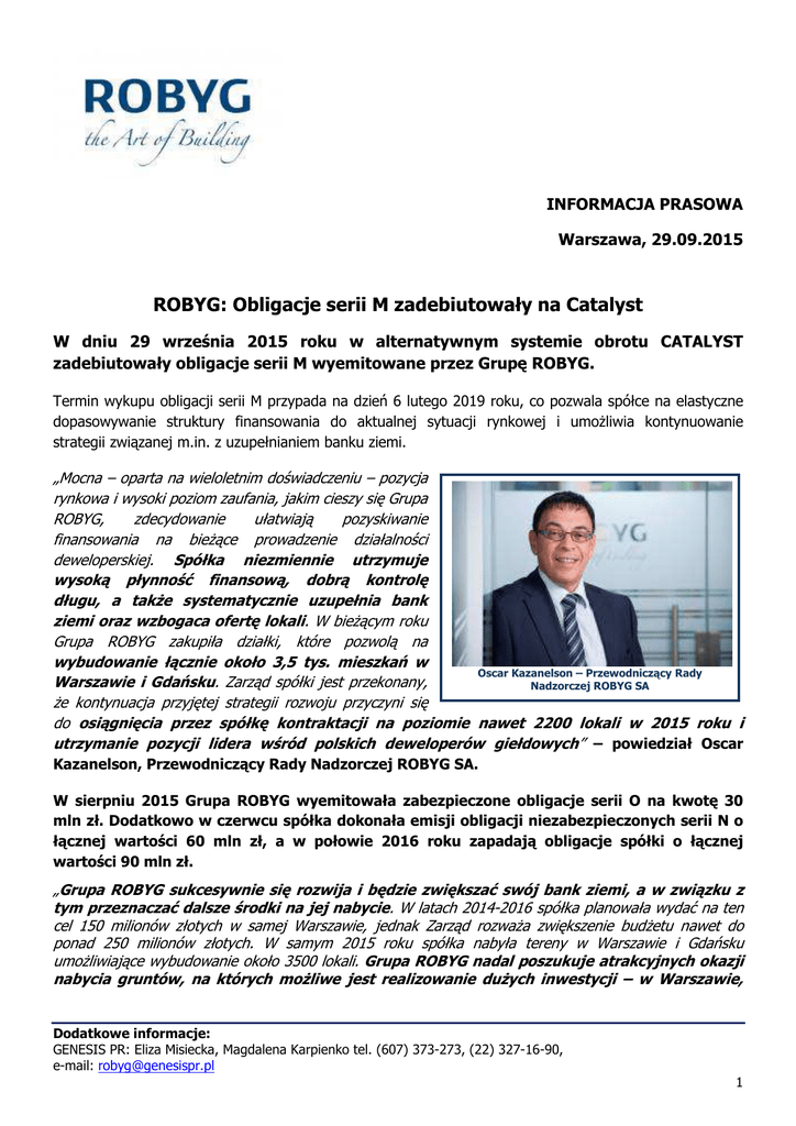 INFORMACJA PRASOWA Warszawa, 29.09.2015 ROBYG: Obligacje serii M zadebiutowały na Catalyst W dniu 29 września 2015 roku w alternatywnym systemie obrotu CATALYST zadebiutowały obligacje serii M wyemitowane przez Grupę ROBYG. Termin wykupu obligacji serii M przypada na dzień 6 lutego 2019 roku, co pozwala spółce na elastyczne dopasowywanie struktury finansowania do aktualnej sytuacji rynkowej i umoŜliwia kontynuowanie strategii związanej m.in. z uzupełnianiem banku ziemi. „Mocna – oparta na wieloletnim doświadczeniu – pozycja rynkowa i wysoki poziom zaufania, jakim cieszy się Grupa ROBYG, zdecydowanie ułatwiają pozyskiwanie finansowania na bieŜące prowadzenie działalności deweloperskiej. Spółka niezmiennie utrzymuje wysoką płynność finansową, dobrą kontrolę długu, a takŜe systematycznie uzupełnia bank ziemi oraz wzbogaca ofertę lokali. W bieŜącym roku Grupa ROBYG zakupiła działki, które pozwolą na wybudowanie łącznie około 3,5 tys. mieszkań w Oscar Kazanelson – Przewodniczący Rady Warszawie i Gdańsku. Zarząd spółki jest przekonany, Nadzorczej ROBYG SA Ŝe kontynuacja przyjętej strategii rozwoju przyczyni się do osiągnięcia przez spółkę kontraktacji na poziomie nawet 2200 lokali w 2015 roku i utrzymanie pozycji lidera wśród polskich deweloperów giełdowych” – powiedział Oscar Kazanelson, Przewodniczący Rady Nadzorczej ROBYG SA. W sierpniu 2015 Grupa ROBYG wyemitowała zabezpieczone obligacje serii O na kwotę 30 mln zł. Dodatkowo w czerwcu spółka dokonała emisji obligacji niezabezpieczonych serii N o łącznej wartości 60 mln zł, a w połowie 2016 roku zapadają obligacje spółki o łącznej wartości 90 mln zł. „Grupa ROBYG sukcesywnie się rozwija i będzie zwiększać swój bank ziemi, a w związku z tym przeznaczać dalsze środki na jej nabycie. W latach 2014-2016 spółka planowała wydać na ten cel 150 milionów złotych w samej Warszawie, jednak Zarząd rozwaŜa zwiększenie budŜetu nawet do ponad 250 milionów złotych. W samym 2015 roku spółka nabyła tereny w Warszawie i Gdańsku umoŜliwiające wybudowanie około 3500 lokali. Grupa ROBYG nadal poszukuje atrakcyjnych okazji nabycia gruntów, na których moŜliwe jest realizowanie duŜych inwestycji – w Warszawie, Dodatkowe informacje: GENESIS PR: Eliza Misiecka, Magdalena Karpienko tel. (607) 373-273, (22) 327-16-90, e-mail: [email protected] 1 pozwalających na wybudowanie około 2,5 tysiąca mieszkań, a w Gdańsku na 1,5 tysiąca mieszkań” – powiedział Oscar Kazanelson, Przewodniczący Rady Nadzorczej ROBYG SA. W 2015 roku Grupa ROBYG nabyła lub podpisała umowy przedwstępne nabycia w Warszawie i Gdańsku 6 terenów inwestycyjnych za łączną kwotę ok. 130 mln zł: • na warszawskim Bemowie, 3 działki o łącznej powierzchni ponad 81 tys. mkw., które pozwolą na wybudowanie ok. 1650 lokali mieszkalnych i komercyjnych; • w warszawskim Ursusie, działkę o łącznej powierzchni około 5,3 ha, która pozwoli na wybudowanie około 950 mieszkań; • w gdańskich dzielnicach Morena i Zaspa, 2 działki o łącznej powierzchni ok. 3,16 ha. Grupa ROBYG osiągnęła w I półroczu 2015 roku przychody w wysokości 141 mln zł. W tym okresie poziom kontraktacji spółki wyniósł 1131 lokali (z uwzględnieniem rezygnacji), co oznacza ok. 7% wzrost w stosunku do analogicznego okresu w 2014 roku. Zysk netto spółki wyniósł 18 mln zł, natomiast ekonomiczny zysk netto Grupy ROBYG – 24 mln zł. W I półroczu 2015 roku spółka odnotowała równieŜ wzrost marŜy zysku netto, która wyniosła 13% – w I półroczu 2014 wynosiła 9%. Dodatkowo spółka regularnie powiększa bank ziemi w Warszawie i Gdańsku – tegoroczne transakcje umoŜliwią wybudowanie około 3400 lokali. Od debiutu na Giełdzie Papierów Wartościowych w Warszawie w 2010 roku ROBYG SA regularnie dzieli się zyskiem z akcjonariuszami. Dotychczas spółka wypłaciła w ramach dywidendy: • • • • • z zysku za 2010 rok w wysokości 0,07 zł na akcję, co stanowiło 27 % zysku ekonomicznego netto z zysku za 2011 rok w wysokości 0,12 zł na akcję, co stanowiło ponad 78% zysku ekonomicznego netto z zysku za 2012 rok w wysokości 0,08 zł na akcję, co stanowiło niemal 31% zysku ekonomicznego netto z zysku za 2013 rok w wysokości 0,08 zł na akcję, co stanowiło około 30% zysku ekonomicznego netto z zysku za 2014 w wysokości 0,11 zł na akcję, co stanowiło około 37% zysku ekonomicznego netto Więcej informacji www.robyg.pl Dodatkowe informacje: GENESIS PR: Eliza Misiecka, Magdalena Karpienko tel. (607) 373-273, (22) 327-16-90, e-mail: [email protected] 2