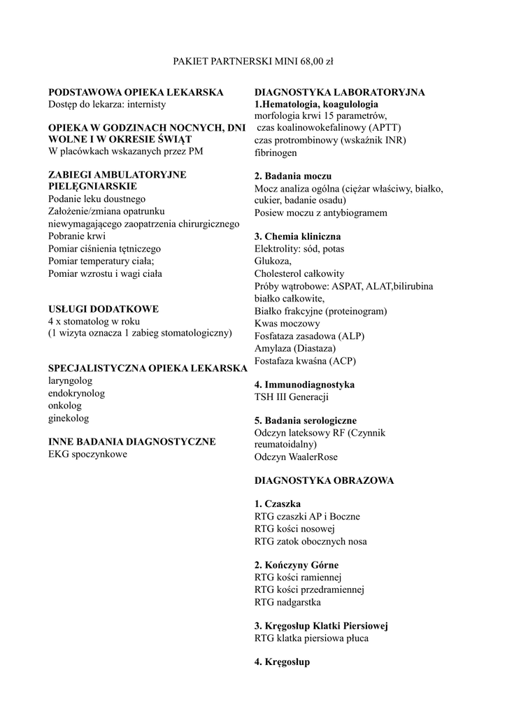 PAKIET PARTNERSKI MINI 68,00 zł PODSTAWOWA OPIEKA LEKARSKA Dostęp do lekarza: internisty DIAGNOSTYKA LABORATORYJNA 1.Hematologia, koagulologia morfologia krwi 15 parametrów, OPIEKA W GODZINACH NOCNYCH, DNI czas koalinowokefalinowy (APTT) WOLNE I W OKRESIE ŚWIĄT czas protrombinowy (wskaźnik INR) W placówkach wskazanych przez PM fibrinogen ZABIEGI AMBULATORYJNE PIELĘGNIARSKIE Podanie leku doustnego Założenie/zmiana opatrunku niewymagającego zaopatrzenia chirurgicznego Pobranie krwi Pomiar ciśnienia tętniczego Pomiar temperatury ciała; Pomiar wzrostu i wagi ciała USŁUGI DODATKOWE 4 x stomatolog w roku (1 wizyta oznacza 1 zabieg stomatologiczny) SPECJALISTYCZNA OPIEKA LEKARSKA laryngolog endokrynolog onkolog ginekolog INNE BADANIA DIAGNOSTYCZNE EKG spoczynkowe 2. Badania moczu Mocz analiza ogólna (ciężar właściwy, białko, cukier, badanie osadu) Posiew moczu z antybiogramem 3. Chemia kliniczna Elektrolity: sód, potas Glukoza, Cholesterol całkowity Próby wątrobowe: ASPAT, ALAT,bilirubina białko całkowite, Białko frakcyjne (proteinogram) Kwas moczowy Fosfataza zasadowa (ALP) Amylaza (Diastaza) Fostafaza kwaśna (ACP) 4. Immunodiagnostyka TSH III Generacji 5. Badania serologiczne Odczyn lateksowy RF (Czynnik reumatoidalny) Odczyn WaalerRose DIAGNOSTYKA OBRAZOWA 1. Czaszka RTG czaszki AP i Boczne RTG kości nosowej RTG zatok obocznych nosa 2. Kończyny Górne RTG kości ramiennej RTG kości przedramiennej RTG nadgarstka 3. Kręgosłup Klatki Piersiowej RTG klatka piersiowa płuca 4. Kręgosłup RTG kręgosłupa LS 5. Ultrasonografia USG jamy brzusznej USG ginekologiczne