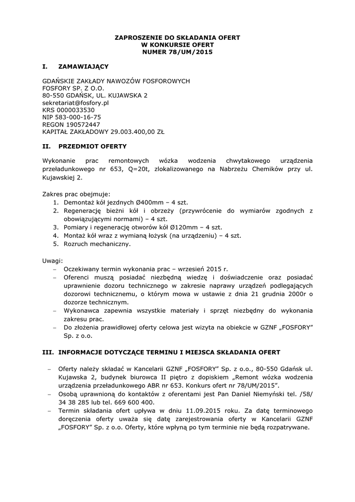 ZAPROSZENIE DO SKŁADANIA OFERT W KONKURSIE OFERT NUMER 78/UM/2015 I. ZAMAWIAJĄCY GDAŃSKIE ZAKŁADY NAWOZÓW FOSFOROWYCH FOSFORY SP. Z O.O. 80-550 GDAŃSK, UL. KUJAWSKA 2 [email protected] KRS 0000033530 NIP 583-000-16-75 REGON 190572447 KAPITAŁ ZAKŁADOWY 29.003.400,00 ZŁ II. PRZEDMIOT OFERTY Wykonanie prac remontowych wózka wodzenia chwytakowego urządzenia przeładunkowego nr 653, Q=20t, zlokalizowanego na Nabrzeżu Chemików przy ul. Kujawskiej 2. Zakres prac obejmuje: 1. Demontaż kół jezdnych Ø400mm – 4 szt. 2. Regenerację bieżni kół i obrzeży (przywrócenie do wymiarów zgodnych z obowiązującymi normami) – 4 szt. 3. Pomiary i regenerację otworów kół Ø120mm – 4 szt. 4. Montaż kół wraz z wymianą łożysk (na urządzeniu) – 4 szt. 5. Rozruch mechaniczny. Uwagi: − Oczekiwany termin wykonania prac – wrzesień 2015 r. − Oferenci muszą posiadać niezbędną wiedzę i doświadczenie oraz posiadać uprawnienie dozoru technicznego w zakresie naprawy urządzeń podlegających dozorowi technicznemu, o którym mowa w ustawie z dnia 21 grudnia 2000r o dozorze technicznym. − Wykonawca zapewnia wszystkie materiały i sprzęt niezbędny do wykonania zakresu prac. − Do złożenia prawidłowej oferty celowa jest wizyta na obiekcie w GZNF „FOSFORY” Sp. z o.o. III. INFORMACJE DOTYCZĄCE TERMINU I MIEJSCA SKŁADANIA OFERT − − − Oferty należy składać w Kancelarii GZNF „FOSFORY” Sp. z o.o., 80-550 Gdańsk ul. Kujawska 2, budynek biurowca II piętro z dopiskiem „Remont wózka wodzenia urządzenia przeładunkowego ABR nr 653. Konkurs ofert nr 78/UM/2015”. Osobą uprawnioną do kontaktów z oferentami jest Pan Daniel Niemyński tel. /58/ 34 38 285 lub tel. 669 600 400. Termin składania ofert upływa w dniu 11.09.2015 roku. Za datę terminowego doręczenia oferty uważa się datę zarejestrowania oferty w Kancelarii GZNF „FOSFORY” Sp. z o.o. Oferty, które wpłyną po tym terminie nie będą rozpatrywane. IV. KRYTERIA OCENY SPEŁNIENIA DOSTAWCÓW/WYKONAWCÓW L.p. 1. 2. 3. 4. V. WARUNKÓW Kryteria Cena Czas realizacji Referencje Wiarygodność w ocenie członków Komisji WYMAGANYCH OD Znaczenie 70% 10% 10% 10% OFERTA POWINNA ZAWIERAĆ −Szczegółowy zakres prac. −Zestawienie materiałów. −Termin wykonania prac. −Cenę ofertową za wykonanie kompletnego zakresu robót. −Warunki płatności. −Warunki gwarancyjne. −Informację o posiadanych kwalifikacjach. −Referencje lub informacje o wykonanych pracach podobnego typu. VI. WYMAGANE ZAŁĄCZNIKI Kserokopia dokumentu rejestrowego oferenta. Kserokopia numeru NIP, REGON. Kserokopia uprawnienia dozoru technicznego. Dokumenty pozwalające ocenić wiarygodność techniczną i ekonomiczną oferenta (np. kadra techniczna, sprzęt, uprawnienia, itp.). − Oświadczenie o sytuacji finansowej zapewniającej wykonanie zamówienia. − Oświadczenie o braku wszczęcia w stosunku do oferenta postępowania upadłościowego lub układowego. − Oświadczenie o nie zaleganiu z uiszczaniem podatków, opłat lub składek na ubezpieczenia społeczne. − − − − VII. UWAGI KOŃCOWE − Wszystkie dokumenty ofertowe muszą być podpisane przez osoby uprawnione do reprezentowania firmy. − W przypadku zawarcia umowy deklarowane parametry rozliczeń nie będą podlegały zmianie przez cały jej okres działania. − W przypadku wątpliwości lub koniecznych uzupełnień po otwarciu ofert zastrzega się prawo do przeprowadzenia rozmów uzupełniających i ewentualnych negocjacji lub do zamknięcia konkursu ofert bez dokonania wyboru którejkolwiek z ofert bez podania przyczyny.