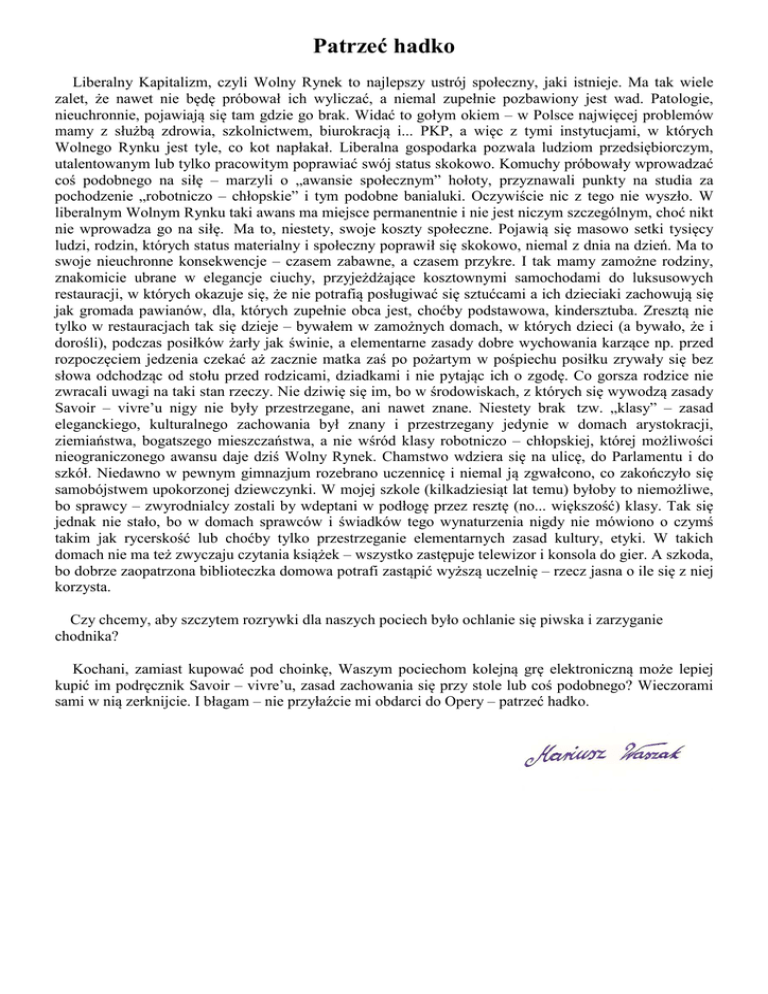 Patrzeć hadko Liberalny Kapitalizm, czyli Wolny Rynek to najlepszy ustrój społeczny, jaki istnieje. Ma tak wiele zalet, że nawet nie będę próbował ich wyliczać, a niemal zupełnie pozbawiony jest wad. Patologie, nieuchronnie, pojawiają się tam gdzie go brak. Widać to gołym okiem – w Polsce najwięcej problemów mamy z służbą zdrowia, szkolnictwem, biurokracją i... PKP, a więc z tymi instytucjami, w których Wolnego Rynku jest tyle, co kot napłakał. Liberalna gospodarka pozwala ludziom przedsiębiorczym, utalentowanym lub tylko pracowitym poprawiać swój status skokowo. Komuchy próbowały wprowadzać coś podobnego na siłę – marzyli o „awansie społecznym” hołoty, przyznawali punkty na studia za pochodzenie „robotniczo – chłopskie” i tym podobne banialuki. Oczywiście nic z tego nie wyszło. W liberalnym Wolnym Rynku taki awans ma miejsce permanentnie i nie jest niczym szczególnym, choć nikt nie wprowadza go na siłę. Ma to, niestety, swoje koszty społeczne. Pojawią się masowo setki tysięcy ludzi, rodzin, których status materialny i społeczny poprawił się skokowo, niemal z dnia na dzień. Ma to swoje nieuchronne konsekwencje – czasem zabawne, a czasem przykre. I tak mamy zamożne rodziny, znakomicie ubrane w elegancje ciuchy, przyjeżdżające kosztownymi samochodami do luksusowych restauracji, w których okazuje się, że nie potrafią posługiwać się sztućcami a ich dzieciaki zachowują się jak gromada pawianów, dla, których zupełnie obca jest, choćby podstawowa, kindersztuba. Zresztą nie tylko w restauracjach tak się dzieje – bywałem w zamożnych domach, w których dzieci (a bywało, że i dorośli), podczas posiłków żarły jak świnie, a elementarne zasady dobre wychowania karzące np. przed rozpoczęciem jedzenia czekać aż zacznie matka zaś po pożartym w pośpiechu posiłku zrywały się bez słowa odchodząc od stołu przed rodzicami, dziadkami i nie pytając ich o zgodę. Co gorsza rodzice nie zwracali uwagi na taki stan rzeczy. Nie dziwię się im, bo w środowiskach, z których się wywodzą zasady Savoir – vivre’u nigy nie były przestrzegane, ani nawet znane. Niestety brak tzw. „klasy” – zasad eleganckiego, kulturalnego zachowania był znany i przestrzegany jedynie w domach arystokracji, ziemiaństwa, bogatszego mieszczaństwa, a nie wśród klasy robotniczo – chłopskiej, której możliwości nieograniczonego awansu daje dziś Wolny Rynek. Chamstwo wdziera się na ulicę, do Parlamentu i do szkół. Niedawno w pewnym gimnazjum rozebrano uczennicę i niemal ją zgwałcono, co zakończyło się samobójstwem upokorzonej dziewczynki. W mojej szkole (kilkadziesiąt lat temu) byłoby to niemożliwe, bo sprawcy – zwyrodnialcy zostali by wdeptani w podłogę przez resztę (no... większość) klasy. Tak się jednak nie stało, bo w domach sprawców i świadków tego wynaturzenia nigdy nie mówiono o czymś takim jak rycerskość lub choćby tylko przestrzeganie elementarnych zasad kultury, etyki. W takich domach nie ma też zwyczaju czytania książek – wszystko zastępuje telewizor i konsola do gier. A szkoda, bo dobrze zaopatrzona biblioteczka domowa potrafi zastąpić wyższą uczelnię – rzecz jasna o ile się z niej korzysta. Czy chcemy, aby szczytem rozrywki dla naszych pociech było ochlanie się piwska i zarzyganie chodnika? Kochani, zamiast kupować pod choinkę, Waszym pociechom kolejną grę elektroniczną może lepiej kupić im podręcznik Savoir – vivre’u, zasad zachowania się przy stole lub coś podobnego? Wieczorami sami w nią zerknijcie. I błagam – nie przyłaźcie mi obdarci do Opery – patrzeć hadko.