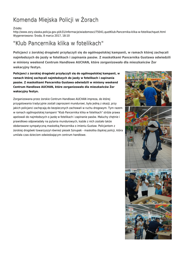 Komenda Miejska Policji w Żorach Źródło: http://www.zory.slaska.policja.gov.pl/k31/informacje/wiadomosci/75041,quotKlub-Pancernika-klika-w-fotelikachquot.html Wygenerowano: Środa, 8 marca 2017, 18:10 "Klub Pancernika klika w fotelikach" Policjanci z żorskiej drogówki przyłączyli się do ogólnopolskiej kampanii, w ramach której zachęcali najmłodszych do jazdy w fotelikach i zapinania pasów. Z maskotkami Pancernika Gustawa odwiedzili w miniony weekend Centrum Handlowe AUCHAN, które zorganizowało dla mieszkańców Żor wakacyjny festyn. Policjanci z żorskiej drogówki przyłączyli się do ogólnopolskiej kampanii, w ramach której zachęcali najmłodszych do jazdy w fotelikach i zapinania pasów. Z maskotkami Pancernika Gustawa odwiedzili w miniony weekend Centrum Handlowe AUCHAN, które zorganizowało dla mieszkańców Żor wakacyjny festyn. Zorganizowana przez żorskie Centrum Handlowe AUCHAN impreza, do której przygotowania tradycyjnie zostali zaproszeni mundurowi, była jedną z okazji, przy jakich policjanci zachęcają do bezpiecznych zachowań w ruchu drogowym. Tym razem w ramach ogólnopolskiej kampanii "Klub Pancernika klika w fotelikach" stróże prawa apelowali do najmłodszych o jazdę w fotelikach i zapinanie pasów. Maluchy chętnie i prawidłowo odpowiadały na pytania mundurowych, każde z nich zostało także obdarowane sympatyczną maskotką Pancernika o imieniu Gustaw. Policjantom z żorskiej drogówki towarzyszył również piesek Sznupek - maskotka śląskiej policji, która umilała czas dzieciom odwiedzającym centrum handlowe. Zainstaluj wtyczkę Flash, aby zobaczyć odtwarzacz. pobierz film - 6.7 MB Ocena: 0/5 (0) Tweetnij