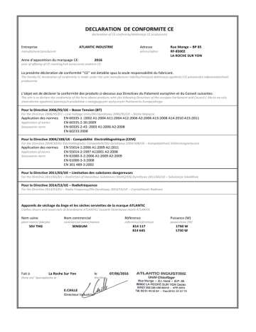 DECLARATION DE CONFORMITE CE declaration of CE confirmity/deklaracja CE producenta ATLANTIC INDUSTRIE Entreprise manufacturer/producent Anne d’appostition du marquage CE: Adresse adress/adres 2016 Rue Monge – BP 85 RF-85002 LA ROCHE SUR YON year of affixing of CE marking/rok oznaczenia znakiem CE: La presénte déclaration de conformité ‘’CE’’ est éetablie spus la seule responsabilité du fabricant. The hereby EC declaration of conformity is made under the sole manufacturer liability/niniejsza deklaracja zgodności CE potwierdza odpowiedzialność producenta L’objet est de déclarer la conformité des produits ci-dessous aux Directives du Palament europVen et du Conseil suivantes: The aim is to declare the conformity of the here-above products whit yhe following Directives of the europan Parliament and Council:/ Ma to na celu stwierdzenie zgodności poniższych produktów z następującymi wytycznymi Parlamentu Europejskiego: Pour la Directive 2006/95/UE – Basse Tension (BT) For the Directive 2006/95/EU – Low Voltage Units/Dla Dyrektywy 2006/95/UE – Niskie Napięcie Application des normes Application of norms Stosowanie norm EN 60335-1 :2002 A1:2004 A11:2004 A12:2006 A2:2006 A13:2008 A14:2010 A15:2011 EN 60335-2-30:2009 EN 60335-2-43 :2003 A1:2006 A2:2008 EN 60233:2008 Pour la Directive 2004/108/UE - Compabilité ElectroMagnétique (CEM) For the Directive 2004/10/EU ElectroMagnetic Compatibilit/Dla Dyrektywy 2004/108/UE – Kompatybilność Elektromagnetyczna Application des normes Application of norms Stosowanie norm EN 55014-1:2006 A1:2009 A2:2011 EN 55014-2:1997 A12001 A2:2008 EN 61000-3-2:2006 A1:2009 A2:2009 EN 61000-3-3:2008 EN 301 489-3:2002 Pour la Directive 2011/65/UE – Limitation des substanes dangereuses For the Directive 2011/65/EU – Restriction of Hazardous Substances (RoHS)/Dla Dyrektywy 2011/65/UE – Substancje Szkoldliwe Pour la Directive 2014/53/UE – Radiofréquence For the Directive 2014/53/EU – Radio Frequency/Dla Dyrektywy 2014/53/UE – Częstotliwość Radiowa Appareils de séchage du linge et les séches serviettes de la marque ATLANTIC Clothes dryers and towel rails of brandname ATLANTIC/ Suszarki łazienkowe marki ATLANTIC Nom usine plant name/ fabryka SSV THG Fait à Nom commercial commercial name/nazwa SENSIUM La Roche Sur Yon Done on/ Sporządzono w le the/dnia E.CAILLE Directeur Industriel Rèfèrence reference/referencja 814 117 814 645 07/06/2016 Puisance (W) power/moc (W) 1750 W 1750 W