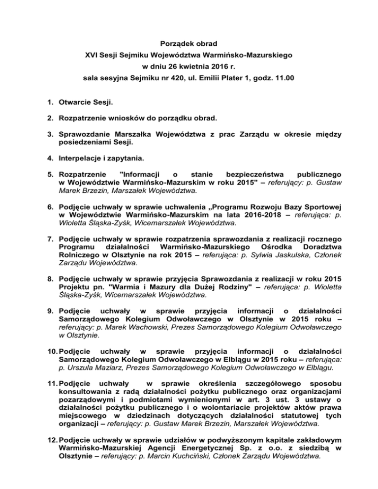 Porządek obrad XVI Sesji Sejmiku Województwa Warmińsko-Mazurskiego w dniu 26 kwietnia 2016 r. sala sesyjna Sejmiku nr 420, ul. Emilii Plater 1, godz. 11.00 1. Otwarcie Sesji. 2. Rozpatrzenie wniosków do porządku obrad. 3. Sprawozdanie Marszałka Województwa z prac Zarządu w okresie między posiedzeniami Sesji. 4. Interpelacje i zapytania. 5. Rozpatrzenie "Informacji o stanie bezpieczeństwa publicznego w Województwie Warmińsko-Mazurskim w roku 2015" – referujący: p. Gustaw Marek Brzezin, Marszałek Województwa. 6. Podjęcie uchwały w sprawie uchwalenia „Programu Rozwoju Bazy Sportowej w Województwie Warmińsko-Mazurskim na lata 2016-2018 – referująca: p. Wioletta Śląska-Zyśk, Wicemarszałek Województwa. 7. Podjęcie uchwały w sprawie rozpatrzenia sprawozdania z realizacji rocznego Programu działalności Warmińsko-Mazurskiego Ośrodka Doradztwa Rolniczego w Olsztynie na rok 2015 – referująca: p. Sylwia Jaskulska, Członek Zarządu Województwa. 8. Podjęcie uchwały w sprawie przyjęcia Sprawozdania z realizacji w roku 2015 Projektu pn. "Warmia i Mazury dla Dużej Rodziny" – referująca: p. Wioletta Śląska-Zyśk, Wicemarszałek Województwa. 9. Podjęcie uchwały w sprawie przyjęcia informacji o działalności Samorządowego Kolegium Odwoławczego w Olsztynie w 2015 roku – referujący: p. Marek Wachowski, Prezes Samorządowego Kolegium Odwoławczego w Olsztynie. 10. Podjęcie uchwały w sprawie przyjęcia informacji o działalności Samorządowego Kolegium Odwoławczego w Elblągu w 2015 roku – referująca: p. Urszula Maziarz, Prezes Samorządowego Kolegium Odwoławczego w Elblągu. 11. Podjęcie uchwały w sprawie określenia szczegółowego sposobu konsultowania z radą działalności pożytku publicznego oraz organizacjami pozarządowymi i podmiotami wymienionymi w art. 3 ust. 3 ustawy o działalności pożytku publicznego i o wolontariacie projektów aktów prawa miejscowego w dziedzinach dotyczących działalności statutowej tych organizacji – referujący: p. Gustaw Marek Brzezin, Marszałek Województwa. 12. Podjęcie uchwały w sprawie udziałów w podwyższonym kapitale zakładowym Warmińsko-Mazurskiej Agencji Energetycznej Sp. z o.o. z siedzibą w Olsztynie – referujący: р. Marcin Kuchciński, Członek Zarządu Województwa. 13. Podjęcie uchwały w sprawie wyboru ofert i udzielenia dotacji z budżetu Województwa Warmińsko-Mazurskiego na wykonywanie w 2016 r. zadań publicznych z zakresu ochrony zabytków i opieki nad zabytkami – referująca: p. Wioletta Śląska-Zyśk, Wicemarszałek Województwa. 14. Podjęcie uchwały w sprawie udzielenia pomocy finansowej gminom w formie dotacji celowej na dofinansowanie przedsięwzięć inwestycyjnych w ramach konkursu pn.: „Aktywna Wieś Warmii, Mazur i Powiśla” w 2016 roku – referująca: p. Sylwia Jaskulska, Członek Zarządu Województwa. 15. Podjęcie uchwały w sprawie udzielenia gminom Województwa WarmińskoMazurskiego pomocy finansowej w formie dotacji celowych na dofinansowanie zadań w zakresie ochrony przeciwpożarowej – referujący: p. Gustaw Marek Brzezin, Marszałek Województwa. 16. Podjęcie uchwały zmieniającej uchwałę Nr XIX/389/12 Sejmiku Województwa Warmińsko-Mazurskiego z dnia 28 sierpnia 2012 r. w sprawie określenia przystanków komunikacyjnych, których właścicielem lub zarządzającym jest Województwo Warmińsko-Mazurskie – referujący: р. Marcin Kuchciński, Członek Zarządu Województwa. 17. Podjęcie uchwały w sprawie powierzenia Gminie Łukta zadania zarządcy drogi – referujący: р. Marcin Kuchciński, Członek Zarządu Województwa. 18. Podjęcie uchwały w sprawie wyrażenia zgody na odstąpienie od obowiązku przetargowego trybu zawarcia umowy dzierżawy na czas nieoznaczony przez Wojewódzki Zespół Lecznictwa Psychiatrycznego w Olsztynie z Samodzielnym Publicznym Zakładem Opieki Zdrowotnej Ministerstwa Spraw Wewnętrznych z Warmińsko-Mazurskim Centrum Onkologii, na część gruntu o powierzchni 60 m2, z działki oznaczonej numerem 4 w ewidencji gruntów i budynków obrębu nr 25 m. Olsztyn, dla której w VI Wydziale Ksiąg Wieczystych Sądu Rejonowego w Olsztynie prowadzona jest księga wieczysta KW Nr OL1O/00060373/6 – referujący: р. Marcin Kuchciński, Członek Zarządu Województwa. 19. Podjęcie uchwały w sprawie wyrażenia zgody na odstąpienie od odwołania darowizny nieruchomości zabudowanej, położonej w obrębie Gronowo Elbląskie, oznaczonej jako działki nr 30/13 i 30/15 o łącznej powierzchni 0,1993 ha, przekazanej na własność Gminy Gronowo Elbląskie – referujący: р. Marcin Kuchciński, Członek Zarządu Województwa. 20. Podjęcie uchwały zmieniającej Uchwałę Nr XIII/315/15 Sejmiku Województwa Warmińsko-Mazurskiego z dnia 30 grudnia 2015 r. w sprawie udzielenia Powiatowi Ostródzkiemu pomocy finansowej w formie dotacji celowej na dofinansowanie w 2016 r. działalności Powiatowej Biblioteki Pedagogicznej w Ostródzie – referująca: p. Wioletta Śląska-Zyśk, Wicemarszałek Województwa. 21. Podjęcie uchwały w sprawie udzielenia Gminie Węgorzewo pomocy finansowej w formie dotacji celowej na dofinansowanie w 2016 r. działań Węgorzewskiego Centrum Kultury w Węgorzewie – referująca: p. Wioletta Śląska-Zyśk, Wicemarszałek Województwa. 22. Podjęcie uchwały w sprawie udzielenia Gminie Miastu Elbląg pomocy finansowej w formie dotacji celowej na dofinansowanie w 2016 r. działań w zakresie kultury realizowanych przez miejskie instytucje kultury – referująca: p. Wioletta Śląska-Zyśk, Wicemarszałek Województwa. 23. Podjęcie uchwały w sprawie zmian w Wieloletniej Prognozie Finansowej Województwa Warmińsko-Mazurskiego na lata 2016-2039 – referujący: p. Gustaw Marek Brzezin, Marszałek Województwa. 24. Podjęcie uchwały w sprawie zmian w budżecie Województwa WarmińskoMazurskiego na 2016 rok – referujący: p. Gustaw Marek Brzezin, Marszałek Województwa. 25. Sprawy