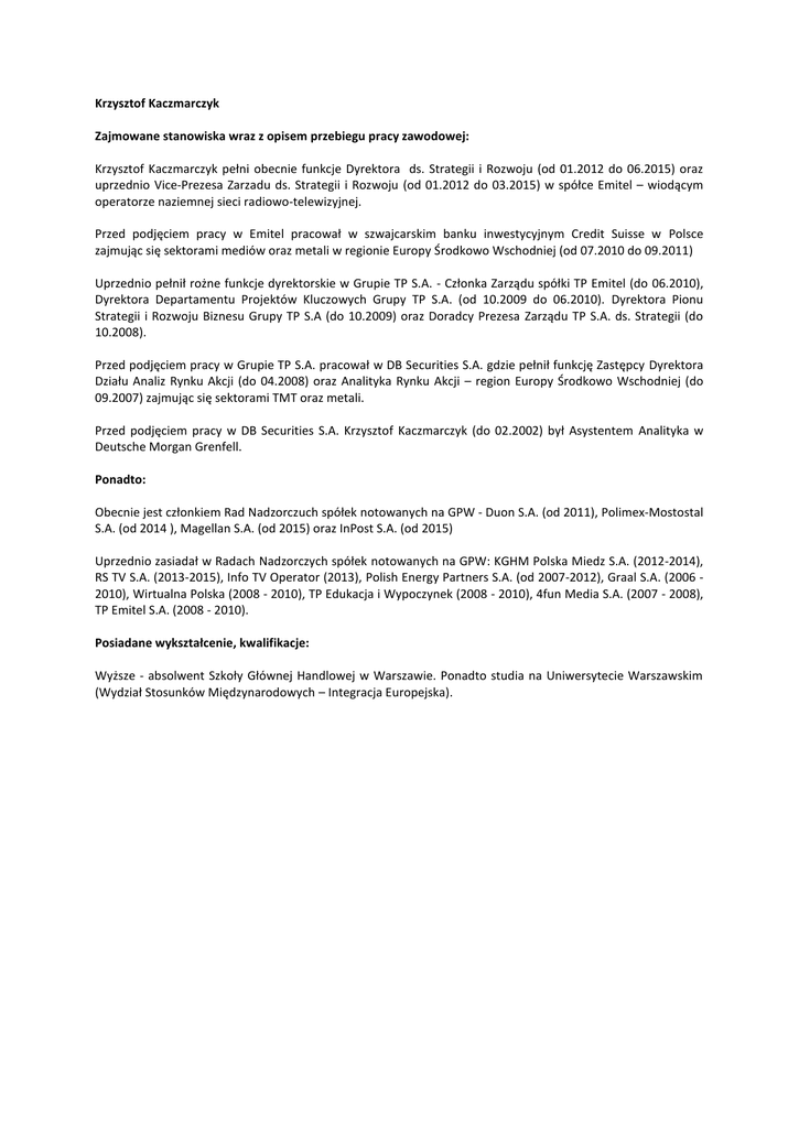 Krzysztof Kaczmarczyk Zajmowane stanowiska wraz z opisem przebiegu pracy zawodowej: Krzysztof Kaczmarczyk pełni obecnie funkcje Dyrektora ds. Strategii i Rozwoju (od 01.2012 do 06.2015) oraz uprzednio Vice-Prezesa Zarzadu ds. Strategii i Rozwoju (od 01.2012 do 03.2015) w spółce Emitel – wiodącym operatorze naziemnej sieci radiowo-telewizyjnej. Przed podjęciem pracy w Emitel pracował w szwajcarskim banku inwestycyjnym Credit Suisse w Polsce zajmując się sektorami mediów oraz metali w regionie Europy Środkowo Wschodniej (od 07.2010 do 09.2011) Uprzednio pełnił rożne funkcje dyrektorskie w Grupie TP S.A. - Członka Zarządu spółki TP Emitel (do 06.2010), Dyrektora Departamentu Projektów Kluczowych Grupy TP S.A. (od 10.2009 do 06.2010). Dyrektora Pionu Strategii i Rozwoju Biznesu Grupy TP S.A (do 10.2009) oraz Doradcy Prezesa Zarządu TP S.A. ds. Strategii (do 10.2008). Przed podjęciem pracy w Grupie TP S.A. pracował w DB Securities S.A. gdzie pełnił funkcję Zastępcy Dyrektora Działu Analiz Rynku Akcji (do 04.2008) oraz Analityka Rynku Akcji – region Europy Środkowo Wschodniej (do 09.2007) zajmując się sektorami TMT oraz metali. Przed podjęciem pracy w DB Securities S.A. Krzysztof Kaczmarczyk (do 02.2002) był Asystentem Analityka w Deutsche Morgan Grenfell. Ponadto: Obecnie jest członkiem Rad Nadzorczuch spółek notowanych na GPW - Duon S.A. (od 2011), Polimex-Mostostal S.A. (od 2014 ), Magellan S.A. (od 2015) oraz InPost S.A. (od 2015) Uprzednio zasiadał w Radach Nadzorczych spółek notowanych na GPW: KGHM Polska Miedz S.A. (2012-2014), RS TV S.A. (2013-2015), Info TV Operator (2013), Polish Energy Partners S.A. (od 2007-2012), Graal S.A. (2006 2010), Wirtualna Polska (2008 - 2010), TP Edukacja i Wypoczynek (2008 - 2010), 4fun Media S.A. (2007 - 2008), TP Emitel S.A. (2008 - 2010). Posiadane wykształcenie, kwalifikacje: Wyższe - absolwent Szkoły Głównej Handlowej w Warszawie. Ponadto studia na Uniwersytecie Warszawskim (Wydział Stosunków Międzynarodowych – Integracja Europejska).