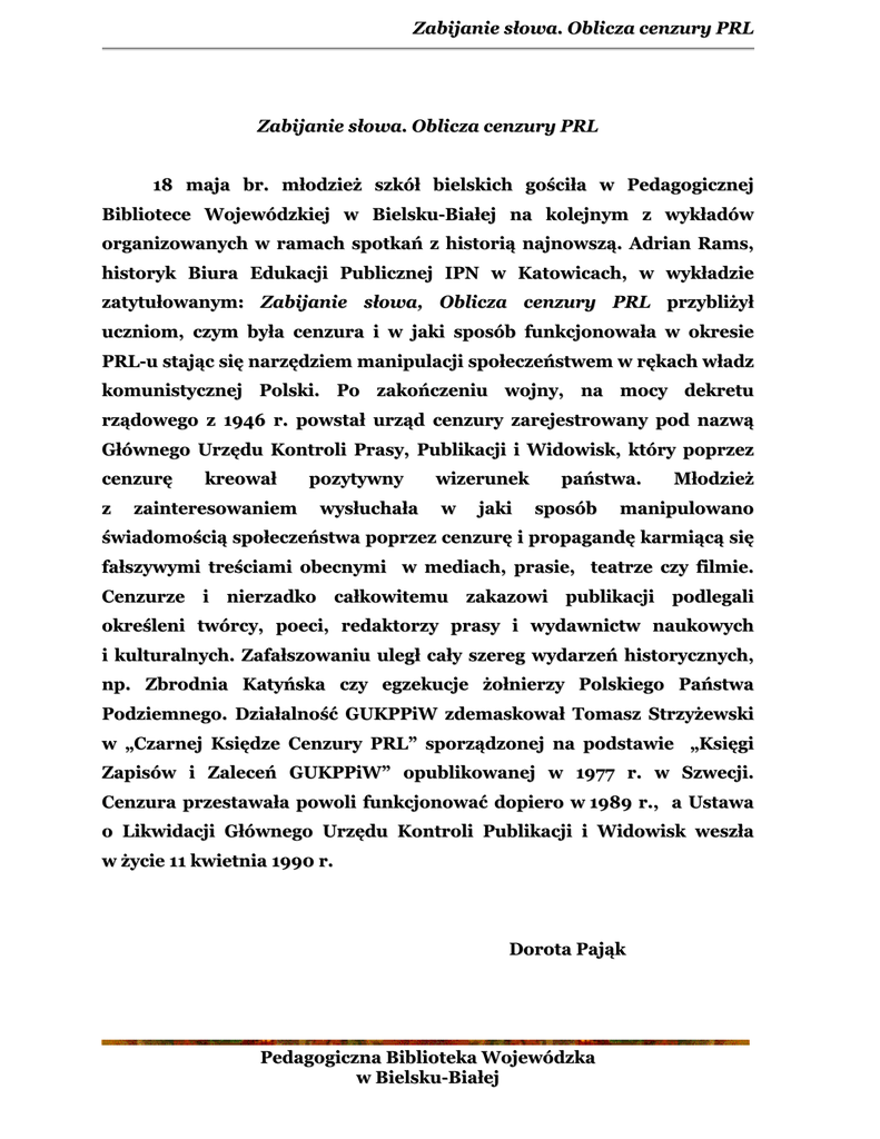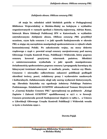 Zabijanie słowa. Oblicza cenzury PRL Zabijanie słowa. Oblicza cenzury PRL 18 maja br. młodzież szkół bielskich gościła w Pedagogicznej Bibliotece Wojewódzkiej w Bielsku-Białej na kolejnym z wykładów organizowanych w ramach spotkań z historią najnowszą. Adrian Rams, historyk Biura Edukacji Publicznej IPN w Katowicach, w wykładzie zatytułowanym: Zabijanie słowa, Oblicza cenzury PRL przybliżył uczniom, czym była cenzura i w jaki sposób funkcjonowała w okresie PRL-u stając się narzędziem manipulacji społeczeństwem w rękach władz komunistycznej Polski. Po zakończeniu wojny, na mocy dekretu rządowego z 1946 r. powstał urząd cenzury zarejestrowany pod nazwą Głównego Urzędu Kontroli Prasy, Publikacji i Widowisk, który poprzez cenzurę z kreował zainteresowaniem pozytywny wysłuchała wizerunek w jaki państwa. sposób Młodzież manipulowano świadomością społeczeństwa poprzez cenzurę i propagandę karmiącą się fałszywymi treściami obecnymi w mediach, prasie, teatrze czy filmie. Cenzurze i nierzadko całkowitemu zakazowi publikacji podlegali określeni twórcy, poeci, redaktorzy prasy i wydawnictw naukowych i kulturalnych. Zafałszowaniu uległ cały szereg wydarzeń historycznych, np. Zbrodnia Katyńska czy egzekucje żołnierzy Polskiego Państwa Podziemnego. Działalność GUKPPiW zdemaskował Tomasz Strzyżewski w „Czarnej Księdze Cenzury PRL” sporządzonej na podstawie „Księgi Zapisów i Zaleceń GUKPPiW” opublikowanej w 1977 r. w Szwecji. Cenzura przestawała powoli funkcjonować dopiero w 1989 r., a Ustawa o Likwidacji Głównego Urzędu Kontroli Publikacji i Widowisk weszła w życie 11 kwietnia 1990 r. Dorota Pająk Pedagogiczna Biblioteka Wojewódzka w Bielsku-Białej Zabijanie słowa. Oblicza cenzury PRL Pedagogiczna Biblioteka Wojewódzka w Bielsku-Białej