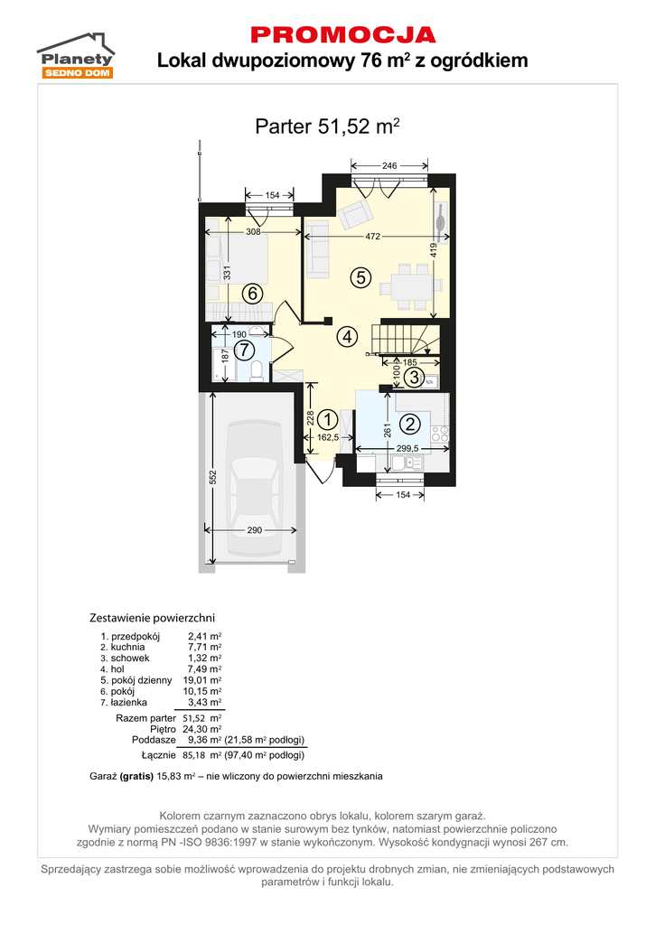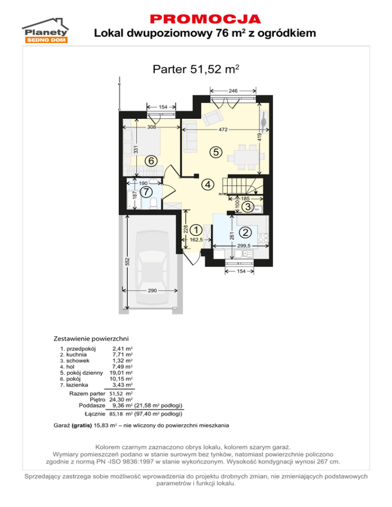 PROMOCJA Minisegment 76 85mm2 2z ogródkiem Lokal dwupoziomowy Parter 51,52 m2 246 154 308 331 419 472 5 6 4 7 185 1 3 2 299,5 552 162,5 261 228 100 187 190 154 290 Zestawienie powierzchni 1. przedpokój 2. kuchnia 3. schowek 4. hol 5. pokój dzienny 6. pokój 7. łazienka 2,41 m2 7,71 m2 1,32 m 2 7,49 m 2 19,01 m2 10,15 m2 3,43 m2 Razem parter 51,52 m2 Piętro 24,30 m2 Poddasze 9,36 m2 (21,58 m2 podłogi) Łącznie 85,18 m2 (97,40 m2 podłogi) m2 wliczony do powierzchni mieszkania Garaż (opcjonalnie) (gratis) 15,83 15,83 m2 – nie Kolorem czarnym zaznaczono obrys lokalu, kolorem szarym garaż. Wymiary pomieszczeń podano w stanie surowym bez tynków, natomiast powierzchnie policzono zgodnie z normą PN -ISO 9836:1997 w stanie wykończonym. Wysokość kondygnacji wynosi 267 cm. Sprzedający zastrzega sobie możliwość wprowadzenia do projektu drobnych zmian, nie zmieniających podstawowych parametrów i funkcji lokalu. PROMOCJA Minisegment 76 85mm2 2z ogródkiem Lokal dwupoziomowy Piętro 24,30 m2 154 379 280 8 9 11 276,5 187,0 10 299,5 154 Zestawienie powierzchni 8. schody 9. korytarz 10 . sypialnia 11. łazienka 3,60 m2 2,18 m2 10,41 m2 8,11 m2 Razem piętro 24,30 m2 Kolorem czarnym zaznaczono obrys lokalu, kolorem szarym lokal sąsiedni. Wymiary pomieszczeń podano w stanie surowym bez tynków, natomiast powierzchnie policzono zgodnie z normą PN -ISO 9836:1997 w stanie wykończonym. Wysokość kondygnacji wynosi 267 cm. Sprzedający zastrzega sobie możliwość wprowadzenia do projektu drobnych zmian, nie zmieniających podstawowych parametrów i funkcji lokalu. PROMOCJA 22 Minisegment76 85mm Lokal dwupoziomowy z ogródkiem 2 Poddasze 9,41 m2 –mgratis Poddasze 9,36 nie wliczone do powierzchni mieszkania h=54cm 280 288 376,5 12 h<190cm 187 207,5 154 187 h=248cm 111,5 h<190cm 324,5 h=54cm Zestawienie powierzchni 12. poddasze Razem 9,36 m2 (21,58 m2 podłogi) 9,36 m2 (21,58 m2 podłogi) Kolorem czarnym zaznaczono obrys lokalu, kolorem szarym lokal sąsiedni. Wymiary pomieszczeń podano w stanie surowym bez tynków, natomiast powierzchnie policzono zgodnie z normą PN -ISO 9836:1997 w stanie wykończonym. Wysokość kondygnacji wynosi 267 cm. Sprzedający zastrzega sobie możliwość wprowadzenia do projektu drobnych zmian, nie zmieniających podstawowych parametrów i funkcji lokalu.