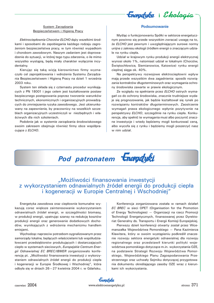 Podsumowanie System Zarz¹dzania Bezpieczeñstwem i Higien¹ Pracy Elektrociep³ownia Chorzów ELCHO d¹¿y wszelkimi rodkami i sposobami do zapobiegania ka¿dego rodzaju zagro¿eniom bezpieczeñstwa pracy, w tym równie¿ wypadkom i chorobom zawodowym. Naszym zadaniem jest doprowadzenie do sytuacji, w której tego typu zdarzenia, o ile mimo wszystko wyst¹pi¹, bêd¹ mia³y charakter wy³¹cznie incydentalny. Kieruj¹c siê tak¹ wizj¹ kierownictwo firmy wyznaczy³o cel zaprojektowania i wdro¿enia Systemu Zarz¹dzania Bezpieczeñstwem i Higien¹ Pracy na dzieñ 1 wrzenia 2003 roku. System ten sk³ada siê z czternastu procedur wynikaj¹cych z PN 18001 i jego celem jest kszta³towanie postaw bezpiecznego postêpowania poprzez tworzenie warunków technicznych, ekonomicznych i organizacyjnych prowadz¹cych do zmniejszenia ryzyka zawodowego. Jest ukierunkowany na zapewnienie, by pracownicy na wszelkich szczeblach organizacyjnych uczestniczyli w niezbêdnych i w³aciwych dla nich szkoleniach. Podobnie jak w systemie zarz¹dzania rodowiskowego swoim zakresem obejmuje równie¿ firmy obce wspó³pracuj¹ce z ELCHO. Myl¹c o funkcjonowaniu Spó³ki w sektorze energetycznym powinno siê przede wszystkim zwracaæ uwagê na to, ¿e ELCHO jest pewnym i uwzglêdniaj¹cym surowe normy unijne z zakresu ekologii ród³em energii o znacz¹cym udziale na rynku ciep³a. Udzia³ w krajowym rynku produkcji energii elektrycznej wynosi oko³o 1%, natomiast udzia³ w lokalnym (Chorzów, wiêtoch³owice, Siemianowice, Katowice) rynku energii cieplnej siêga ok. 40%. Na perspektywy rozwojowe elektrociep³owni wp³yw maj¹ przede wszystkim dwa zagadnienia: sposób rozwi¹zania kontraktów d³ugoterminowych oraz wymagania ochrony rodowiska zawarte w prawie ekologicznym. Ze wzglêdu na spe³nianie przez ELCHO ostrych wymagañ co do ochrony rodowiska, znacznie trudniejsze wydaje siê prognozowanie, jak bêdzie kszta³towa³ siê rynek po rozwi¹zaniu kontraktów d³ugoterminowych. Zaostrzenie wymagañ prawa ekologicznego wp³ynie pozytywnie na perspektywy ELCHO, szczególnie na rynku ciep³a. Konkurencja, aby spe³niæ te wymagania musi albo poczyniæ znaczne inwestycje i wtedy bêdziemy mogli konkurowaæ cen¹, albo wycofa siê z rynku i bêdziemy mogli poszerzyæ nasz w nim udzia³. Mo¿liwoci finansowania inwestycji z wykorzystaniem odnawialnych róde³ energii do produkcji ciep³a i kogeneracji w Europie Centralnej i Wschodniej Energetyka zawodowa oraz ciep³ownie komunalne wykazuj¹ coraz wiêksze zainteresowanie wykorzystaniem odnawialnych róde³ energii, w szczególnoci biomasy, w produkcji energii, upatruj¹c szansy na redukcjê kosztów produkcji energii oraz generowanie dodatkowych dochodów, wynikaj¹cych z wdro¿enia mechanizmu handlem emisjami. Wychodz¹c naprzeciw potrzebom sygnalizowanym przez samorz¹dy lokalne, bêd¹cych w³acicielami lub wspó³udzia³owcami przedsiêbiorstw produkuj¹cych i dostarczaj¹cych ciep³o w systemach sieciowych, Europejskie Centrum Energii Odnawialnej EC BREC/IBMER zorganizowa³o konferencjê pt. Mo¿liwoci finansowania inwestycji z wykorzystaniem odnawialnych róde³ energii do produkcji ciep³a i kogeneracji w Europie rodkowej i Wschodniej, która odby³a siê w dniach 2627 kwietnia 2004 r. w Gdañsku. czerwiec 2004 Konferencja zorganizowana zosta³a w ramach dzia³añ EC BREC w sieci OPET (Organisation for the Promotion of Energy Technologies) Organizacji na rzecz Promocji Technologii Energetycznych, finansowanej przez Dyrektoriat Generalny ds. Transportu i Energii Komisji Europejskiej. Pierwszy dzieñ konferencji otwarty zosta³ przez Wicemarsza³ka Województwa Pomorskiego Pana Kazimierza Klawitera, który w swoim wyst¹pieniu podkreli³ znaczenie rozwoju sektora energetyki odnawialnej dla rozwoju regionalnego oraz przedstawi³ kierunki polityki województwa pomorskiego dotycz¹ce m.in. wykorzystania OZE, na podstawie Strategii Rozwoju Województwa Pomorskiego, Wojewódzkiego Planu Zagospodarowania Przestrzennego oraz uchwa³y Sejmiku dotycz¹cej przygotowania dokumentu okrelaj¹cego zasoby OZE wraz z kierunkami ich wykorzystania. www.elektroenergetyka.pl strona 371 Sala obrad W sesji powiêconej prawnym i politycznym uwarunkowaniom rozwoju ciep³ownictwa wyst¹pili przedstawiciele krajów Europy rodkowej, m.in. Ministerstwa Gospodarki Estonii, Energy Centre Bratislava ze S³owacji. Prelegenci przedstawili sytuacjê rynku elektrociep³owniczego i ciep³owniczego oraz bariery i szanse na rozwój rynku dla technologii energetycznego wykorzystania biomasy w nowych krajach cz³onkowskich Unii Europejskiej. Kolejne dwie sesje powiêcone by³y technologiom kogeneracji oraz wspó³spalania biomasy i wêgla w du¿ej skali, dowiadczeniom w eksploatacji funkcjonuj¹cych ju¿ technologii kogeneracji oraz produkcji ciep³a z biomasy oraz rozwojowi miêdzynarodowego rynku biopaliwami sta³ymi. Do udzia³u w sesji i prezentacji technologii zaproszono przedstawicieli znacz¹cych firm sprzedaj¹cych zaawansowane rozwi¹zania technologiczne du¿ej mocy, wykorzystuj¹ce biomasê. W sesji tej wyst¹pili przedstawiciele Foster Wheeler Energia Polska, VTT Processes oraz Wartsila Biopower z Finlandii. Bardzo interesuj¹cy referat, odnosz¹cy siê do organizacji logistyki biomasy, wyg³osi³ przedstawiciel VTT Processes prof. Tapio Ranta, który zaprezentowa³ fiñskie rozwi¹zania dotyczace planowania zaopatrzenia w biomasê, wykorzystuj¹ce komputerowe narzêdzia planistyczne z rodziny Systemów Informacji Geograficznej (GIS). Kolejny referat, opisuj¹cy tym razem polskie dowiadczenia, w skali lokalnej, przedstawi³ Pan Marek Gostkowski z firmy Heise&Gostkowski Sp. z o.o., bêd¹cej pionierem w dziedzinie organizacji lokalnych rynków biomasy oraz autorem interesuj¹cych rozwi¹zañ w zakresie realizacji inwestycji w formule partnerstwa publiczno-prywatnego w Polsce pó³nocnej. Natomiast przedstawiciel austriackiej platformy ABEX Michael Wild zaprezentowa³ dowiadczenia austriacki