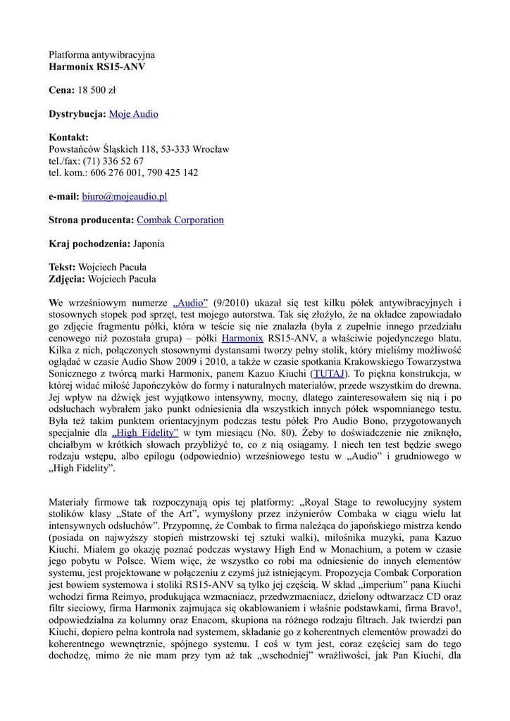 Platforma antywibracyjna Harmonix RS15-ANV Cena: 18 500 zł Dystrybucja: Moje Audio Kontakt: Powstańców Śląskich 118, 53-333 Wrocław tel./fax: (71) 336 52 67 tel. kom.: 606 276 001, 790 425 142 e-mail: [email protected] Strona producenta: Combak Corporation Kraj pochodzenia: Japonia Tekst: Wojciech Pacuła Zdjęcia: Wojciech Pacuła We wrześniowym numerze „Audio” (9/2010) ukazał się test kilku półek antywibracyjnych i stosownych stopek pod sprzęt, test mojego autorstwa. Tak się złożyło, że na okładce zapowiadało go zdjęcie fragmentu półki, która w teście się nie znalazła (była z zupełnie innego przedziału cenowego niż pozostała grupa) – półki Harmonix RS15-ANV, a właściwie pojedynczego blatu. Kilka z nich, połączonych stosownymi dystansami tworzy pełny stolik, który mieliśmy możliwość oglądać w czasie Audio Show 2009 i 2010, a także w czasie spotkania Krakowskiego Towarzystwa Sonicznego z twórcą marki Harmonix, panem Kazuo Kiuchi (TUTAJ). To piękna konstrukcja, w której widać miłość Japończyków do formy i naturalnych materiałów, przede wszystkim do drewna. Jej wpływ na dźwięk jest wyjątkowo intensywny, mocny, dlatego zainteresowałem się nią i po odsłuchach wybrałem jako punkt odniesienia dla wszystkich innych półek wspomnianego testu. Była też takim punktem orientacyjnym podczas testu półek Pro Audio Bono, przygotowanych specjalnie dla „High Fidelity” w tym miesiącu (No. 80). Żeby to doświadczenie nie zniknęło, chciałbym w krótkich słowach przybliżyć to, co z nią osiągamy. I niech ten test będzie swego rodzaju wstępu, albo epilogu (odpowiednio) wrześniowego testu w „Audio” i grudniowego w „High Fidelity”. Materiały firmowe tak rozpoczynają opis tej platformy: „Royal Stage to rewolucyjny system stolików klasy „State of the Art”, wymyślony przez inżynierów Combaka w ciągu wielu lat intensywnych odsłuchów”. Przypomnę, że Combak to firma należąca do japońskiego mistrza kendo (posiada on najwyższy stopień mistrzowski tej sztuki walki), miłośnika muzyki, pana Kazuo Kiuchi. Miałem go okazję poznać podczas wystawy High End w Monachium, a potem w czasie jego pobytu w Polsce. Wiem więc, że wszystko co robi ma odniesienie do innych elementów systemu, jest projektowane w połączeniu z czymś już istniejącym. Propozycja Combak Corporation jest bowiem systemowa i stoliki RS15-ANV są tylko jej częścią. W skład „imperium” pana Kiuchi wchodzi firma Reimyo, produkująca wzmacniacz, przedwzmacniacz, dzielony odtwarzacz CD oraz filtr sieciowy, firma Harmonix zajmująca się okablowaniem i właśnie podstawkami, firma Bravo!, odpowiedzialna za kolumny oraz Enacom, skupiona na różnego rodzaju filtrach. Jak twierdzi pan Kiuchi, dopiero pełna kontrola nad systemem, składanie go z koherentnych elementów prowadzi do koherentnego wewnętrznie, spójnego systemu. I coś w tym jest, coraz częściej sam do tego dochodzę, mimo że nie mam przy tym aż tak „wschodniej” wrażliwości, jak Pan Kiuchi, dla którego otaczający nas świat jest pełen „drgań”, „współbrzmień”, energii przepływającej przez wszystko i wszystkich. ODSŁUCH Japońska półka jest koszmarnie droga. Ale to nawet dobrze – nie będzie żadnych pokus, aby stosować ją pod niedrogimi komponentami. Wypróbowałem ją bowiem w takim właśnie, niezbyt kosztownym kontekście i wprowadzane przez nią zmiany w dźwięku, moim zdaniem, nie miały sensu. Nie chodzi o to, że szło to w złym kierunku. Absolutnie nie! Po prostu większości tych zmian nie dało się sensownie wytłumaczyć i nie były one połączone ze sobą. Bo choć góra była cichsza, a średnica bardziej wyraźna, to nie przekładało się to na jakąś ogólną poprawę. Zmianę – tak, ale wady tych urządzeń, ich słabości dominowały nad tym tak wyraźnie, że miałem poczucie niewykorzystanej szansy. Najbardziej denerwowała mnie słaba dynamika. To rzecz inherentna dla tanich produktów, udających hi-fi, albo nawet nim będąc. Nie da się tego przeskoczyć, a jedynie symulować. Kończy się to jednak niemal zawsze zbytnią jaskrawością, ostrością. Wydaje się wtedy, że przekaz jest żywy, że wibruje emocjami. Tak jednak nie jest. Prawdziwa dynamika przychodzi znacznie później, czy – patrząc punktu widzenia ceny – wyżej. I nawet wtedy nie jest to dynamika wydarzenia na żywo, bo tej do domu przenieść się nie da i przy obecnej technologii nigdy to nie będzie możliwe. W każdym razie chodzi o to, że japońska półka wszystko uspokoiła, zgasiła nawet. Mam wrażenie, że chodziło o cos innego niż ocieplenie – Harmonix po prostu zdjął z dźwięku to, co dodane, co wynikało z niedoskonałości techniki (oczywiście tylko w pewnej mierze) i pokazała go tak, jak naprawdę brzmi. Niestety słychać wówczas, że właściwie wszystkie niedrogie wzmacniacze grają skompresowanym dźwiękiem i że nie mają dobrej góry. To samo dotyczy odtwarzaczy CD, które właściwie powinny zawsze zagrać lepiej, bo ich dźwięk nie przypominał z tą półką cyfrowego grania. A jednak było inaczej – nie było grania cyfrowego, z jego wadami, ale i zaletami, ale też nie było to w żadnej mierze granie analogowe. Bo półka pana Kiuchi ma sens przede wszystkim z topowymi systemami. Wnosi bowiem do dźwięku elementy, za które zwykle płaci się dużo większe sumy, zmieniając bez końca urządzenia i często nie znajdując tego, czego się szuka. Zmiany w dźwięku są tu kompleksowe. Z innymi platformami polepszało się to jedno, to drugie, generalnie zawsze w dobrą stronę, ale nigdy w sposób „liniowy”, nie tak pełny. Dźwięk odtwarzacza CD na platformie RS15-ANV robi się niebywale wyrafinowany. To wyrafinowanie polega na pogłębieniu każdego zakresu, jego uszlachetnieniu. Wydaje się, że nagle pojawia się takie mnóstwo harmonicznych, takie bogactwo, że słuchamy innej p