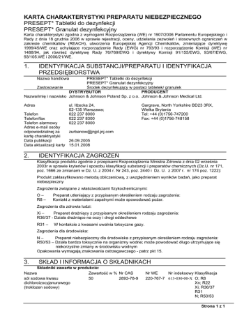 KARTA CHARAKTERYSTYKI PREPARATU NIEBEZPIECZNEGO PRESEPT* Tabletki do dezynfekcji PRESEPT* Granulat dezynfekcyjny Karta charakterystyki zgodna z wymogami Rozporządzenia (WE) nr 1907/2006 Parlamentu Europejskiego i Rady z dnia 18 grudnia 2006 w sprawie rejestracji, oceny, udzielania zezwoleń i stosownych ograniczeń w zakresie chemikaliów (REACH), utworzenia Europejskiej Agencji Chemikaliów, zmieniające dyrektywę 1999/45/WE oraz uchylające rozporządzenie Rady (EWG) nr 793/93 i rozporządzenie Komisji (WE) nr 1488/94, jak również dyrektywę Rady 76/769/EWG i dyrektywy Komisji 91/155/EWG, 93/67/EWG, 93/105.WE i 2000/21/WE. 1. IDENTYFIKACJA SUBSTANCJI/PREPARATU I IDENTYFIKACJA PRZEDSIĘBIORSTWA Nazwa handlowa PRESEPT* Tabletki do dezynfekcji PRESEPT* Granulat dezynfekcyjny Zastosowanie Środek dezynfekujący w postaci tabletek/ granulek DYSTRYBUTOR PRODUCENT Nazwa/imię i nazwisko Johnson & Johnson Poland Sp. z o.o. Johnson & Johnson Medical Ltd. Adres ul. Iłżecka 24, 02-135 Warszawa; 022 237 8000 022 237 8300 022 237 8000 Telefon Telefon/fax Telefon alarmowy Adres e-mail osoby [email protected] odpowiedzialnej za kartę charaktrystyki Data publikacji 26.09.2005 Data aktualizacji karty 15.01.2008 2. Gargrave, North Yorkshire BD23 3RX, Wielka Brytania Tel: +44 (0)1756-747200 Fax: +44 (0)1756-748158 IDENTYFIKACJA ZAGROŻEŃ Klasyfikacja produktu zgodnie z przepisami Rozporządzenia Ministra Zdrowia z dnia 02 września 2003r w sprawie kryteriów i sposobu klasyfikacji substancji i preparatów chemicznych (Dz.U. nr 171, poz. 1666 ze zmianami w Dz. U. z 2004 r. Nr 243, poz. 2440 i Dz. U. z 2007 r. nr 174 poz. 1222): Produkt zaklasyfikowano metodą obliczeniową, z uwzględnieniem wyników badań, jako preparat niebezpieczny Zagrożenia związane z właściwościami fizykochemicznymi: O– R8 – Preparat utleniający z przypisanym określeniem rodzaju zagrożenia: Kontakt z materiałami zapalnymi może spowodować pożar. Zagrożenia dla zdrowia ludzi: Xi – Preparat drażniący z przypisanym określeniem rodzaju zagrożenia: R36/37 - Działa drażniąco na oczy i drogi oddechowe R31 – W kontakcie z kwasami uwalnia toksyczne gazy. Zagrożenia dla środowiska: N– Preparat niebezpieczny dla środowiska z przypisanym określeniem rodzaju zagrożenia: R50/53 – Działa bardzo toksycznie na organizmy wodne; może powodować długo utrzymujące się niekorzystne zmiany w środowisku wodnym Opakowania wymagają znakowania ostrzegawczego - patrz pkt 15. 3. SKŁAD I INFORMACJA O SKŁADNIKACH Składniki zawarte w produkcie: Nazwa Zawartość w % Nr CAS sól sodowa kwasu 50 2893-78-9 dichloroizocyjanurowego (troklozen sodowy) Nr WE Nr indeksowy Klasyfikacja 220-767-7 613-030-00-X O; R8 Xn; R22 Xi; R36/37 R31 N; R50/53 Strona 1 z 1 KARTA CHARAKTERYSTYKI PREPARATU NIEBEZPIECZNEGO PRESEPT* Tabletki do dezynfekcji PRESEPT* Granulat dezynfekcyjny Karta charakterystyki zgodna z wymogami Rozporządzenia (WE) nr 1907/2006 Parlamentu Europejskiego i Rady z dnia 18 grudnia 2006 w sprawie rejestracji, oceny, udzielania zezwoleń i stosownych ograniczeń w zakresie chemikaliów (REACH), utworzenia Europejskiej Agencji Chemikaliów, zmieniające dyrektywę 1999/45/WE oraz uchylające rozporządzenie Rady (EWG) nr 793/93 i rozporządzenie Komisji (WE) nr 1488/94, jak również dyrektywę Rady 76/769/EWG i dyrektywy Komisji 91/155/EWG, 93/67/EWG, 93/105.WE i 2000/21/WE. 3. SKŁAD I INFORMACJA O SKŁADNIKACH kwas adypinowy 22,5 124-04-9 204-673-3 607-144-00-9 Xi; R36 W punkcie 16 karty podano pełne znaczenie zwrotów R. 4. PIERWSZA POMOC Wdychanie Jeśli doszło do wdychania pyłu lub par wyprowadzić na świeże powietrze. W przypadku wystąpienia trudności oddechowych podać tlen. Wezwać pomoc medyczną Skóra Zdjąć zanieczyszczoną produktem odzież. Zanieczyszczone produktem partie skóry przemyć wodą. W przypadku wystąpienia podrażnienia szukać pomocy medycznej. Oczy Usunąć soczewki kontaktowe. Odchylając powieki, oczy obficie przepłukać woda (około 10 - 15 min). Skonsultować się z lekarzem. Połknięcie Natychmiast przepłukać obficie jamę ustna wodą i wypić dużą ilość wody lub mleka (co najmniej 500ml). Nie powodować wymiotów. W przypadku wystąpienia objawów pogorszenia stanu poszkodowanego wezwać lekarza. Informacje dodatkowe: Produkt może działać szkodliwie w przypadku połknięcia. Główne ryzyko wynika z uwolnienia chloru, który jest drażniący dla skóry i oczu. Najbardziej wrażliwe są błony śluzowe. Należy stosować leczenie objawowe i redukować stężenie produktu w miejscach skażenia. 5. POSTĘPOWANIE W PRZYPADKU POŻARU Zalecane środki gaśnicze: Dwutlenek węgla, halon lub rozproszone prądy wodne. Większe pożary gasić rozpylona wodą. Dopasować środki gaśnicze do otoczenia pożaru. Nieodpowiednie środki gaśnicze: Szczególne zagrożenie ze strony produktów spalania i wydzielających się gazów: Produkt jest środkiem utleniającym – zwiększa palność innych materiałów organicznych (np. papier, drewno, tekstylia, itp.). Produkt pieni się w obecności wody uwalniając dwutlenek węgla, tlenki azotu i chlor Specjalne wyposażenie ochronne strażaków: Aparaty oddechowe z niezależnym źródłem powietrza Inne uwagi: Usunąć ze strefy pożaru palne materiały. Usunąć pojemniki ze strefy pożaru, jeżeli to jest możliwe bez narażania życia. Zagrożone pojemniki chłodzić rozpyloną wodą 6. POSTĘPOWANIE W PRZYPADKU NIEZAMIERZONEGO UWOLNIENIA DO ŚRODOWISKA Indywidualne środki ostrożności: Nosić maski przeciwpyłowe, rękawice z lateksu, PCW lub kauczuku nitrylowego i gogle ochronne. Unikać kontaktu ze skórą. Nosić nieprzepuszczalny fartuch. Środki ostrożności w zakresie ochrony środowiska: Nie dopuścić do przedostania się do wód powierzchniowych i gruntowych. Metody oczyszczania/usuwania: Strona 2 z 2 KARTA CHARAKTERYSTYKI PREPARATU NIEBEZPIECZNEGO PRESEPT* Tabletki do dezynfekcji PRESEPT* Granulat dezynfekcy