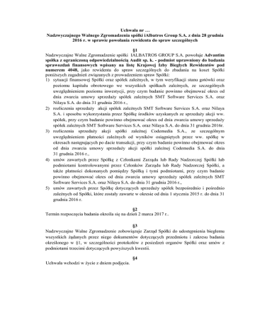 Uchwała nr … Nadzwyczajnego Walnego Zgromadzenia spółki iAlbatros Group S.A. z dnia 28 grudnia 2016 r. w sprawie powołania rewidenta do spraw szczególnych §1 Nadzwyczajne Walne Zgromadzenie spółki IALBATROS GROUP S.A. powołuje Advantim spółka z ograniczoną odpowiedzialnością Audit sp. k. - podmiot uprawniony do badania sprawozdań finansowych wpisany na listę Krajowej Izby Biegłych Rewidentów pod numerem 4048, jako rewidenta do spraw szczególnych do zbadania na koszt Spółki poniższych zagadnień związanych z prowadzeniem spraw Spółki: 1) sytuacji finansowej Spółki oraz spółek zależnych, w tym weryfikacji stanu gotówki oraz poziomu kapitału obrotowego we wszystkich spółkach zależnych, ze szczególnych uwzględnieniem poziomu inwestycji, przy czym badanie powinno obejmować okres od dnia zwarcia umowy sprzedaży spółek zależnych SMT Software Services S.A. oraz Nilaya S.A. do dnia 31 grudnia 2016 r., 2) rozliczenia sprzedaży akcji spółek zależnych SMT Software Services S.A. oraz Nilaya S.A. i sposobu wykorzystania przez Spółkę środków uzyskanych ze sprzedaży akcji ww. spółek, przy czym badanie powinno obejmować okres od dnia zwarcia umowy sprzedaży spółek zależnych SMT Software Services S.A. oraz Nilaya S.A. do dnia 31 grudnia 2016r. 3) rozliczenia sprzedaży akcji spółki zależnej Codemedia S.A., ze szczególnym uwzględnieniem płatności zależnych od wyników osiągniętych przez ww. spółkę w okresach następujących po dacie transakcji, przy czym badanie powinno obejmować okres od dnia zwarcia umowy sprzedaży akcji spółki zależnej Codemedia S.A. do dnia 31 grudnia 2016 r., 4) umów zawartych przez Spółkę z Członkami Zarządu lub Rady Nadzorczej Spółki lub podmiotami kontrolowanymi przez Członków Zarządu lub Rady Nadzorczej Spółki, a także płatności dokonanych pomiędzy Spółką i tymi podmiotami, przy czym badanie powinno obejmować okres od dnia zwarcia umowy sprzedaży spółek zależnych SMT Software Services S.A. oraz Nilaya S.A. do dnia 31 grudnia 2016 r., 5) umów zawartych przez Spółkę dotyczących sprzedaży spółek bezpośrednio i pośrednio zależnych od Spółki, które zostały zawarte w okresie od dnia 1 stycznia 2015 r. do dnia 31 grudnia 2016 r. §2 Termin rozpoczęcia badania określa się na dzień 2 marca 2017 r.. §3 Nadzwyczajne Walne Zgromadzenie zobowiązuje Zarząd Spółki do udostępnienia biegłemu wszystkich żądanych przez niego dokumentów dotyczących przedmiotu i zakresu badania określonego w §1, w szczególności protokołów z posiedzeń organów Spółki oraz umów z podmiotami trzecimi dotyczących powyższych kwestii. §4 Uchwała wchodzi w życie z dniem podjęcia.