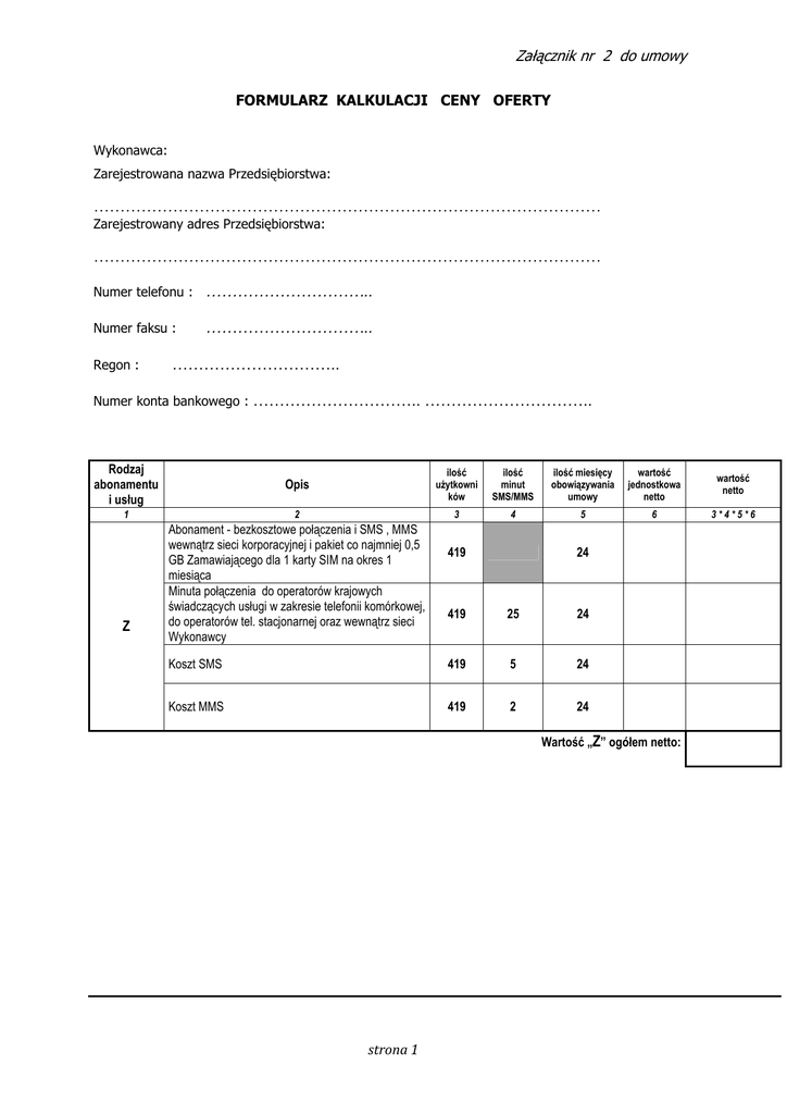 Załącznik nr 2 do umowy FORMULARZ KALKULACJI CENY OFERTY Wykonawca: Zarejestrowana nazwa Przedsiębiorstwa: …………………………………………………………………………………… Zarejestrowany adres Przedsiębiorstwa: …………………………………………………………………………………… Numer telefonu : ………………………….. Numer faksu : ………………………….. Regon : ………………………….. Numer konta bankowego : Rodzaj abonamentu i usług 1 Z ………………………….. ………………………….. Opis ilość użytkowni ków ilość minut SMS/MMS ilość miesięcy obowiązywania umowy wartość jednostkowa netto wartość netto 2 3 4 5 6 3*4*5*6 Abonament - bezkosztowe połączenia i SMS , MMS wewnątrz sieci korporacyjnej i pakiet co najmniej 0,5 GB Zamawiającego dla 1 karty SIM na okres 1 miesiąca Minuta połączenia do operatorów krajowych świadczących usługi w zakresie telefonii komórkowej, do operatorów tel. stacjonarnej oraz wewnątrz sieci Wykonawcy 24 419 419 25 24 Koszt SMS 419 5 24 Koszt MMS 419 2 24 Wartość „Z” ogółem netto: strona 1 Załącznik nr 2 do umowy Rodzaj abonamentu i usług 1 P Opis ilość użytkowni ków ilość minut SMS/MMS ilość miesięcy obowiązywania umowy wartość jednostkowa netto wartość netto 2 3 4 5 6 3*4*5*6 Cena abonamentu - pakietu kwotowego przeliczonego na usługi (zawierający minimum 40 min. do wszystkich operatorów krajowych i pakiet co najmniej 2 GB) oraz bezpłatne połączenia i SMS, MMS wewnątrz sieci korporacyjnej Zamawiającego za usługę dla 1 karty SIM na okres 1 miesiąca Minuta połączenia poza pakietem kwotowym, do operatorów krajowych świadczących usługi w zakresie telefonii komórkowej, do operatorów tel. stacjonarnej oraz wewnątrz sieci Wykonawcy 232 24 232 25 24 Koszt SMS poza pakietem kwotowym 232 5 24 Koszt MMS poza pakietem kwotowym 232 2 24 Cena telefonu oznaczonego literą P 150 Wartość „P” ogółem netto: Rodzaj abonamentu i usług Opis ilość użytkowni ków ilość minut SMS/MMS ilość miesięcy obowiązywania umowy wartość jednostkowa netto 1 2 3 4 5 6 K1 Cena abonamentu - pakietu kwotowego przeliczonego na usługi (zawierający minimum 160 min. do wszystkich operatorów krajowych i pakiet co najmniej 5 GB) oraz bezpłatne połączenia i SMS, MMS wewnątrz sieci korporacyjnej Zamawiającego za usługę dla 1 karty SIM na okres 1 miesiąca Minuta połączenia poza pakietem kwotowym, do operatorów krajowych świadczących usługi w zakresie telefonii komórkowej, do operatorów tel. stacjonarnej oraz wewnątrz sieci Wykonawcy 80 24 80 160 24 Koszt SMS poza pakietem kwotowym 80 30 24 Koszt MMS poza pakietem kwotowym 80 5 24 Cena telefonu oznaczonego literą K1 80 Wartość „K1” ogółem netto: strona 2 Załącznik nr 2 do umowy Rodzaj abonamentu i usług 1 K2 Opis ilość użytkowni ków ilość minut SMS/MMS ilość miesięcy obowiązywania umowy wartość jednostkowa netto wartość netto 2 3 4 5 6 3*4*5*6 Cena abonamentu - pakietu kwotowego przeliczonego na usługi (zawierający minimum 220 min. do wszystkich operatorów krajowych i pakiet co najmniej 10GB) oraz bezpłatne połączenia i SMS, MMS wewnątrz sieci korporacyjnej Zamawiającego za usługę dla 1 karty SIM na okres 1 miesiąca Minuta połączenia poza pakietem kwotowym, do operatorów krajowych świadczących usługi w zakresie telefonii komórkowej, do operatorów tel. stacjonarnej oraz wewnątrz sieci Wykonawcy 6 24 6 300 24 Koszt SMS poza pakietem kwotowym 6 50 24 Koszt MMS poza pakietem kwotowym 6 10 24 Cena telefonu oznaczonego literą K2 6 Wartość „K2” ogółem netto: Rodzaj abonamentu i usług 1 TT Opis ilość użytkowni ków ilość minut SMS/MMS ilość miesięcy obowiązywania umowy wartość jednostkowa netto wartość netto 2 3 4 5 6 3*4*5*6 Cena abonamentu - pakietu kwotowego przeliczona na usługi (zawierający minimum 10 min. do wszystkich operatorów krajowych z pakietem co najmniej 5 GB po jego wykorzystaniu możliwość korzystania z Internetu przy możliwej zwolnionej prędkości) z możliwą transmisją LTE, oraz bezpłatne połączenia i SMS, MMS wewnątrz sieci korporacyjnej Zamawiającego za usługę dla 1 karty SIM na okres 1 miesiąca. Minuta połączenia poza pakietem kwotowym, do operatorów krajowych świadczących usługi w zakresie telefonii komórkowej, do operatorów tel. stacjonarnej oraz wewnątrz sieci Wykonawcy 36 24 36 10 24 Koszt SMS poza abonamentem 36 10 24 Koszt MMS poza abonamentem 36 10 24 Wartość „TT” ogółem netto: strona 3 Załącznik nr 2 do umowy Rodzaj abonamentu i usług 1 TM Opis ilość użytkowni ków ilość minut SMS/MMS ilość miesięcy obowiązywania umowy wartość jednostkowa netto wartość netto 4 5 6 3*4*5*6 2 3 Cena abonamentu - pakietu kwotowego przeliczonego na usługi (zawierający minimum 100 SMS/MMS do wszystkich operatorów krajowych i pakiet co najmniej 50GB) oraz bezpłatne połączenia i SMS, MMS wewnątrz sieci korporacyjnej Zamawiającego za usługę dla 1 karty SIM na okres 1 miesiąca 8 Koszt SMS poza abonamentem 8 10 24 Koszt MMS poza abonamentem 8 10 24 Cena urządzenia oznaczonego literą TM 8 24 Wartość „TM” ogółem netto: Rodzaj abonamentu i usług 1 C Opis ilość użytkowni ków ilość minut SMS/MMS ilość miesięcy obowiązywania umowy wartość jednostkowa netto wartość netto 2 3 4 5 6 3*4*5*6 Cena abonamentu - pakietu kwotowego przeliczonego na usługi (zawierający minimum 180 min. do wszystkich operatorów krajowych) oraz bezpłatne połączenia i SMS wewnątrz sieci korporacyjnej Zamawiającego za usługę dla 1 karty SIM na okres 1 miesiąca Minuta połączenia poza pakietem kwotowym, do operatorów krajowych świadczących usługi w zakresie telefonii komórkowej, do operatorów tel. stacjonarnej oraz wewnątrz sieci Wykonawcy 30 24 30 300 24 Koszt SMS poza pakietem kwotowym 30 1 24 Koszt MMS poza pa