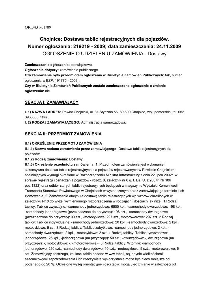 OR.3431-31/09 Chojnice: Dostawa tablic rejestracyjnych dla pojazdów. Numer ogłoszenia: 219219 - 2009; data zamieszczenia: 24.11.2009 OGŁOSZENIE O UDZIELENIU ZAMÓWIENIA - Dostawy Zamieszczanie ogłoszenia: obowiązkowe. Ogłoszenie dotyczy: zamówienia publicznego. Czy zamówienie było przedmiotem ogłoszenia w Biuletynie Zamówień Publicznych: tak, numer ogłoszenia w BZP: 191775 - 2009r. Czy w Biuletynie Zamówień Publicznych zostało zamieszczone ogłoszenie o zmianie ogłoszenia: nie. SEKCJA I: ZAMAWIAJĄCY I. 1) NAZWA I ADRES: Powiat Chojnicki, ul. 31 Stycznia 56, 89-600 Chojnice, woj. pomorskie, tel. 052 3966533, faks . I. 2) RODZAJ ZAMAWIAJĄCEGO: Administracja samorządowa. SEKCJA II: PRZEDMIOT ZAMÓWIENIA II.1) OKREŚLENIE PRZEDMOTU ZAMÓWIENIA II.1.1) Nazwa nadana zamówieniu przez zamawiającego: Dostawa tablic rejestracyjnych dla pojazdów.. II.1.2) Rodzaj zamówienia: Dostawy. II.1.3) Określenie przedmiotu zamówienia: 1. Przedmiotem zamówienia jest wykonanie i sukcesywna dostawa tablic rejestracyjnych dla pojazdów rejestrowanych w Powiecie Chojnickim, spełniających wymogi określone w Rozporządzeniu Ministra Infrastruktury z dnia 22 lipca 2002r. w sprawie rejestracji i oznaczania pojazdów - rozdz. 3, załącznik nr 8 (j. t. Dz. U. z 2007r. Nr 186 poz.1322) oraz odbiór starych tablic rejestracyjnych będących w magazynie Wydziału Komunikacji i Transportu Starostwa Powiatowego w Chojnicach w wyznaczonym przez zamawiającego terminie i ich złomowanie. 2. Zamówienie obejmuje dostawę tablic rejestracyjnych wg wzorów określonych w załączniku Nr 8 do wyŜej wymienionego rozporządzenia w rodzajach i ilościach jak niŜej: 1.Rodzaj tablicy: Tablice zwyczajne: -samochody jednorzędowe: 6500 kpl., -samochody dwurzędowe: 198 kpl., -samochody jednorzędowe (przeznaczone do przyczep): 198 szt., -samochody dwurzędowe (przeznaczone do przyczep): 99 szt., -motocyklowe: 297 szt., motorowerowe: 297 szt. 2.Rodzaj tablicy: Tablice indywidualne: -samochody jednorzędowe: 20 kpl., -samochody dwurzędowe: 2 kpl., motocyklowe: 5 szt. 3.Rodzaj tablicy: Tablice zabytkowe: -samochody jednorzędowe: 2 kpl., samochody dwurzędowe: 2 kpl., -motocyklowe: 2 szt. 4.Rodzaj tablicy: Tablice tymczasowe: jednorzędowe: 25 kpl., -jednorzędowa (na przyczepy): 50 szt., -dwurzędowe: -, dwurzędowa (na przyczepy): -, motocyklowe: -, -motorowerowe:-, 5.Rodzaj tablicy: Wtórniki: -samochody jednorzędowe: 250 szt., -samochody dwurzędowe: 10 szt., -motocyklowe: 5 szt., -motorowerowe: 5 szt. Zamawiający zastrzega, Ŝe ilości tablic podane w w/w tabeli, są jedynie wielkościami szacunkowymi zapotrzebowania i ich rzeczywiste wykorzystanie moŜe być nieco mniejsze od podanego do 20 %. Określone wyŜej orientacyjne ilości tablic mogą ulec zmianie w zaleŜności od ilości rejestrowanych pojazdów. Zamawiający wymaga, aby wzory i jakość dostarczanych tablic była zgodna z obowiązującymi w danej chwili przepisami prawa. 3. Koszty dostawy zamówionych tablic rejestracyjnych oraz koszty odbioru i złomowania starych tablic (w terminach wskazanych przez zamawiającego) ponosi wykonawca. Wykonawca dostarczy zamawiającemu, na własny koszt, na czas trwania umowy, pojemniki (skrzynie itp.) wielokrotnego uŜytku do składowania wycofanych tablic rejestracyjnych w magazynie zamawiającego. Wykonawca zobowiązany jest do przekazania zamawiającemu dokumentu (protokołu) potwierdzającego kaŜdorazowo złomowanie (kasację) starych tablic rejestracyjnych. 4. Tablice muszą być dodatkowo pokryte folią zabezpieczającą przed zniszczeniem. 5. Gwarancja minimum 24 miesiące... II.1.4) Wspólny Słownik Zamówień (CPV): 44.31.64.00-2. II.1.5) Całkowita końcowa wartość zamówienia (bez VAT) obejmująca wszystkie zamówienia i części: 277714.04 PLN. SEKCJA IV: PROCEDURA IV.1) TRYB UDZIELENIA ZAMÓWIENIA: Przetarg nieograniczony IV.2) INFORMACJE ADMINISTRACYJNE Zamówienie dotyczy projektu/programu finansowanego ze środków Unii Europejskiej: • nie SEKCJA V: UDZIELENIE ZAMÓWIENIA V.1) DATA UDZIELENIA ZAMÓWIENIA: 23.11.2009. V.2) LICZBA OTRZYMANYCH OFERT: 1. V.3) NAZWA I ADRES WYKONAWCY, KTÓREMU UDZIELONO ZAMÓWIENIA: • ALKO Zakład Produkcyjno-Usługowy, ul. J. Tuwima 23, 76-200 Słupsk,, kraj/woj. pomorskie. V.4) INFORMACJA O CENIE WYBRANEJ OFERTY ORAZ O NIE PODLEGAJĄCYCH ODRZUCENIU OFERTACH Z NAJNIśSZĄ I NAJWYśSZĄ CENĄ (bez VAT) • Cena wybranej oferty: 277714.04 • • Oferta z najniŜszą ceną: 277714.04 oferta z najwyŜszą ceną: 277714.04 Waluta: PLN. Wywieszono na tablicy ogłoszeń i w BZP w dniu 24.11.2009 r. Zdjęto z tablicy w dniu Ł.A.