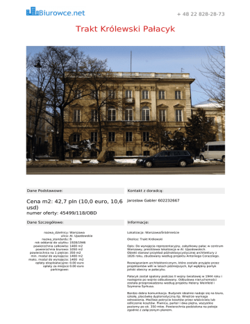 + 48 22 828-28-73 Trakt Królewski Pałacyk Dane Podstawowe: Kontakt z doradcą: Cena m2: 42,7 pln (10,0 euro, 10,6 usd) Jarosław Gabler 602232667 numer oferty: 45499/118/OBD Dane Szczegółowe: nazwa_dzielnicy: Warszawa ulica: Al. Ujazdowskie nazwa_standardu: B rok oddania do użytku: 1928/1946 powierzchnia całkowita: 1400 m2 powierzchnia biurowa: 1050 m2 powierzchnia na 1 piętrze: 350 m2 min. moduł do wynajęcia: 1400 m2 maks. moduł do wynajęcia: 1400 m2 opłaty eksploatacyjne: 0.00 euro opłaty za miejsce 0.00 euro parkingowe: Informacje: Lokalizacja: Warszawa/Śródmieście Okolice: Trakt Królewski Opis: Do wynajęcia reprezentacyjny, zabytkowy pałac w centrum Warszawy, prestiżowa lokalizacja w Al. Ujazdowskich. Obiekt stanowi przykład późnoklasycystycznej architektury z 1826 roku, zbudowany według projektu Antoniego Corazziego. Rozwiązaniem architektonicznym, które zostało przyjęte przez projektantów willi w latach późniejszych, był wgłębny portyk joński obecny w pałacyku. Pałacyk został spalony podczas II wojny światowej w 1944 roku i następnie po wojnie odbudowany. Odbudowa nieruchomości została przeprowadzona według projektu Heleny Weinfeld i Szymona Syrkusa. Bardzo dobra komunikacja. Budynek idealnie nadaje się na biuro, szkołę, placówkę dyplomatyczną itp. Wnętrze wymaga odnowienia. Możliwe pokrycie kosztów przez właściciela lub odliczenie kosztów. Piwnica, parter i dwa piętra, wszystkie poziomy po ok. 350 mkw. Powierzchnia podzielona na pokoje zgodnie z załączonym planem. Rodzaj transakcji: wynajem Rodzaj budynku: biurowiec Liczba pięter: 2 Powierzchnia: min. 1400, max. 1400 m2 Czynsz najmu: 14000 EUR Czynsz najmu za 1 m2: 10 EUR Minimalny okres najmu: 3 lat biurowce.net Adres:ul. Konduktorska 4 lok. 30, Warszawa, [email protected]