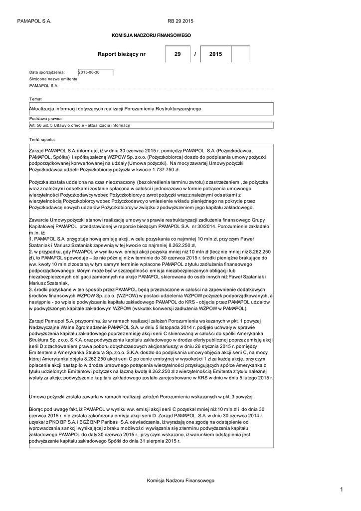 PAMAPOL S.A. RB 29 2015 KOMISJA NADZORU FINANSOWEGO Raport bieżący nr Data sporządzenia: 29 / 2015 2015-06-30 Skróc ona nazwa emitenta PAMAPOL S.A. Temat Aktualizacja informacji dotyczących realizacji Porozumienia Restrukturyzacyjnego Podstawa prawna Art. 56 ust. 5 Ustawy o ofercie - aktualizac ja informacji Treść raportu: Zarząd PAMAPOL S.A. informuje, iż w dniu 30 czerwca 2015 r. pomiędzy PAMAPOL S.A. (Pożyczkodawca, PAMAPOL, Spółka) i spółką zależną WZPOW Sp. z o.o. (Pożyczkobiorca) doszło do podpisania umowy pożyczki podporządkowanej konwertowanej na udziały (Umowa pożyczki). Na mocy zawartej Umowy pożyczki Pożyczkodawca udzielił Pożyczkobiorcy pożyczki w kwocie 1.737.750 zł. Pożyczka została udzielona na czas nieoznaczony (bez określenia terminu zwrotu) z zastrzeżeniem , że pożyczka wraz z należnymi odsetkami zostanie spłacona w całości i jednorazowo w formie potrącenia umownego wierzytelności Pożyczkodawcy wobec Pożyczkobiorcy o zwrot pożyczki wraz z należnymi odsetkami z wierzytelnością Pożyczkobiorcy wobec Pożyczkodawcy o wniesienie wkładu pieniężnego na pokrycie przez Pożyczkodawcę nowych udziałów Pożyczkobiorcy w związku z podwyższeniem jego kapitału zakładowego. Zawarcie Umowy pożyczki stanowi realizację umowy w sprawie restrukturyzacji zadłużenia finansowego Grupy Kapitałowej PAMAPOL przedstawionej w raporcie bieżącym PAMAPOL S.A. nr 30/2014. Porozumienie zakładało m.in. iż: 1. PAMAPOL S.A. przygotuje nową emisję akcji, w celu pozyskania co najmniej 10 mln zł, przy czym Paweł Szataniak i Mariusz Szataniak zapewnią w tej kwocie co najmniej 8.262.250 zł, 2. w przypadku, gdy PAMAPOL w wyniku ww. emisji akcji pozyska mniej niż 10 mln zł (lecz nie mniej niż 8.262.250 zł), to PAMAPOL spowoduje – że nie później niż w terminie do 30 czerwca 2015 r. środki pieniężne brakujące do ww. kwoty 10 mln zł zostaną w tym samym terminie wpłacone PAMAPOL z tytułu zadłużenia finansowego podporządkowanego, którym może być w szczególności emisja niezabezpieczonych obligacji lub niezabezpieczonych obligacji zamiennych na akcje PAMAPOL skierowana do osób innych niż Paweł Szataniak i Mariusz Szataniak, 3. środki pozyskane w ten sposób przez PAMAPOL będą przeznaczone w całości na zapewnienie dodatkowych środków finansowych WZPOW Sp. z o.o. (WZPOW) w postaci udzielenia WZPOW pożyczek podporządkowanych, a następnie - po wpisie podwyższenia kapitału zakładowego PAMAPOL do KRS - objęcia przez PAMAPOL udziałów w podwyższonym kapitale zakładowym WZPOW (wskutek konwersji zadłużenia WZPOW w PAMAPOL). Zarząd Pamapol S.A. przypomina, że w ramach realizacji założeń Porozumienia wskazanych w pkt. 1 powyżej Nadzwyczajne Walne Zgromadzenie PAMAPOL S.A. w dniu 5 listopada 2014 r. podjęło uchwały w sprawie podwyższenia kapitału zakładowego poprzez emisję akcji serii C skierowaną w całości do spółki Amerykanka Struktura Sp. z o.o. S.K.A. oraz podwyższenia kapitału zakładowego w drodze oferty publicznej poprzez emisję akcji serii D z zachowaniem prawa poboru dotychczasowych akcjonariuszy; w dniu 26 stycznia 2015 r. pomiędzy Emitentem a Amerykanka Struktura Sp. z o.o. S.K.A. doszło do podpisania umowy objęcia akcji serii C, na mocy której Amerykanka objęła 8.262.250 akcji serii C po cenie emisyjnej w wysokości 1 zł za każdą akcję, przy czym opłacenie akcji nastąpiło w drodze umownego potrącenia wierzytelności przysługujących spółce Amerykanka z tytułu udzielonych Emitentowi pożyczek na łączną kwotę 8.262.250 zł z wierzytelnością Emitenta z tytułu należnej wpłaty za akcje; podwyższenie kapitału zakładowego zostało zarejestrowane w KRS w dniu w dniu 5 lutego 2015 r. Umowa pożyczki została zawarta w ramach realizacji założeń Porozumienia wskazanych w pkt. 3 powyżej. Biorąc pod uwagę fakt, iż PAMAPOL w wyniku ww. emisji akcji serii C pozyskał mniej niż 10 mln zł i do dnia 30 czerwca 2015 r. nie została zakończona emisja akcji serii D Zarząd PAMAPOL S.A. w dniu 30 czerwca 2014 r. uzyskał z PKO BP S.A. i BGŻ BNP Paribas S.A. oświadczenia, iż wyrażają one zgodę na odstąpienie od wprowadzania sankcji wynikającej z braku możliwości wywiązania się z terminu podwyższenia kapitału zakładowego PAMAPOL do daty 30 czerwca 2015 r., przy czym wskazano, iż warunkiem odstąpienia jest podwyższenie kapitału zakładowego Spółki do dnia 31 sierpnia 2015 r. Komisja Nadzoru Finansowego 1 PAMAPOL S.A. RB 29 2015 PAMAPOL SPÓŁKA AKCYJNA (pełna nazwa emitenta) PAMAPOL S.A. Spożywc zy (spo) (skróc ona nazwa emitenta) 97-438 (sektor wg. klasyfikac ji GPW w W-wie) Rusiec (kod poc ztowy) (miejscowość) Wieluńska 2 (ulica) (numer) 043 6766020 043 6766887 (telefon) (fax) [email protected] www.pamapol.com.pl (e-mail) (www) 832-176-16-81 730365765 (NIP) (REGON) PODPISY OSÓB REPREZENTUJĄCYCH SPÓŁKĘ Data Imię i Nazwisko Stanowisko/Funkc ja Podpis 2015-06-30 Krzysztof Półgrabia Wic eprezes Zarządu Krzysztof Półgrabia Komisja Nadzoru Finansowego 2